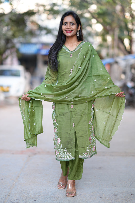 Mehendhi Green Color Festive Wear Mul Chanderi 3 Piece Set