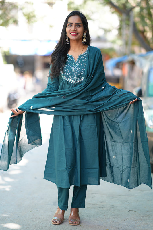 Teal Green Festive Wear 3 Piece Set in 92.5 Jaipur Cotton