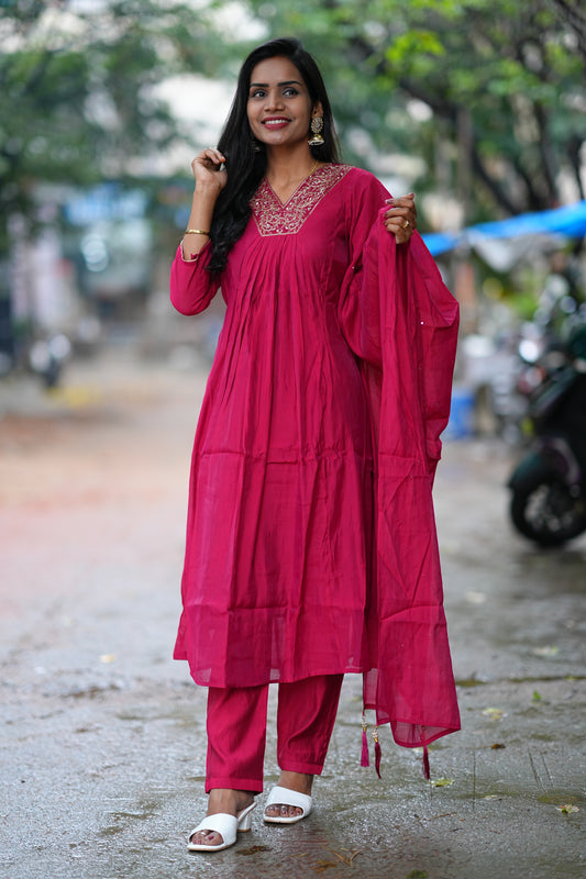 Rani Pink Color Jaipuri Cotton 3 Piece Set With Kantha Work and Complete Lining
