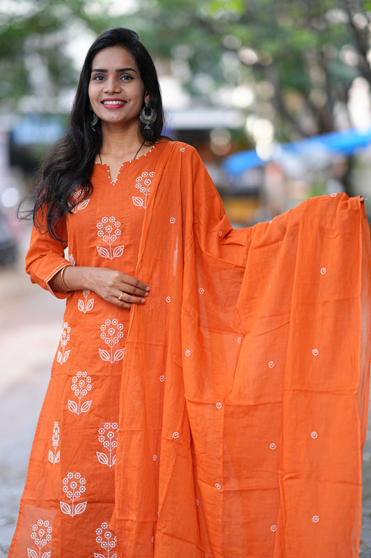 Orange Color Mul Cotton 3 Piece Set With Thread Work