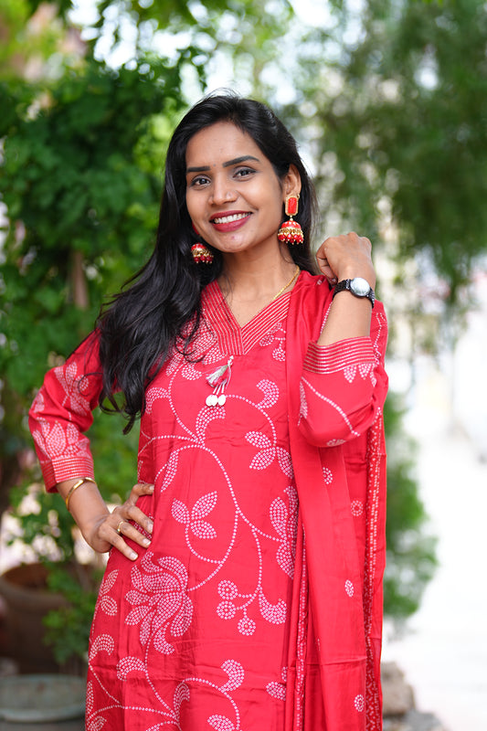 Red Viscose Chinon Silk 3 Piece Set With Complete Lining