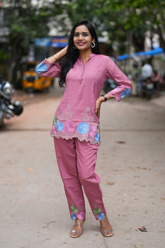 Light Maroon Color Designer Wear Mul Chanderi Cord Set