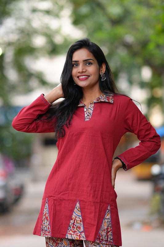 Red Color Kali Pattern Kalamkari Print Cord Set