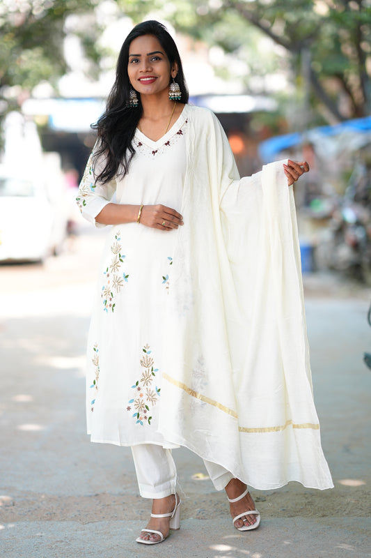 Cream Color Designer Wear Mul Chanderi 3 Piece Set With Zari Work Duppata