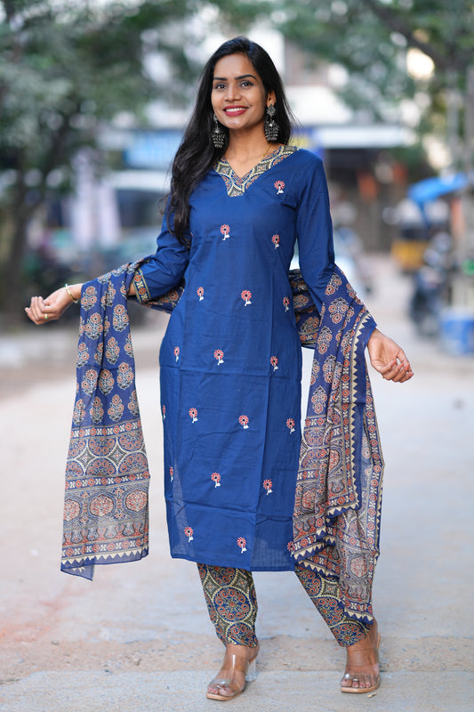 Blue Color Jaipur Cotton 3 Piece Set With Full Lining and Embroidery Work