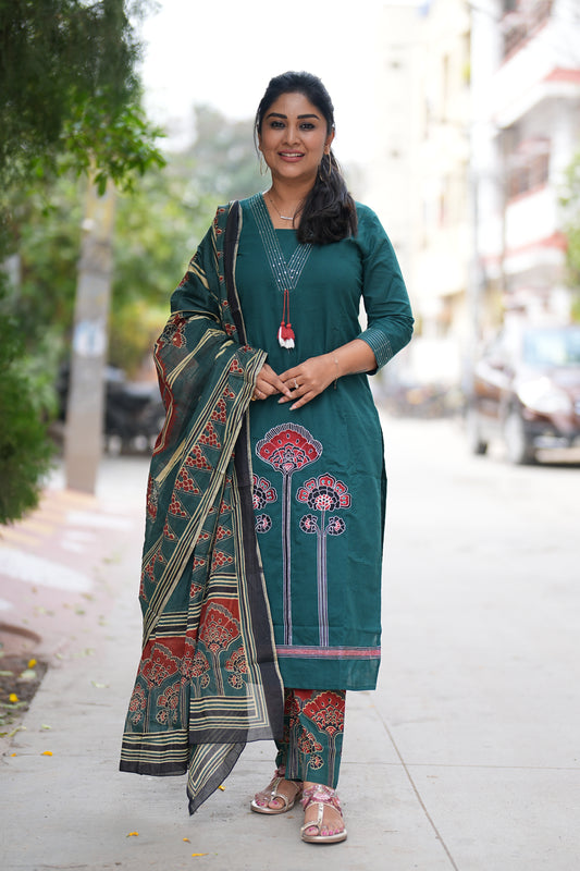 Bottle Green Color Pure Jaipur Cotton Semi Party Wear 3 Piece Set With Lining