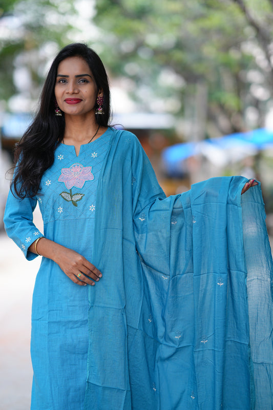 Sky Blue Color Pure Mull Cotton 3 piece set With Complete Lining