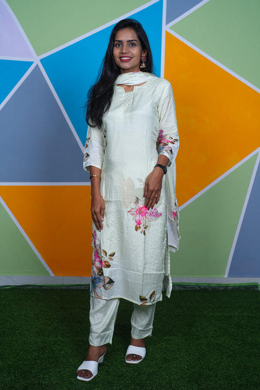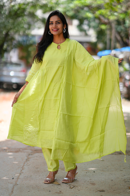 Parrot Green Colour Mul Chanderi 3 Piece Set With Complete Lining