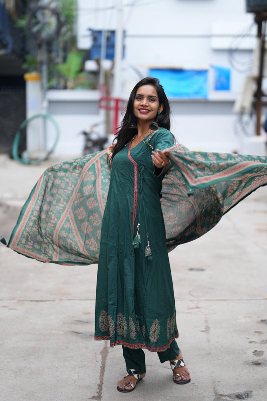 Dark Green Color Jaipur Cotton Anarkali 3 Piece Set With Complete Lining