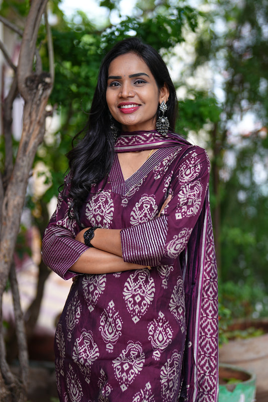 Wine Color Jaipur Cotton Office Wear 3 Piece Set With Complete Lining