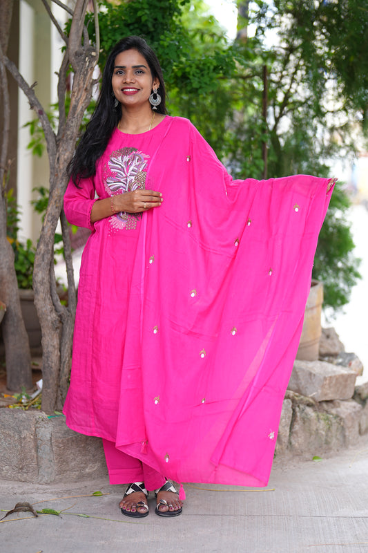 Rani Pink Color Pure Mul Cotton Embroidery Design 3 Piece Set With Complete Lining