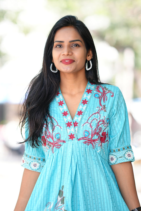 Sky Blue Viscose Party Wear Frock With Embroidery work