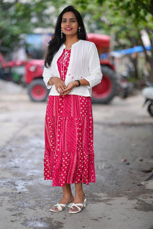 Red Color Rayon Frock With White Coat