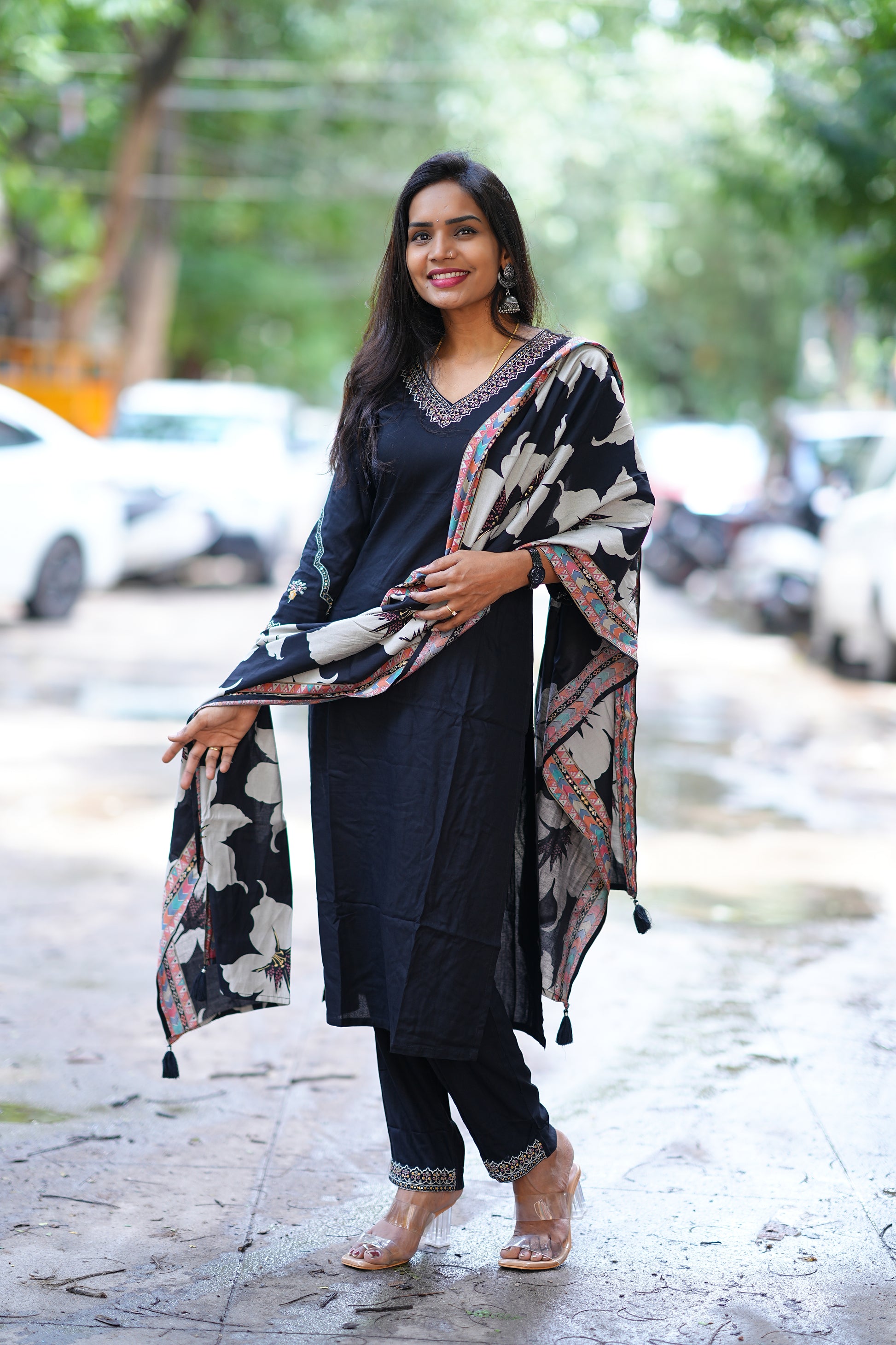 Elevate your wardrobe with this Black Color Designer 3 Piece Set, expertly crafted to combine style and comfort. Featuring a coordinated trio of pieces, this set offers versatility for various occasions, ensuring a polished and sophisticated look. The sleek black hue enhances its timeless appeal, making it a valuable addition to any fashion collection. Perfect for those who appreciate refined design and quality craftsmanship.
