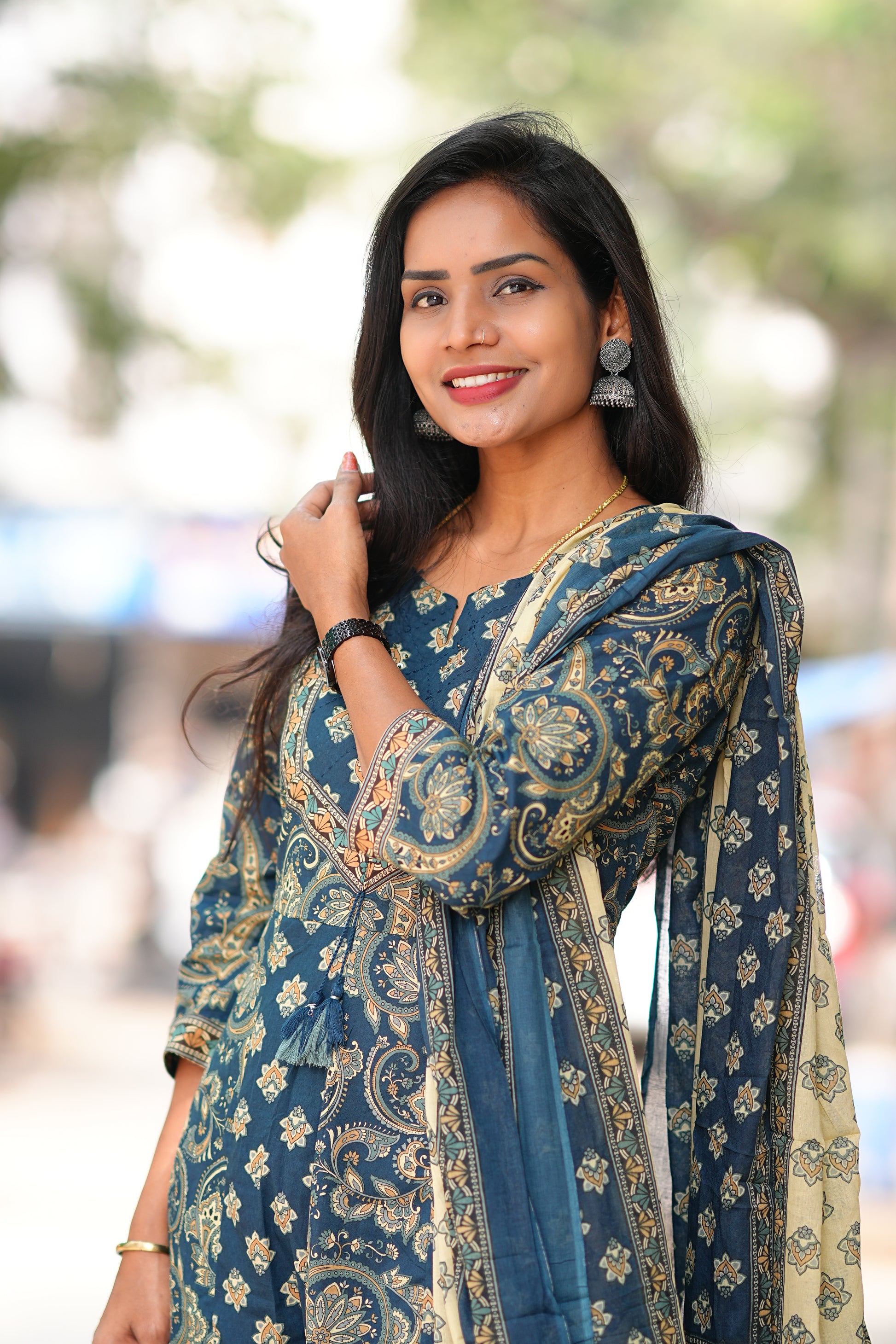 Blue Color Jaipur Cotton Anarkali 3 Piece Set