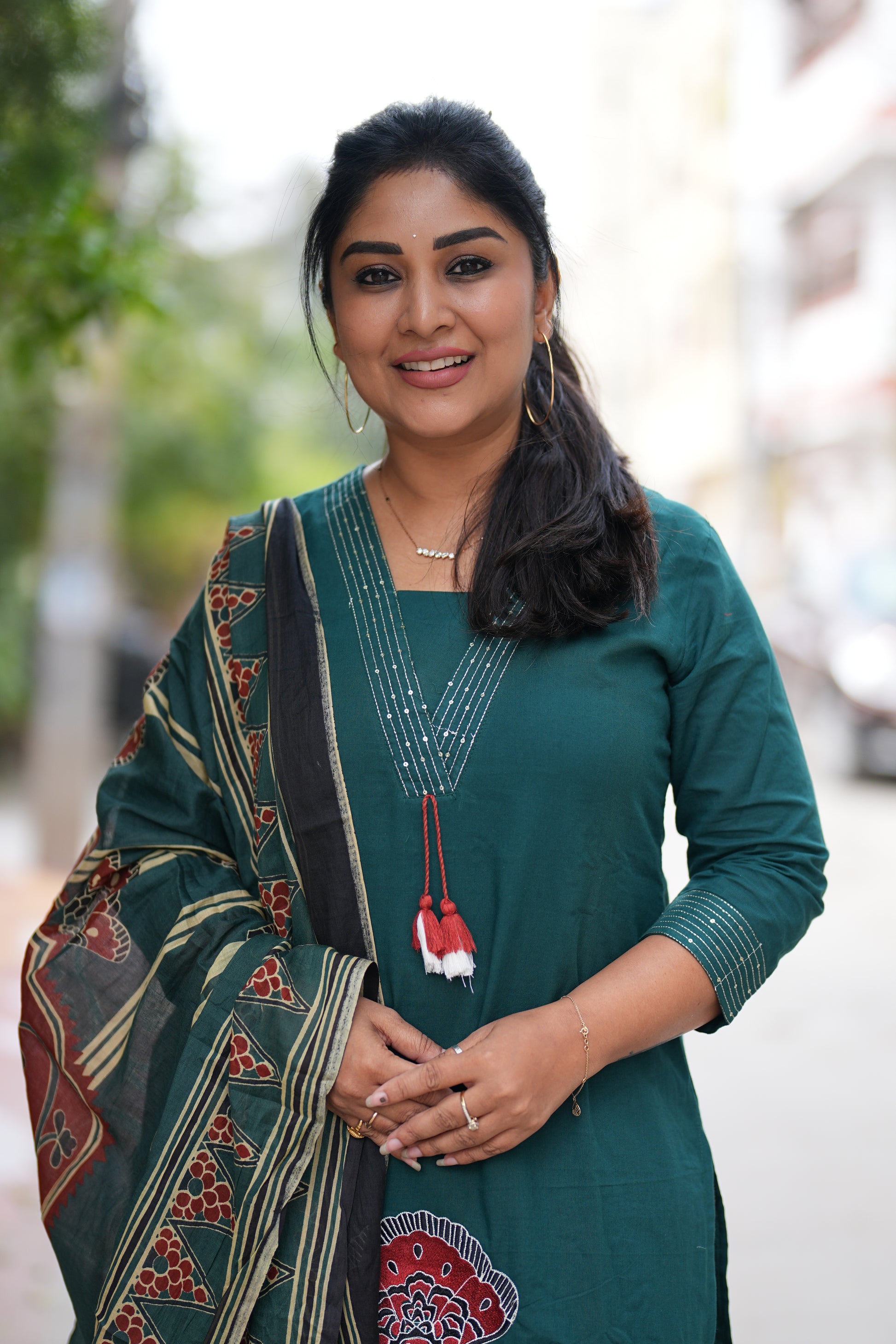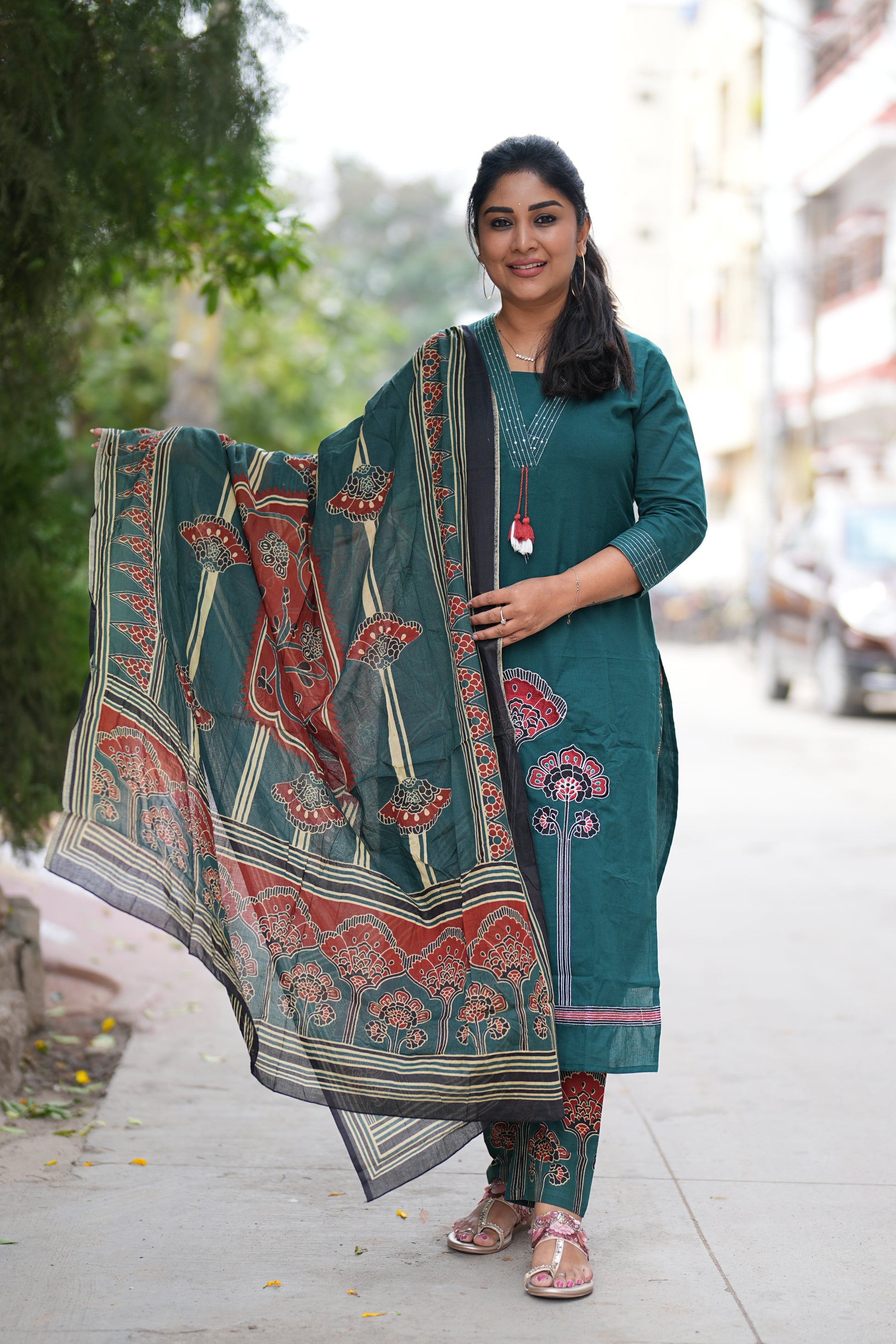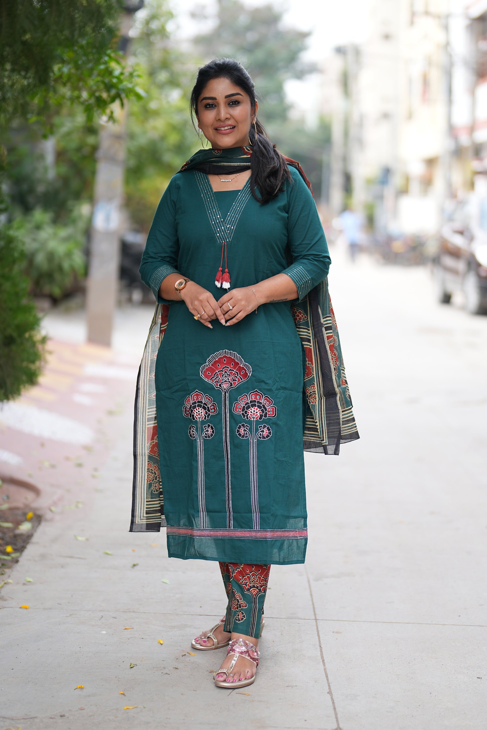 Elevate your semi-formal wardrobe with this sophisticated three-piece ensemble in rich bottle green. Crafted from pure Jaipur cotton, this set combines breathability with refined elegance, making it ideal for festive occasions and gatherings. The coordinated pieces feature premium lining for enhanced comfort and durability, ensuring a polished silhouette throughout the day. The timeless bottle green hue complements all skin tones while maintaining a versatile appeal. Perfect for those seeking quality craftsmanship with traditional textile heritage, this set delivers both style and substance for your special moments.