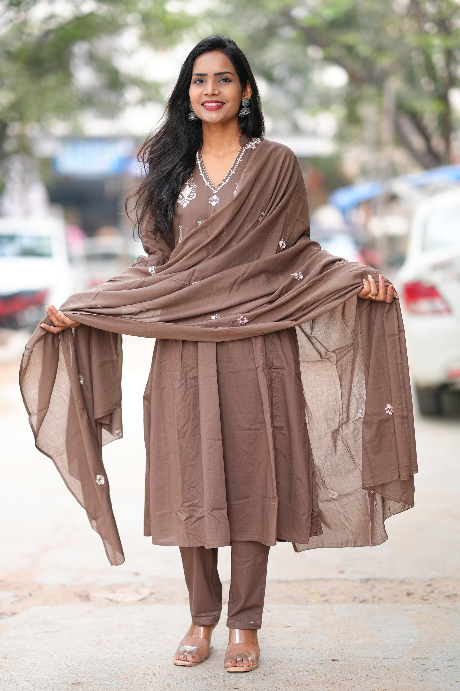 Elevate your ethnic wardrobe with this exquisite three-piece Jaipur cotton ensemble in rich brown. Crafted from pure 92.5% cotton, this A-line silhouette offers comfort and breathability for all-day wear. Intricate embroidery work adorns the set, adding timeless elegance and traditional charm. Perfect for festive occasions, celebrations, or everyday sophistication. The versatile brown tone pairs effortlessly with your existing collection while the premium cotton ensures durability and a soft, luxurious feel against the skin.