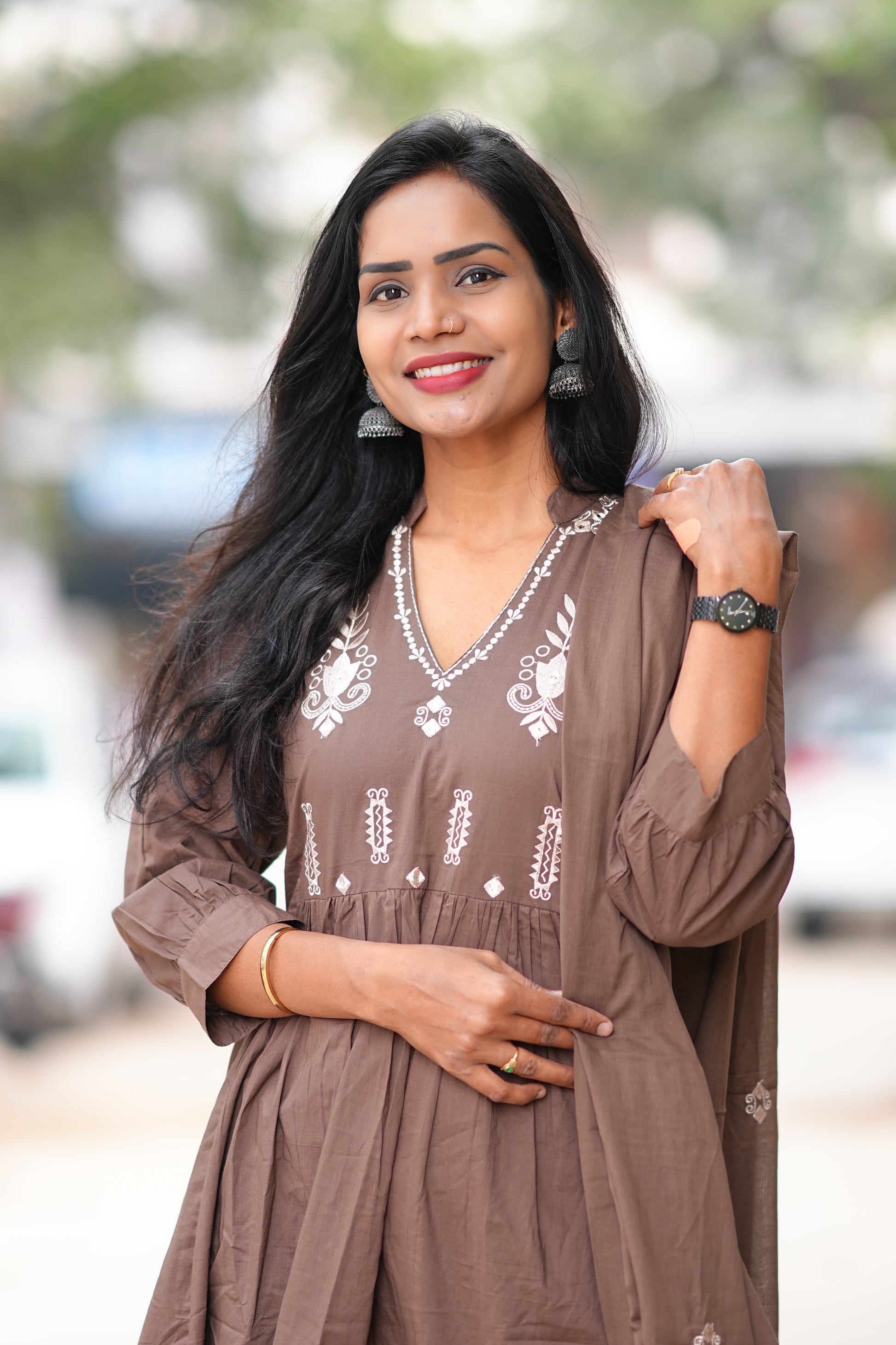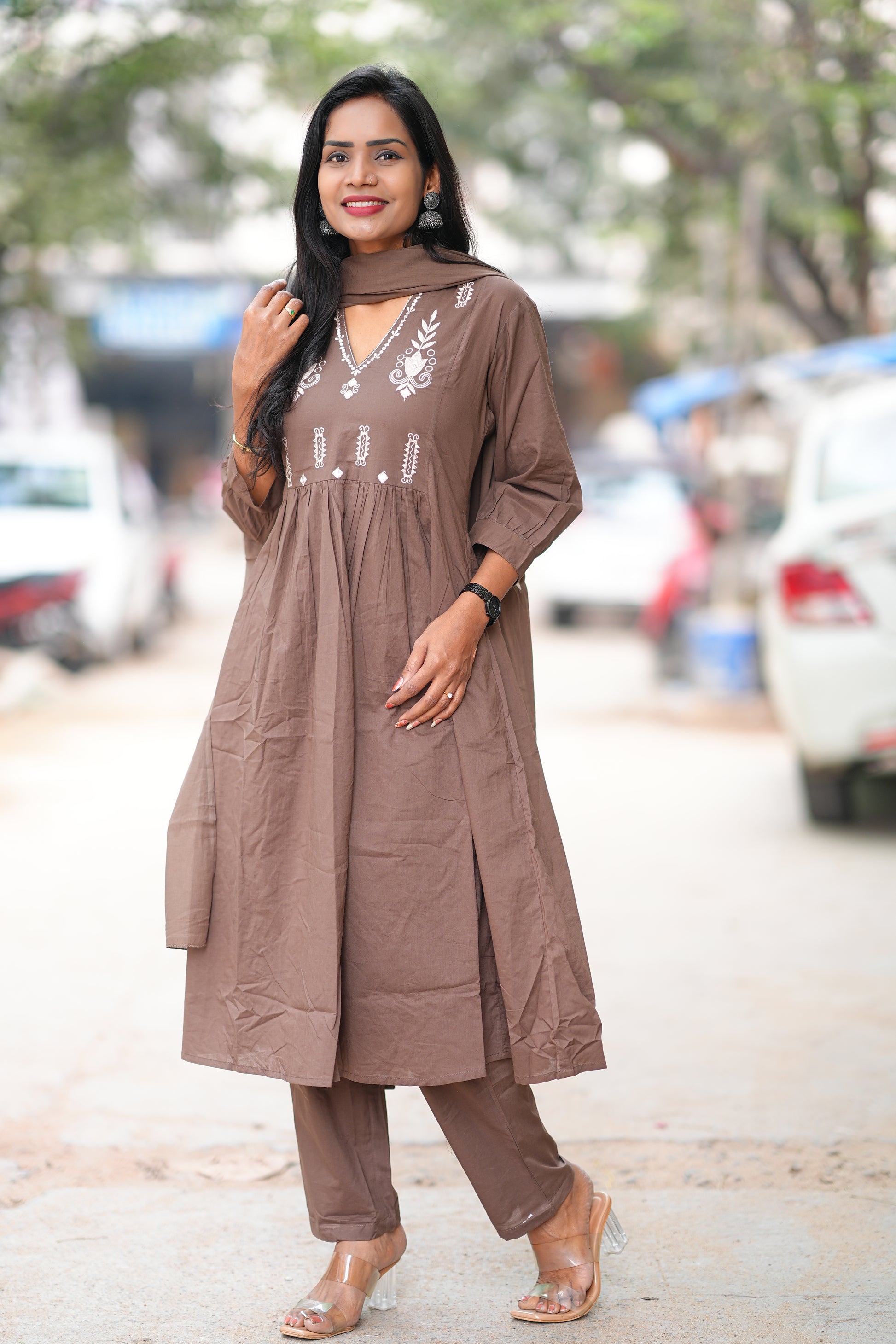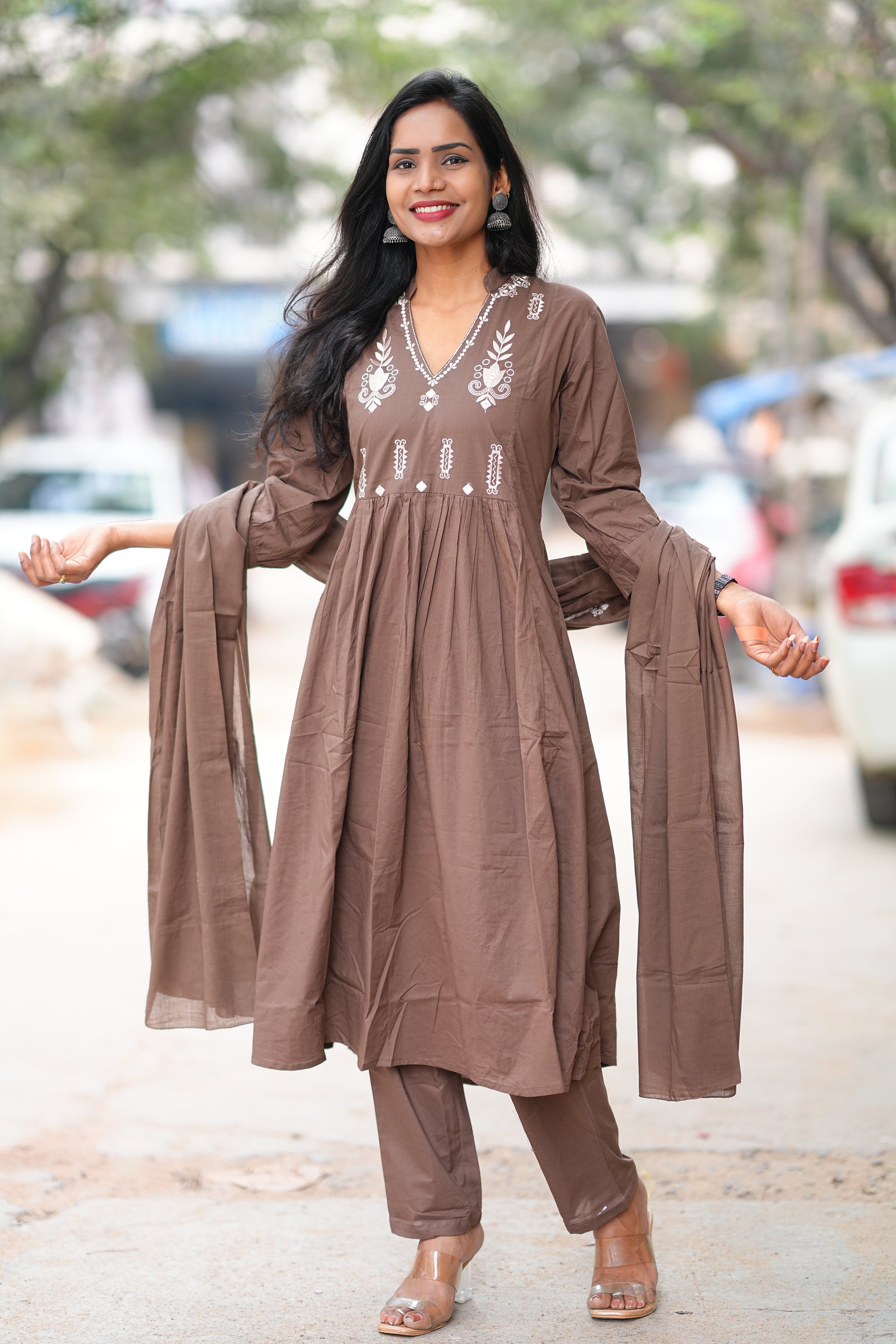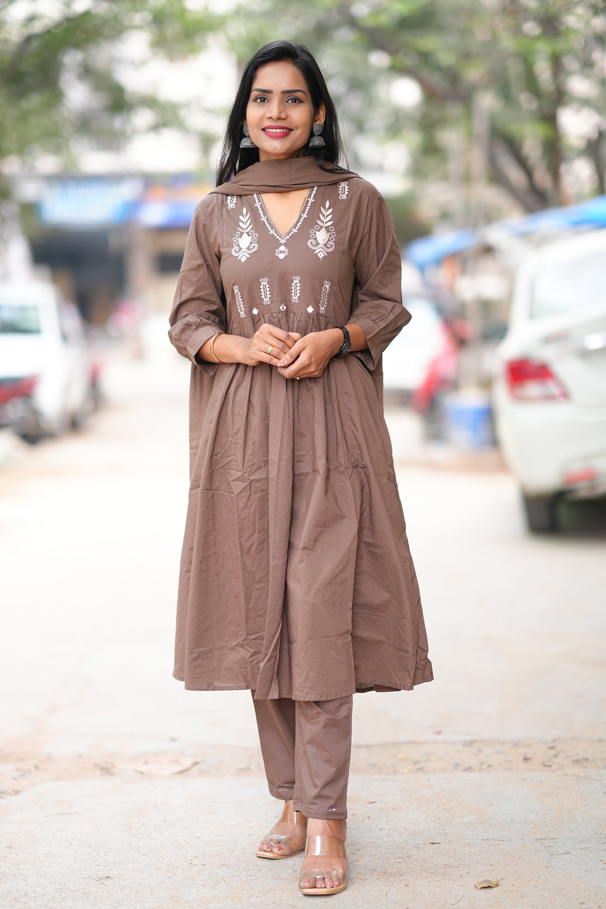 Brown Color Color Pure 92.5 Jaipur Cotton A line 3 Piece Set With Embroidery Work