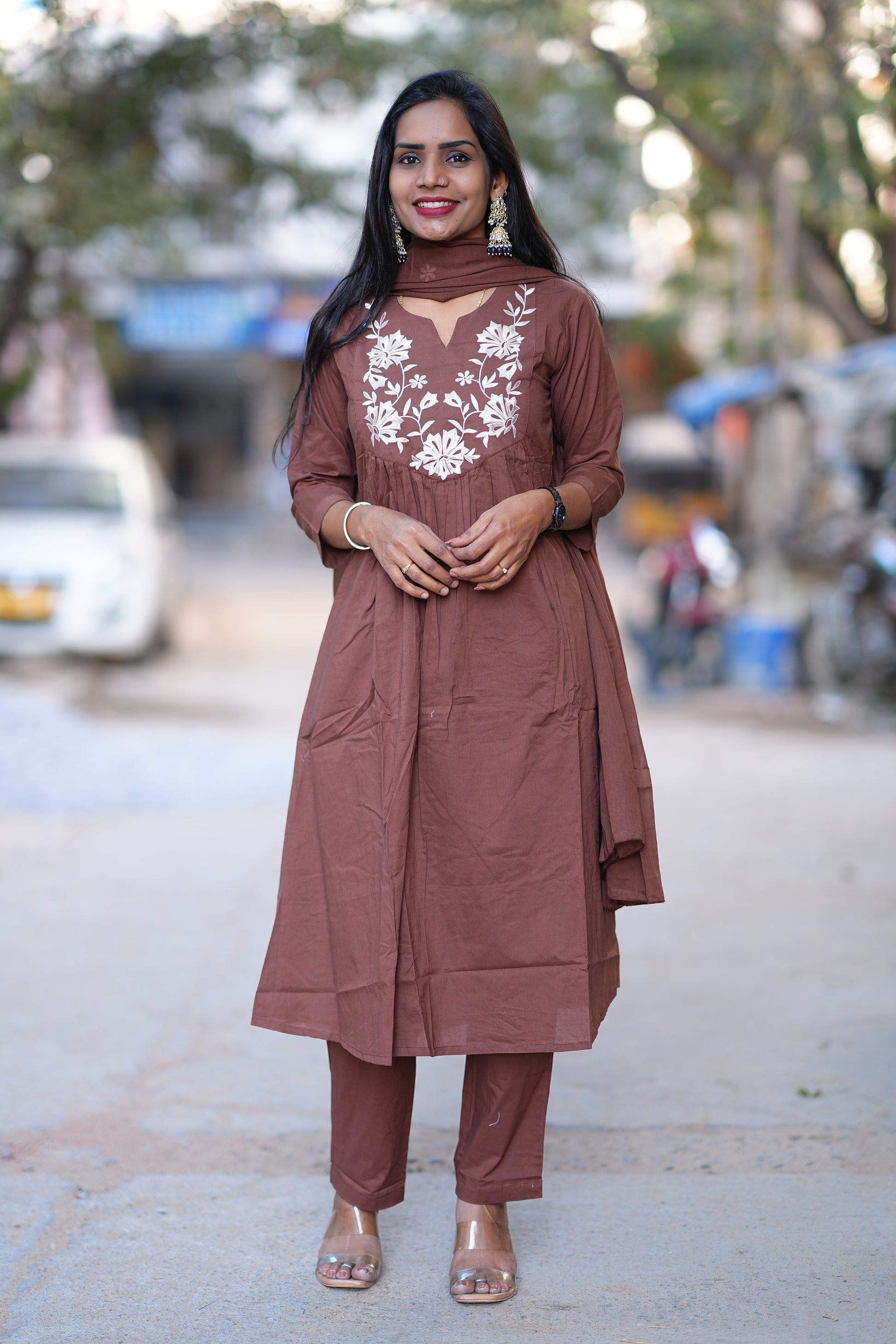 Brown Color Anarkali 3 Piece Set in 92.5 Jaipur Cotton With applique Work