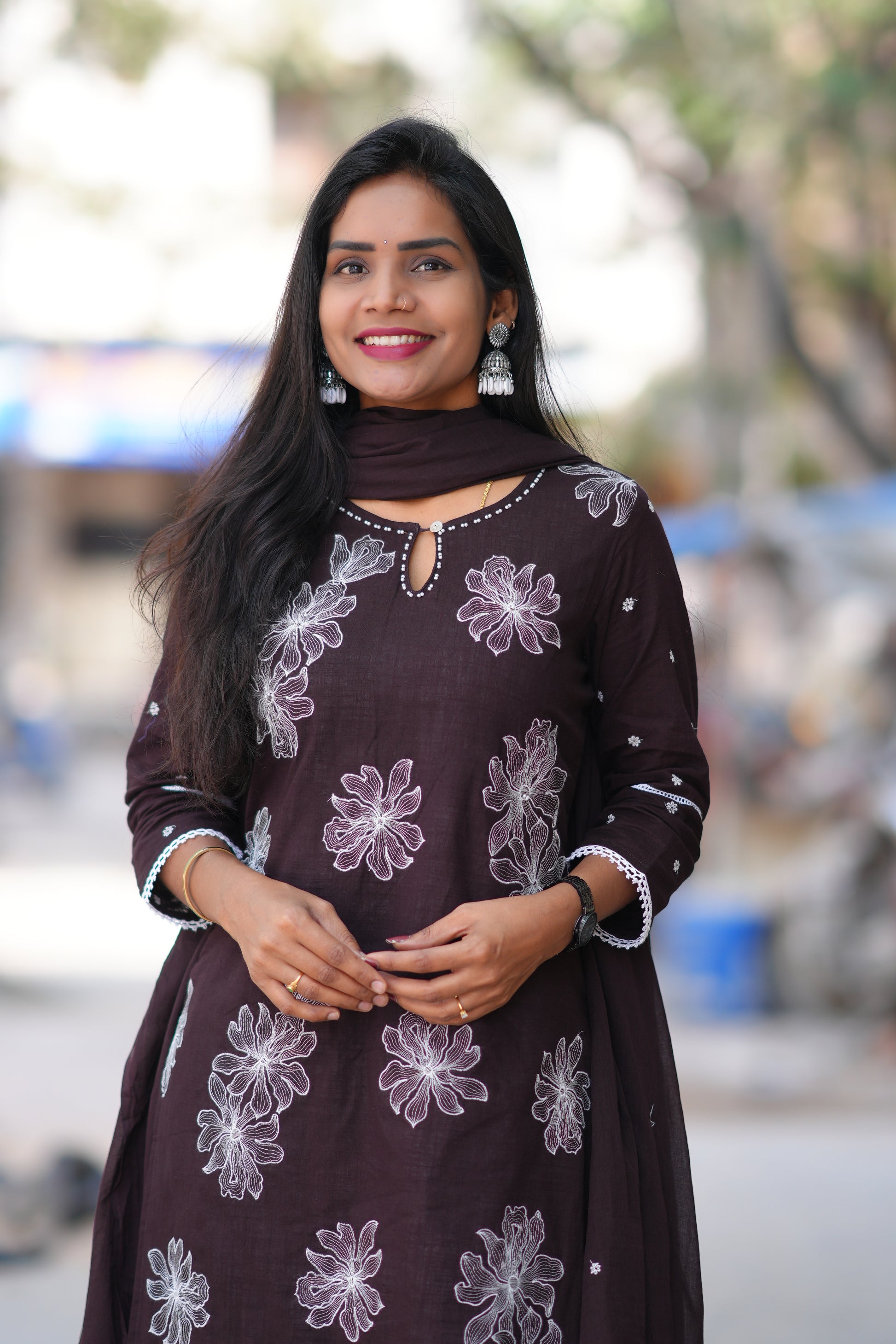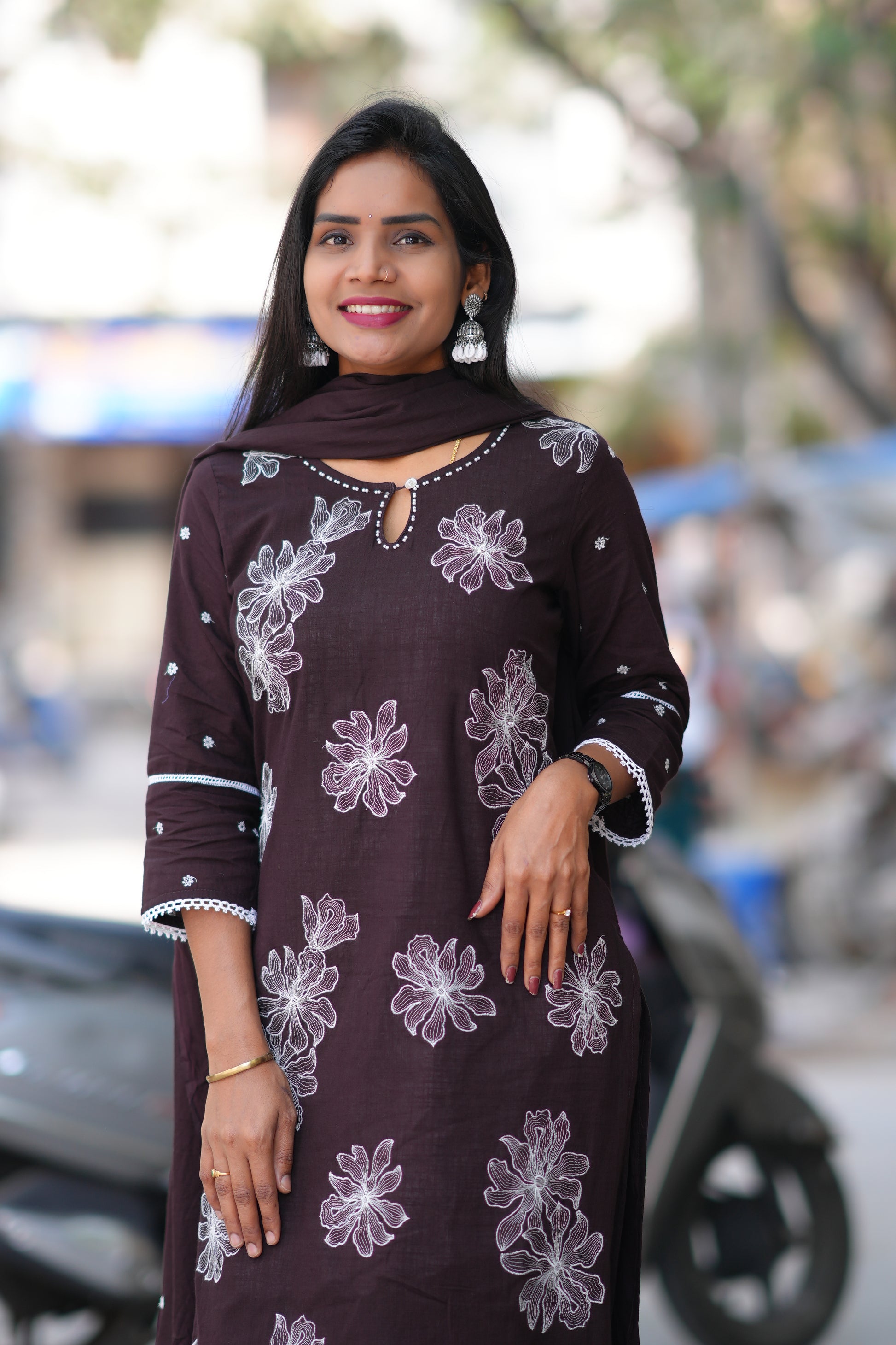 Brown Color Jaipur Cotton 3 Piece Set with Embroidery work and Complete lining