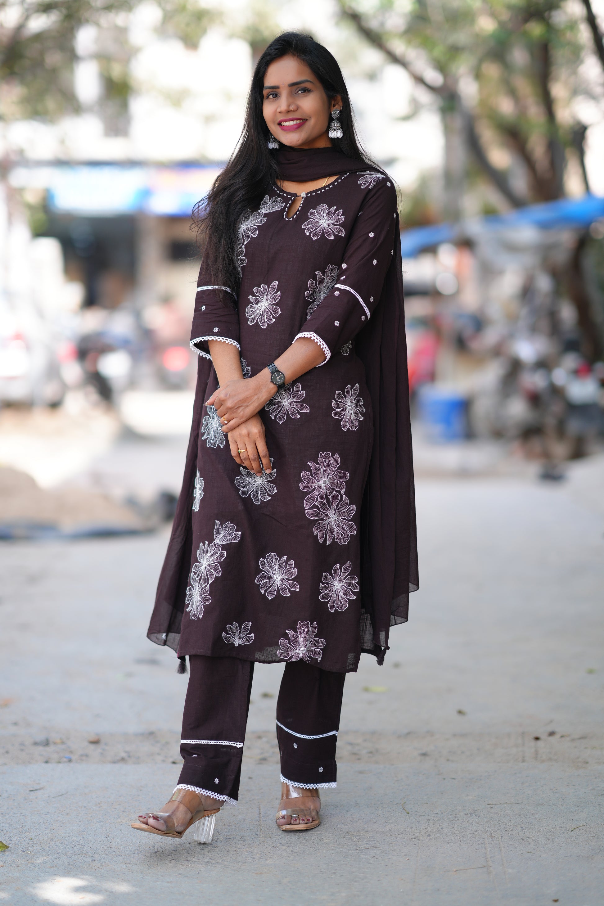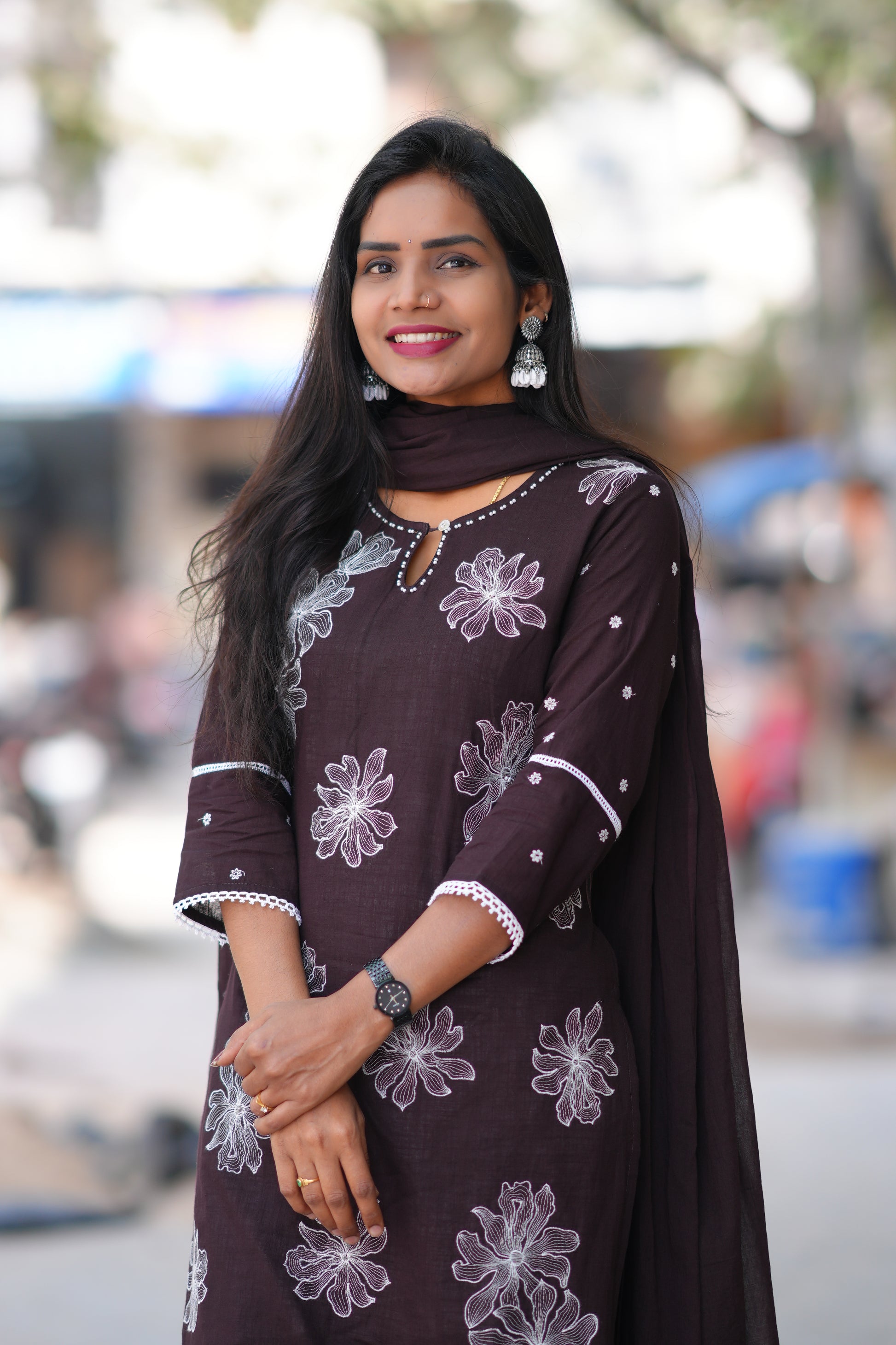 Brown Color Jaipur Cotton 3 Piece Set with Embroidery work and Complete lining Elevate your wardrobe with this exquisite Jaipur cotton ensemble, featuring a sophisticated brown palette enhanced by intricate embroidery detailing. This three-piece set combines traditional craftsmanship with everyday wearability, offering versatile styling options for various occasions. The premium cotton fabric ensures breathability and comfort throughout the day, while complete lining provides structure and durability. Each piece showcases meticulous embroidery work that reflects authentic artisanal techniques. Perfect for those who appreciate quality construction and timeless design, this set delivers both elegance and practicality for the discerning customer.