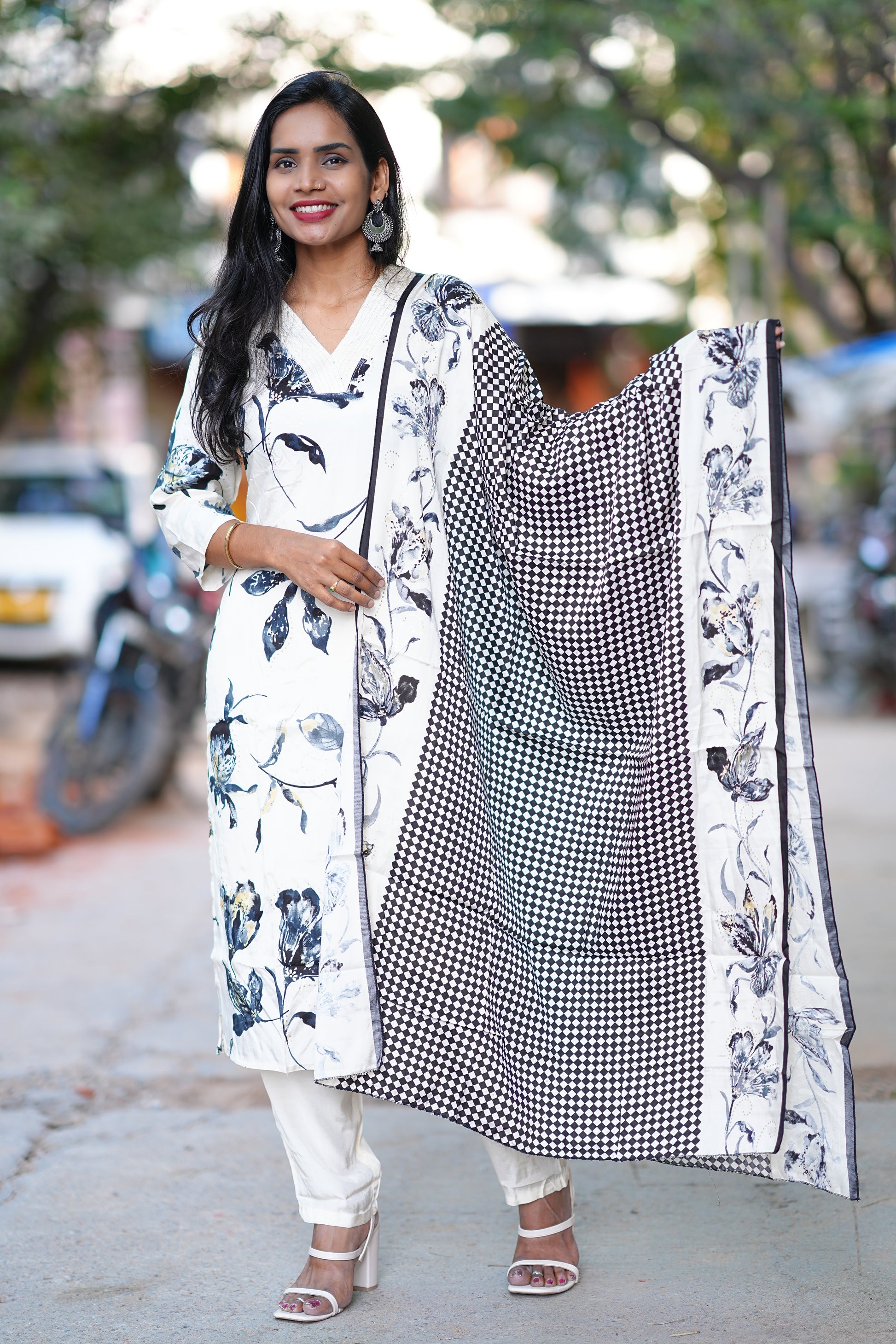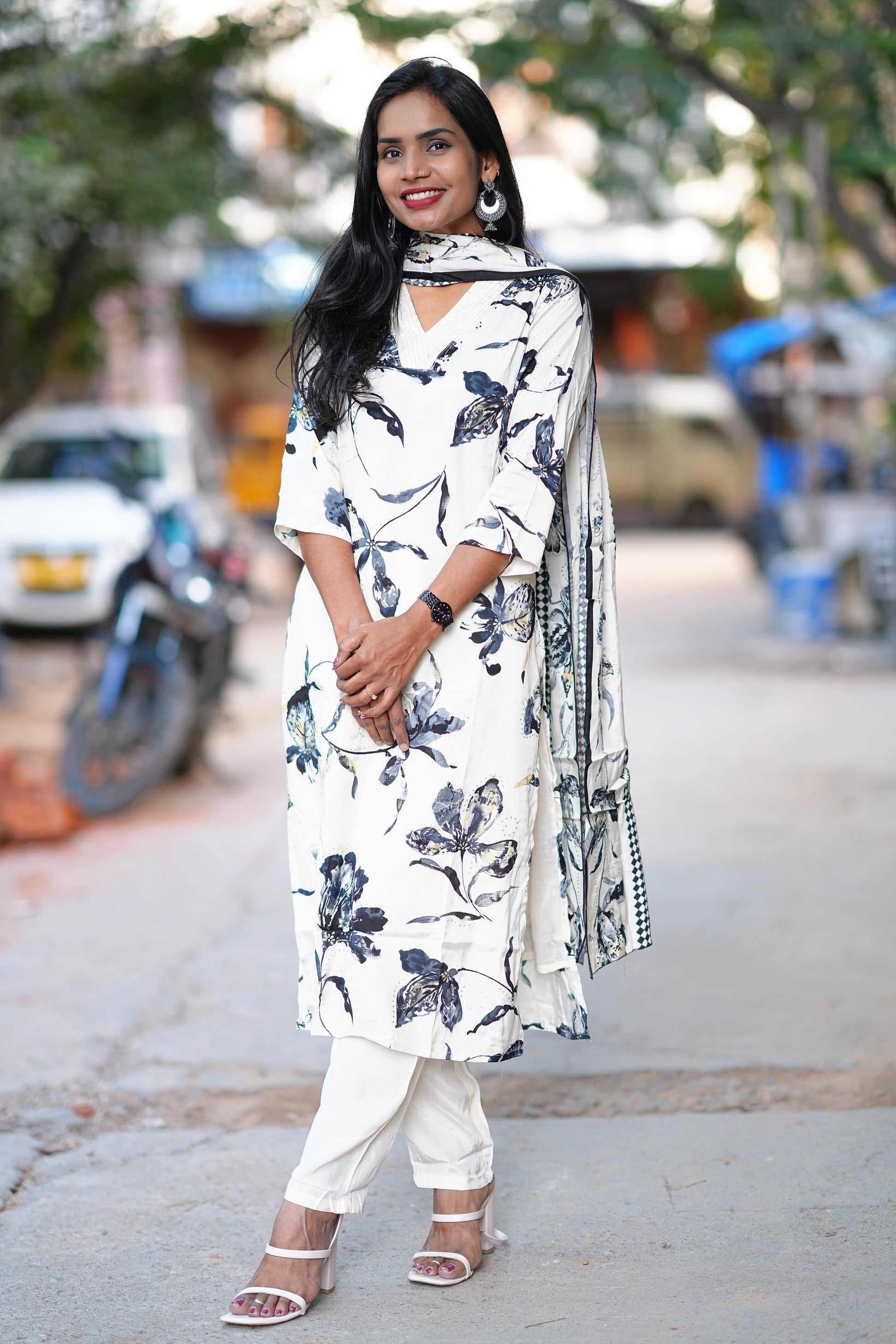 Cream Color Premium Viscose Chinon Party Wear 3 Piece Set
