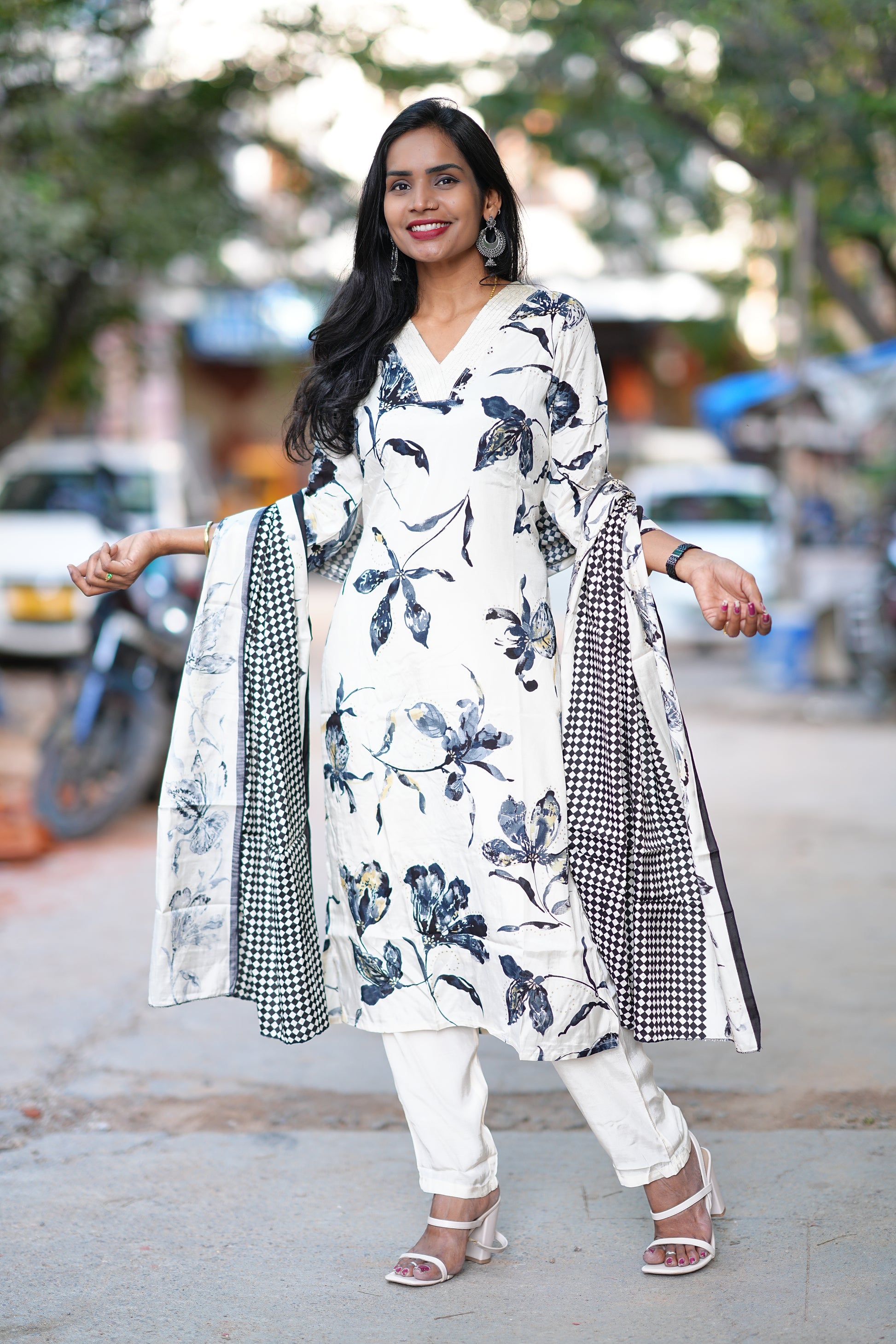 Elevate your wardrobe with this cream-colored premium viscose Chinon 3-piece set, designed for sophisticated party wear. The breathable viscose fabric ensures comfort while offering a smooth, elegant drape. This carefully crafted set combines style and ease, perfect for formal occasions where refined appearance matters. Its timeless shade and quality material enhance versatility, making it an excellent choice for a polished, expert look.