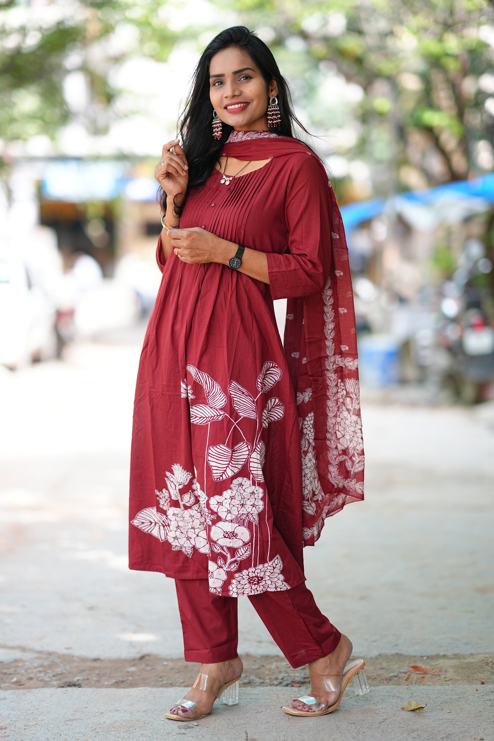 Experience the elegance of authentic Jaipur craftsmanship with this Dark Maroon Cotton A-Line 3 Piece Set. Crafted from breathable, high-quality cotton, the set combines comfort with style, perfect for both casual and semi-formal occasions. The flattering A-line silhouette enhances your figure while allowing ease of movement. Its rich maroon hue adds depth and sophistication, making it a versatile addition to your wardrobe. Ideal for those who appreciate traditional textiles with a modern fit.