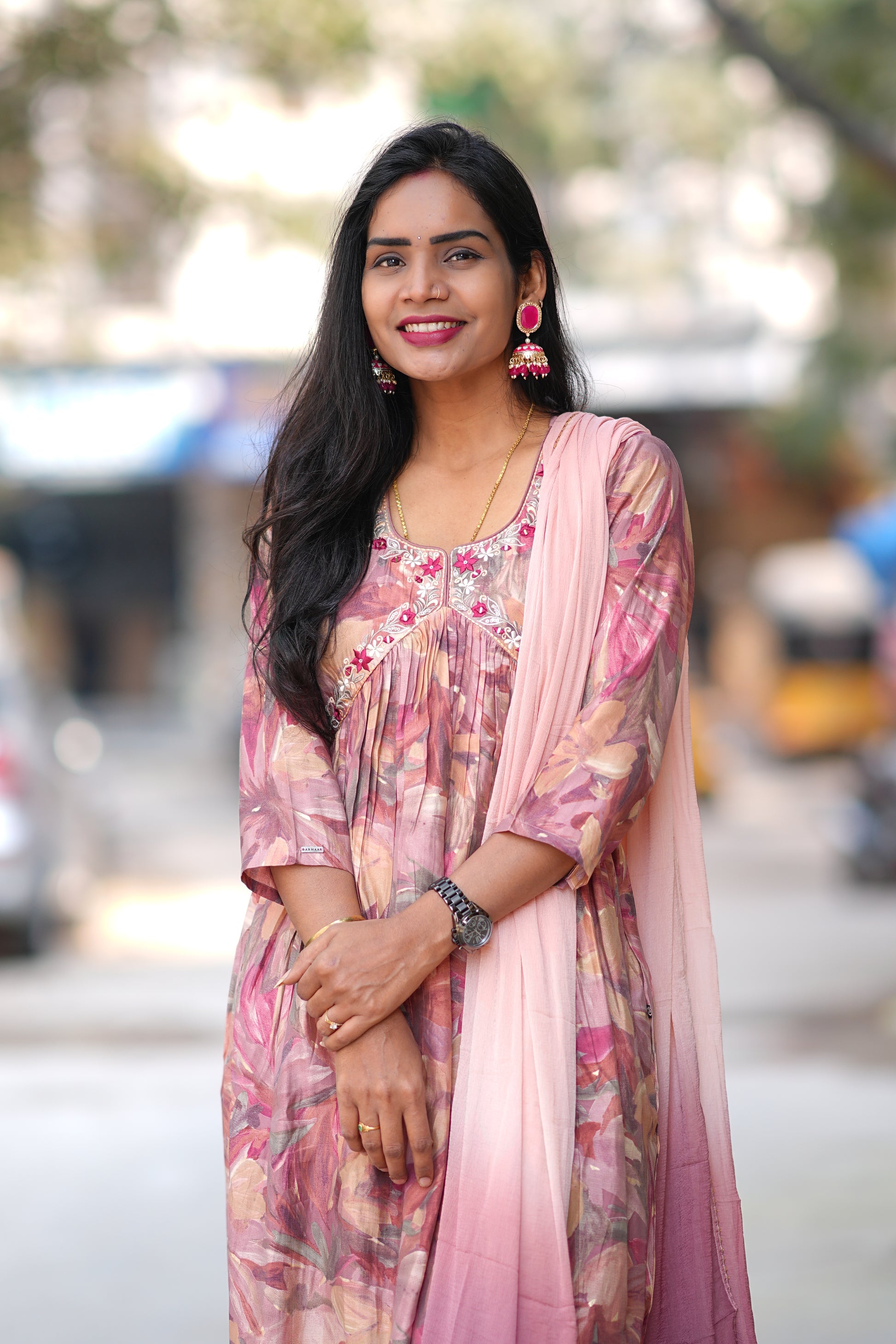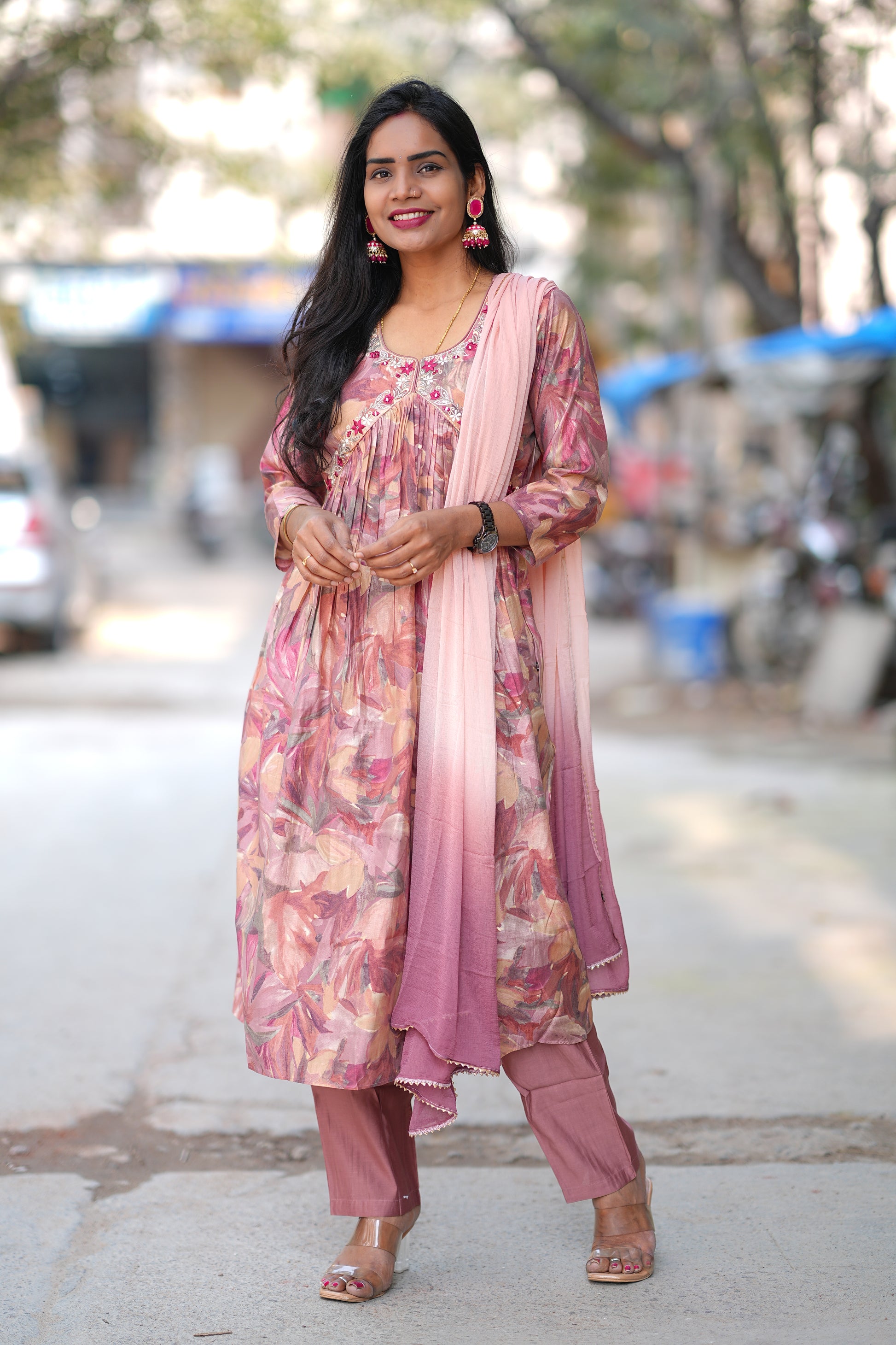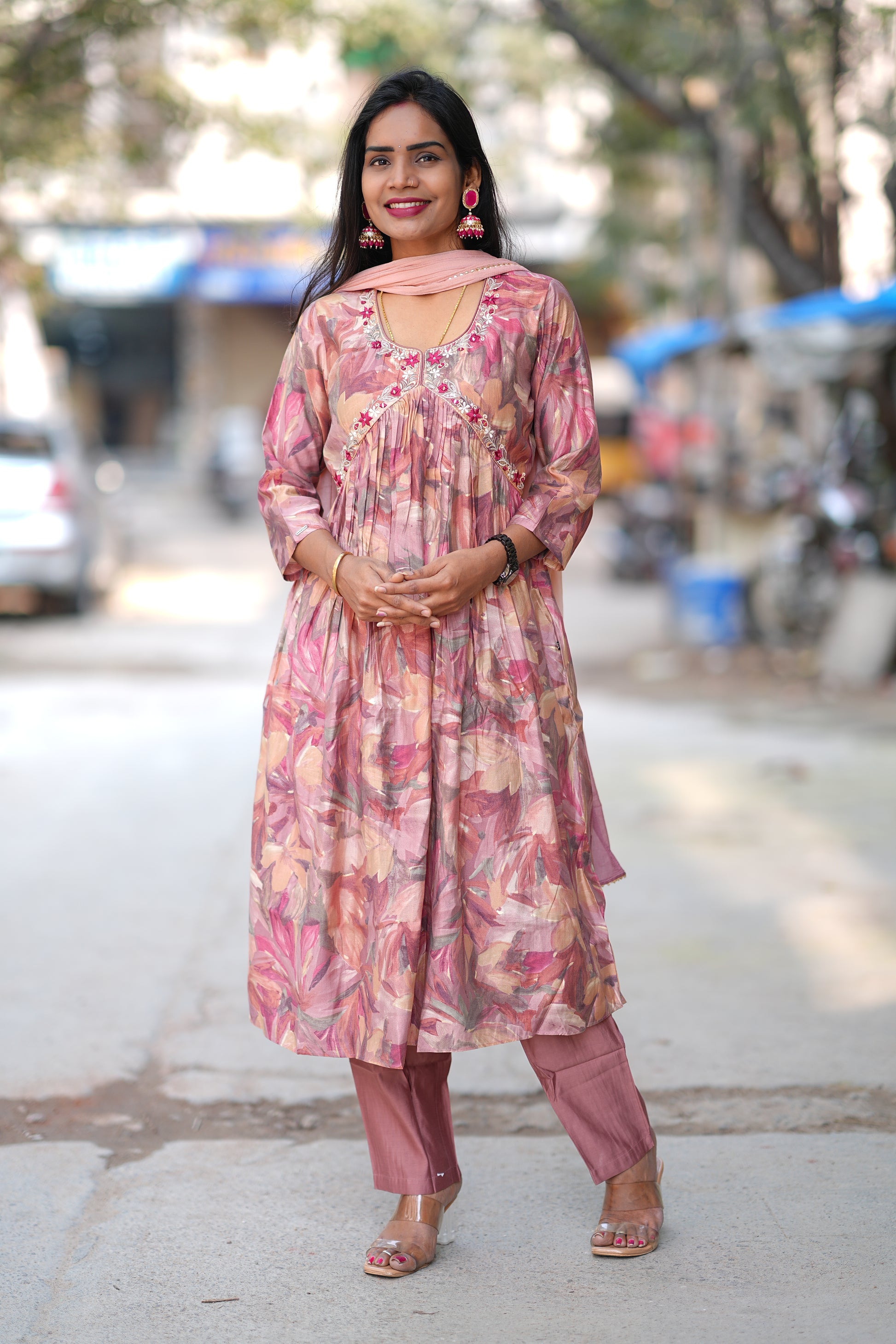 Elevate your festive wardrobe with this exquisite Anarkali 3-piece set in luxurious viscose Chanderi fabric. The soft dusty peach hue offers timeless elegance, perfect for weddings, celebrations, and special occasions. This ensemble features a gracefully draped Anarkali kurta paired with coordinating bottoms and dupatta, delivering authentic ethnic sophistication. Viscose Chanderi's lightweight, breathable nature ensures comfort throughout extended wear, while its natural sheen adds refined glamour. Ideal for those seeking traditional Indian attire with contemporary appeal and superior fabric quality.