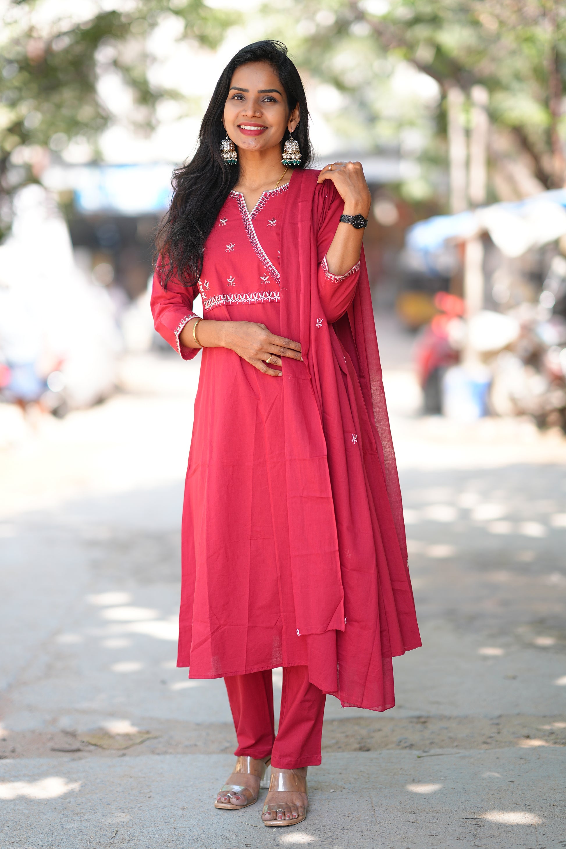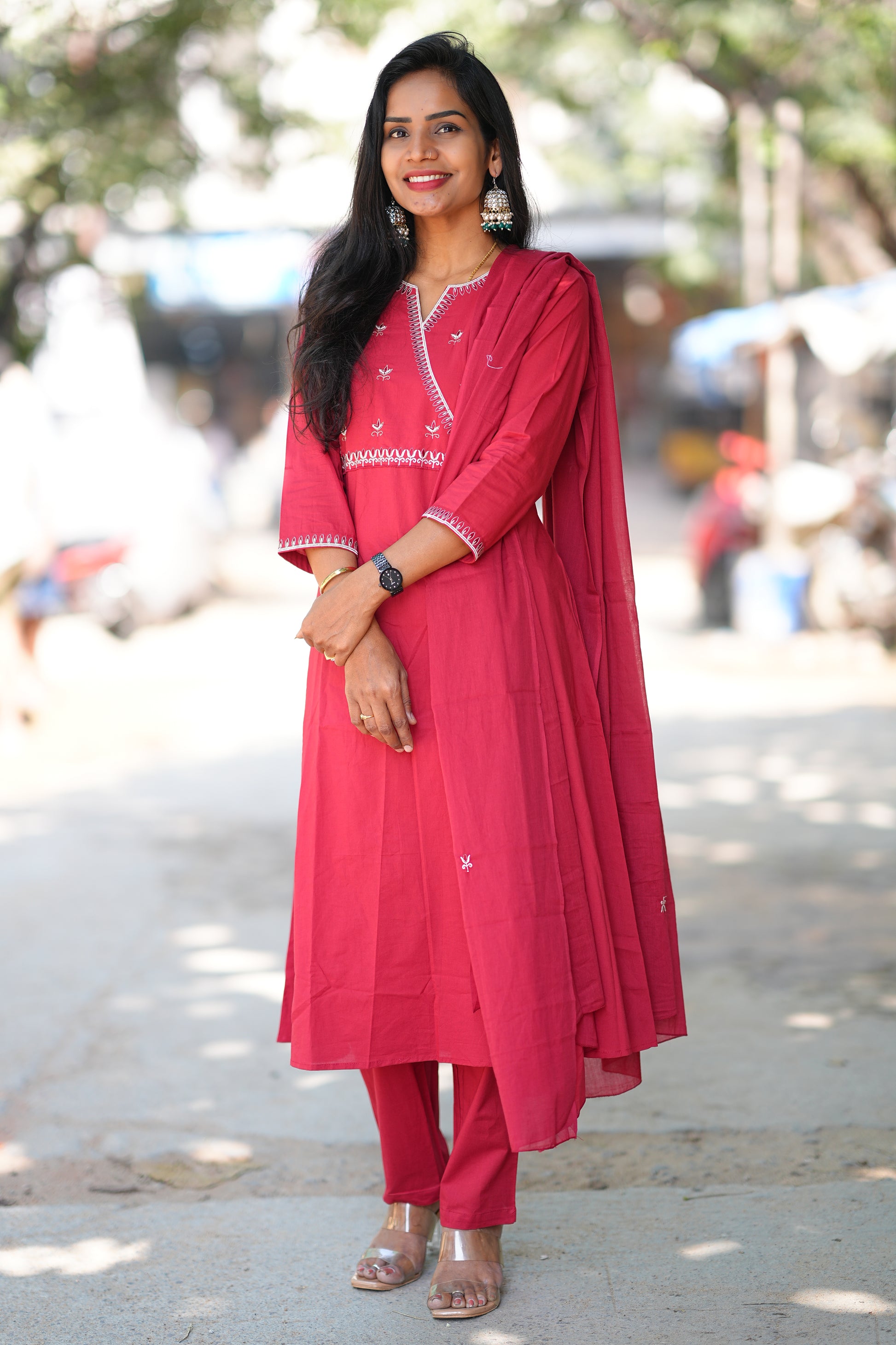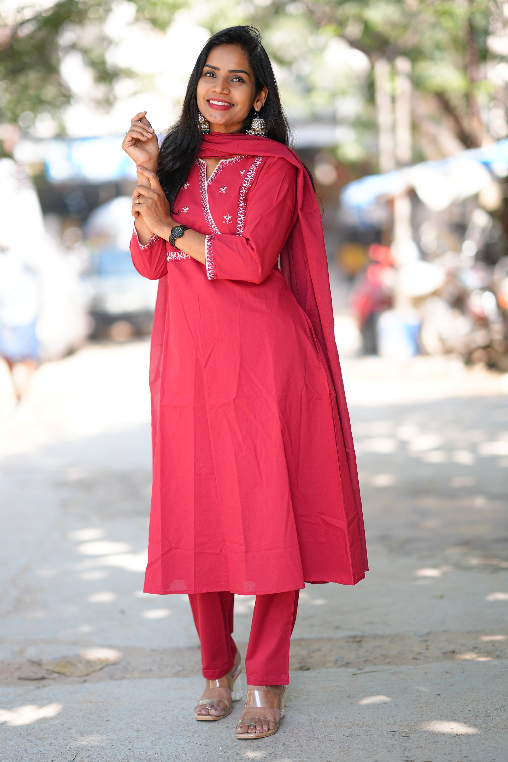 Maroon Pink 92.5 Jaipur Cotton A Line 3 Piece Set With Embroidery Work