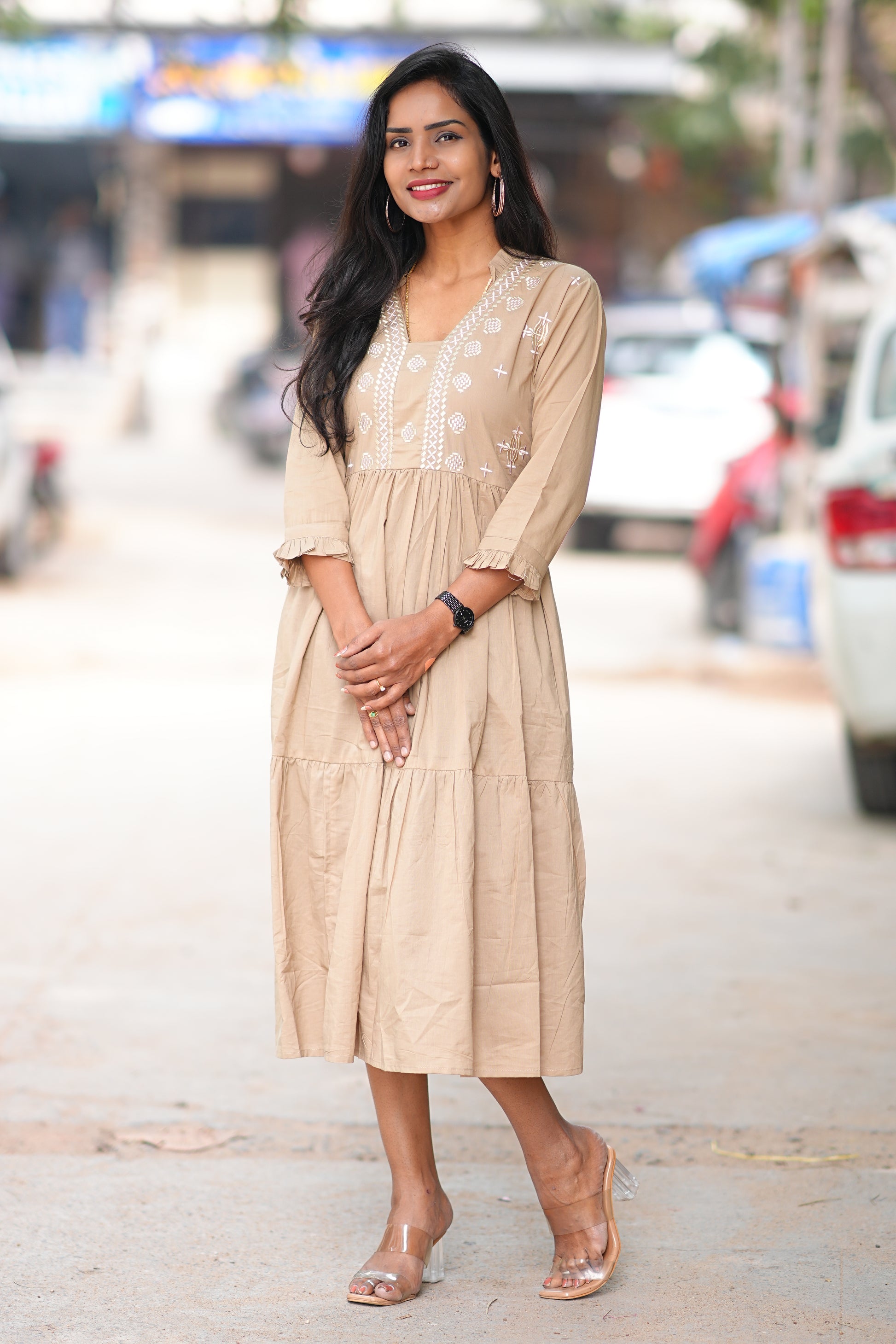 Jaipur Cotton Beige Colour Frock With Embroidery Work