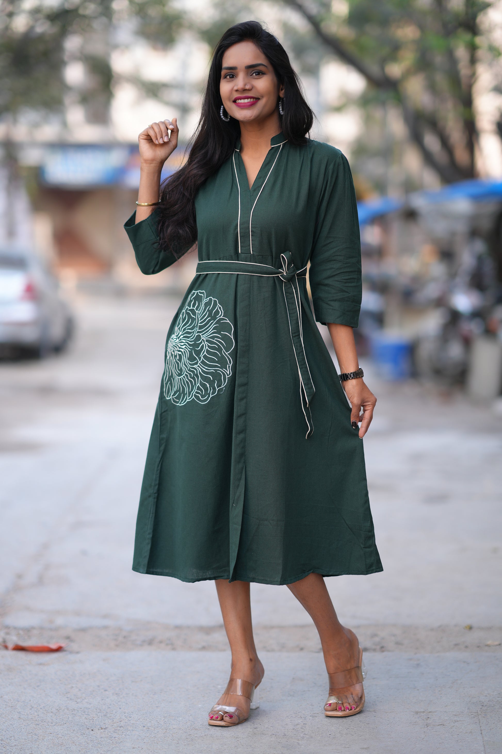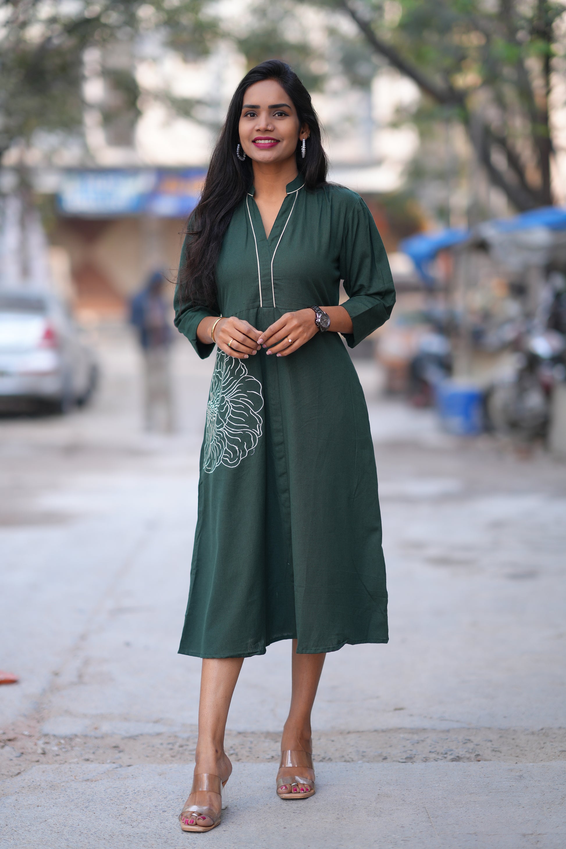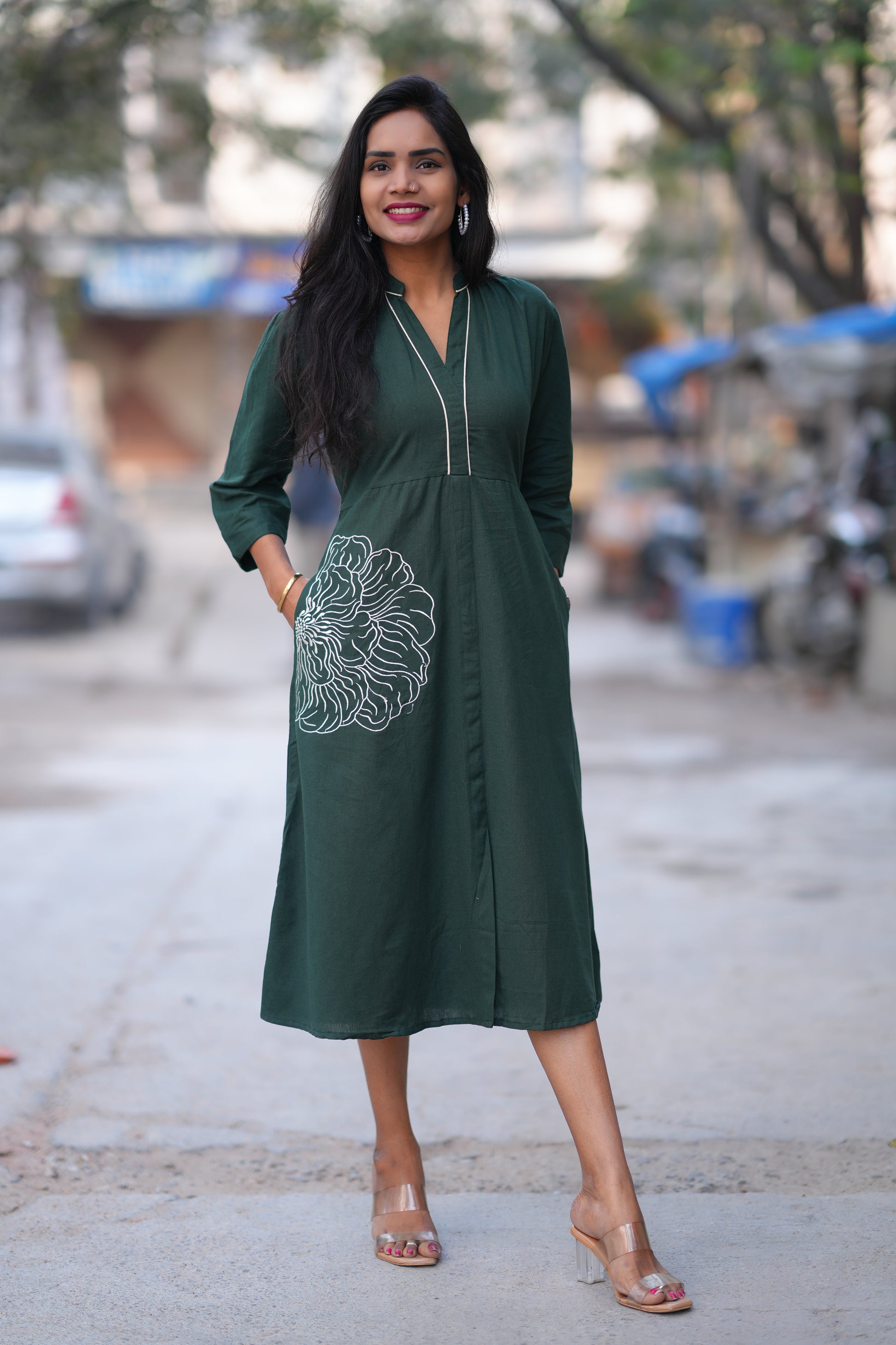 Crafted from premium Jaipur cotton, this elegant green frock combines traditional embroidery work with contemporary design. The soft, breathable fabric ensures comfort throughout the day, while intricate embroidered detailing adds a touch of sophistication. Perfect for casual outings, festive occasions, or everyday wear, this versatile piece showcases authentic craftsmanship. The rich green hue complements various skin tones, making it a timeless addition to any wardrobe. Ideal for those who appreciate quality textiles and artisanal embellishment.