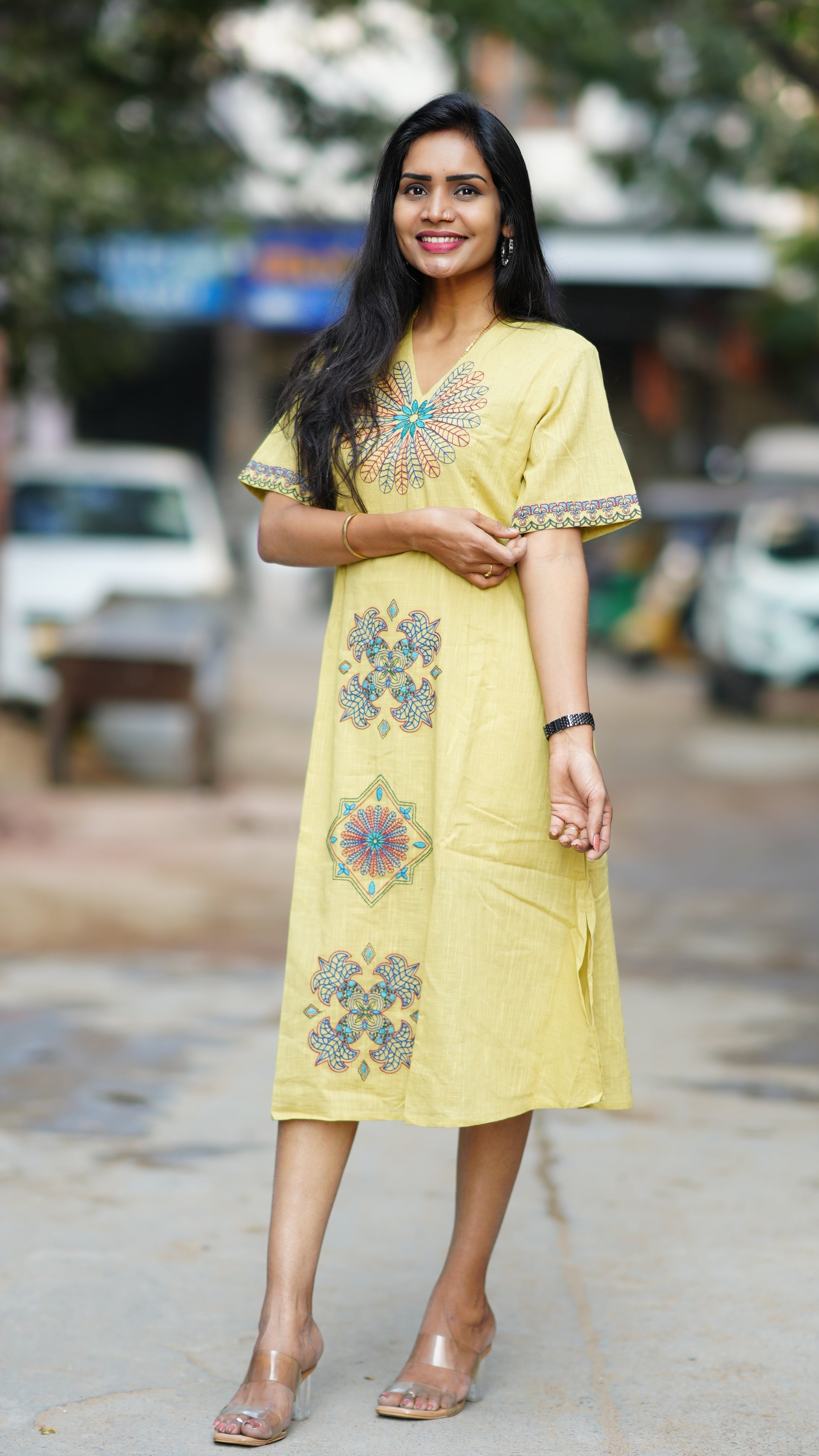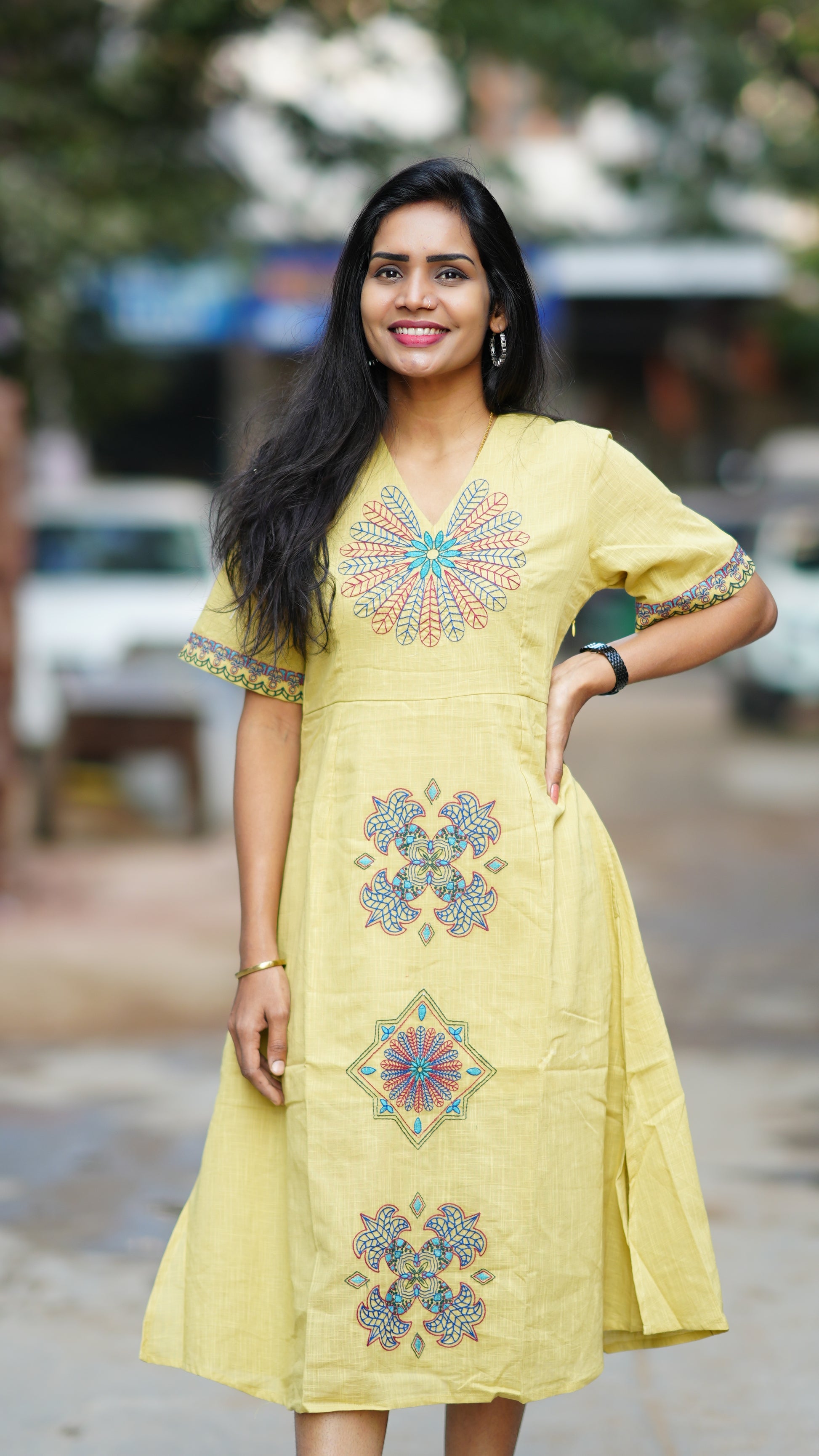 Lemon Yellow Premium Mul Cotton Frock With Hand Embroidery and Complete Lining