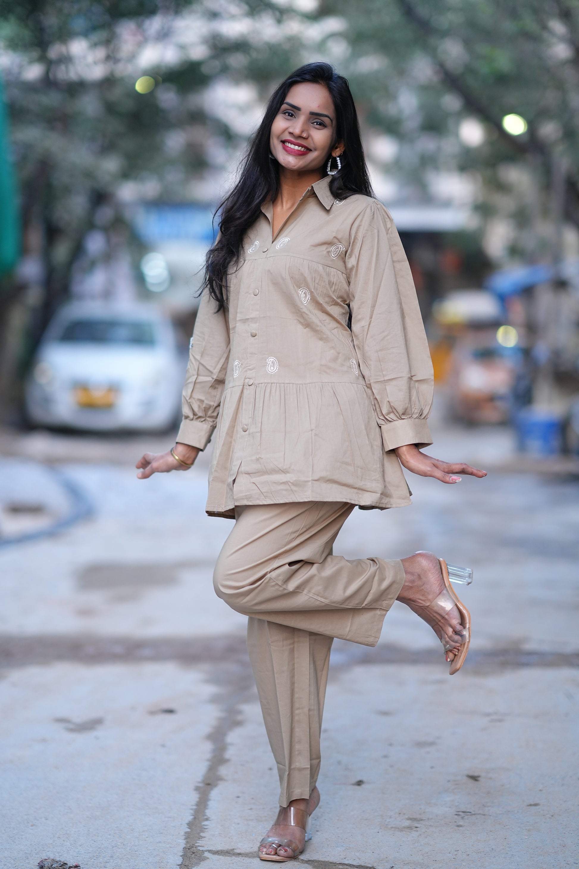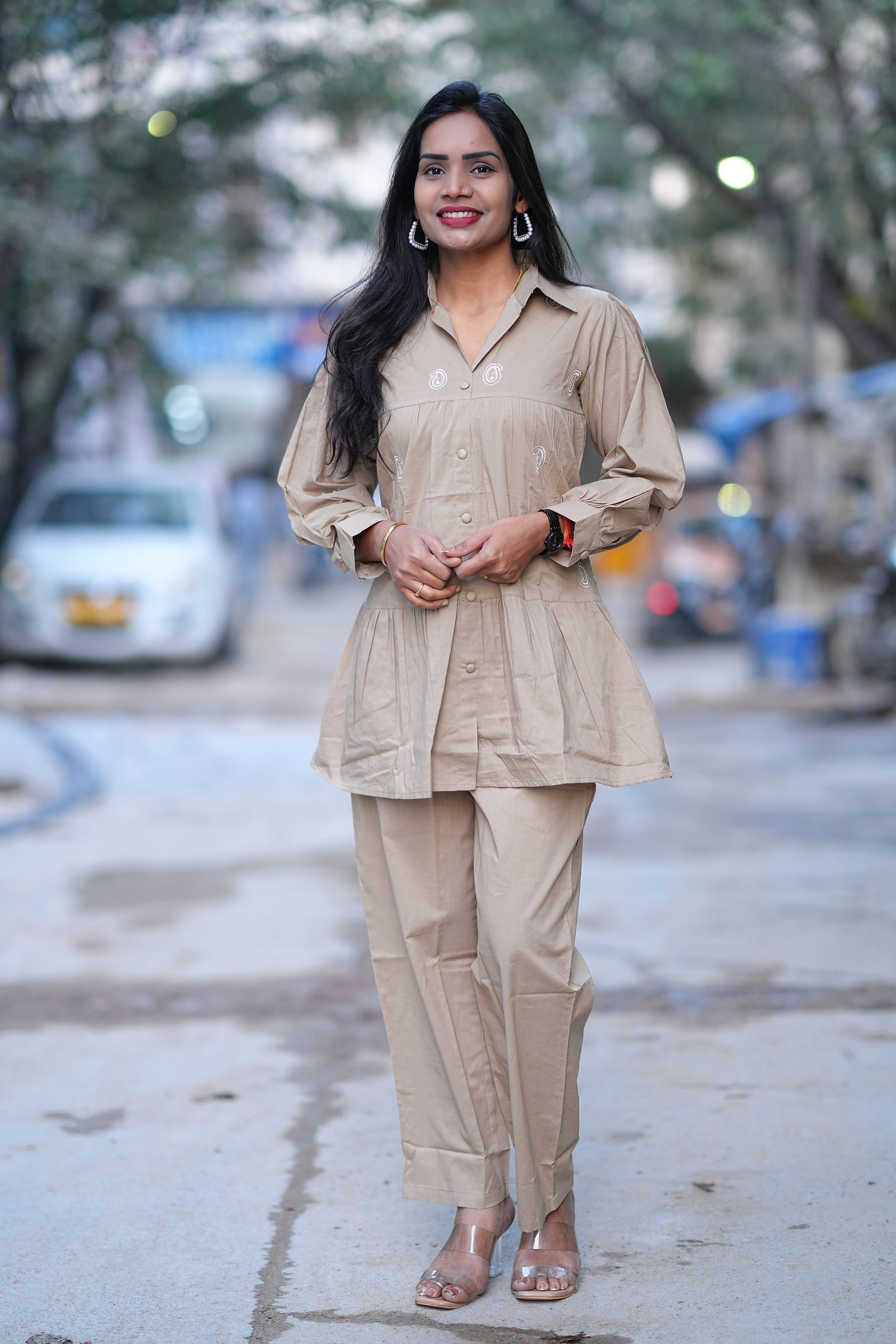 Light Brown Color Jaipur Cotton Office Wear Cordset Elevate your professional wardrobe with this sophisticated Jaipur cotton cordset in a versatile light brown shade. Crafted from premium cotton, this two-piece ensemble combines comfort with polished style, making it an ideal choice for office environments and formal settings. The breathable fabric ensures all-day comfort in warm climates, while the coordinated design offers effortless styling. Perfect for professionals seeking quality, durability, and understated elegance in their everyday workwear.