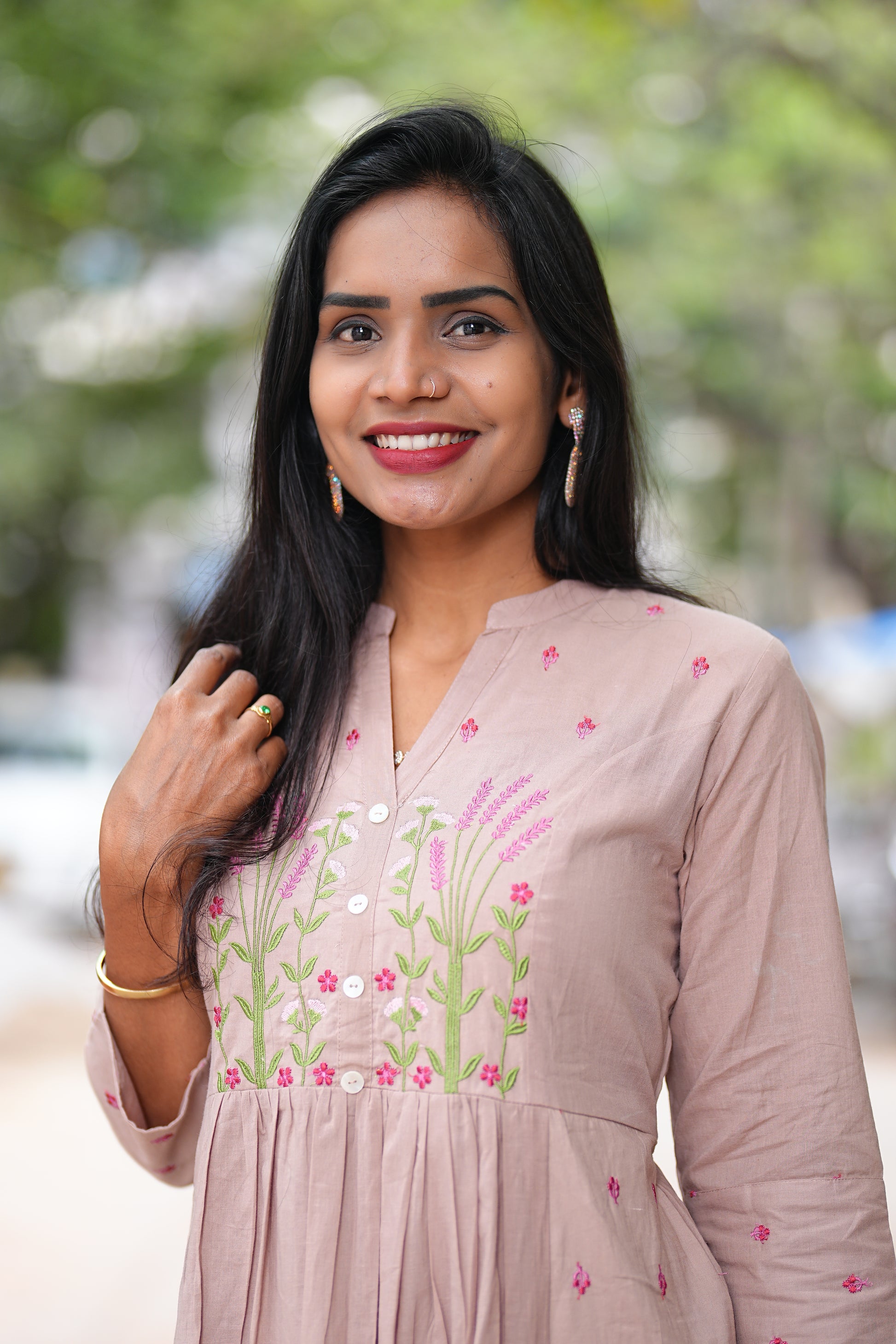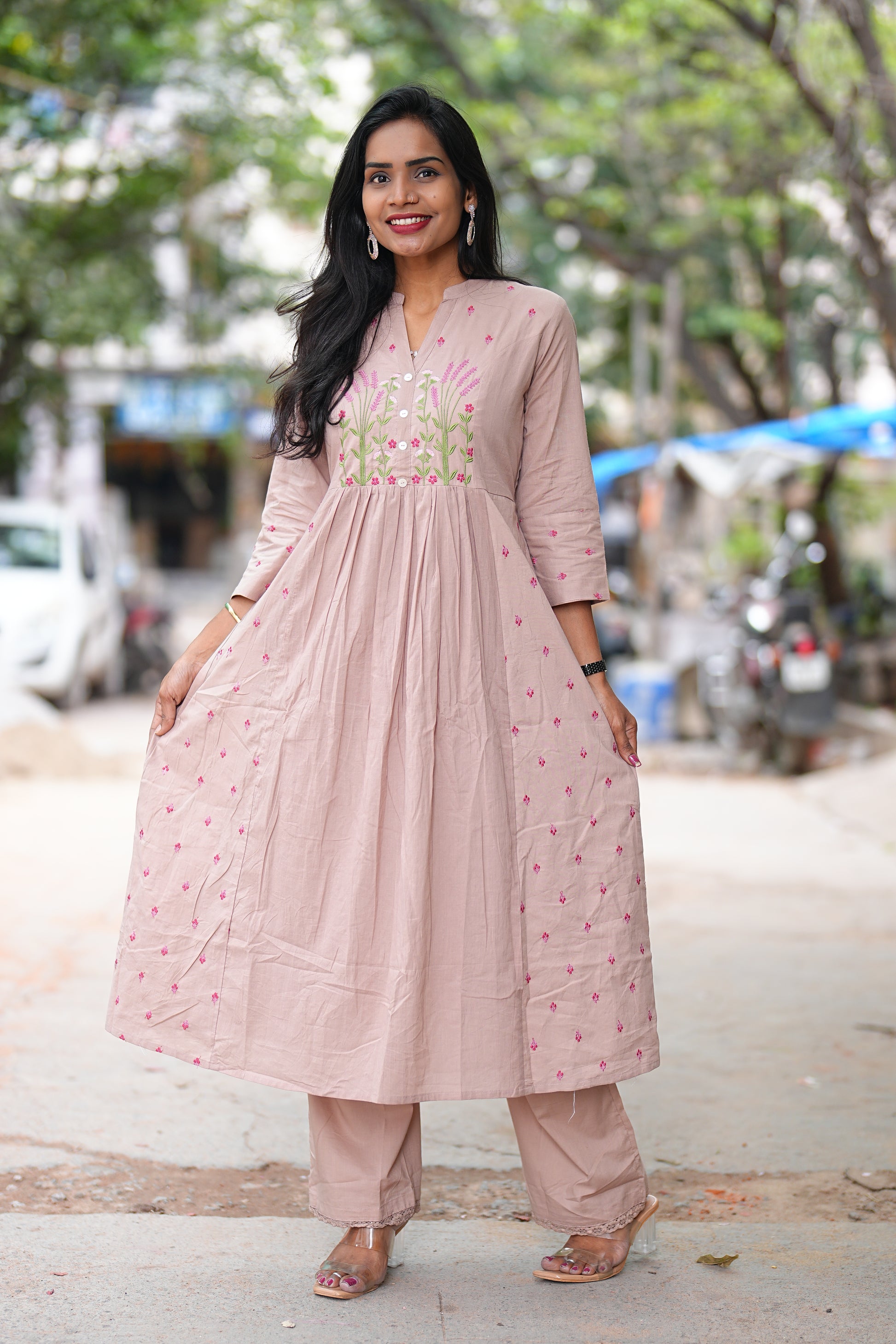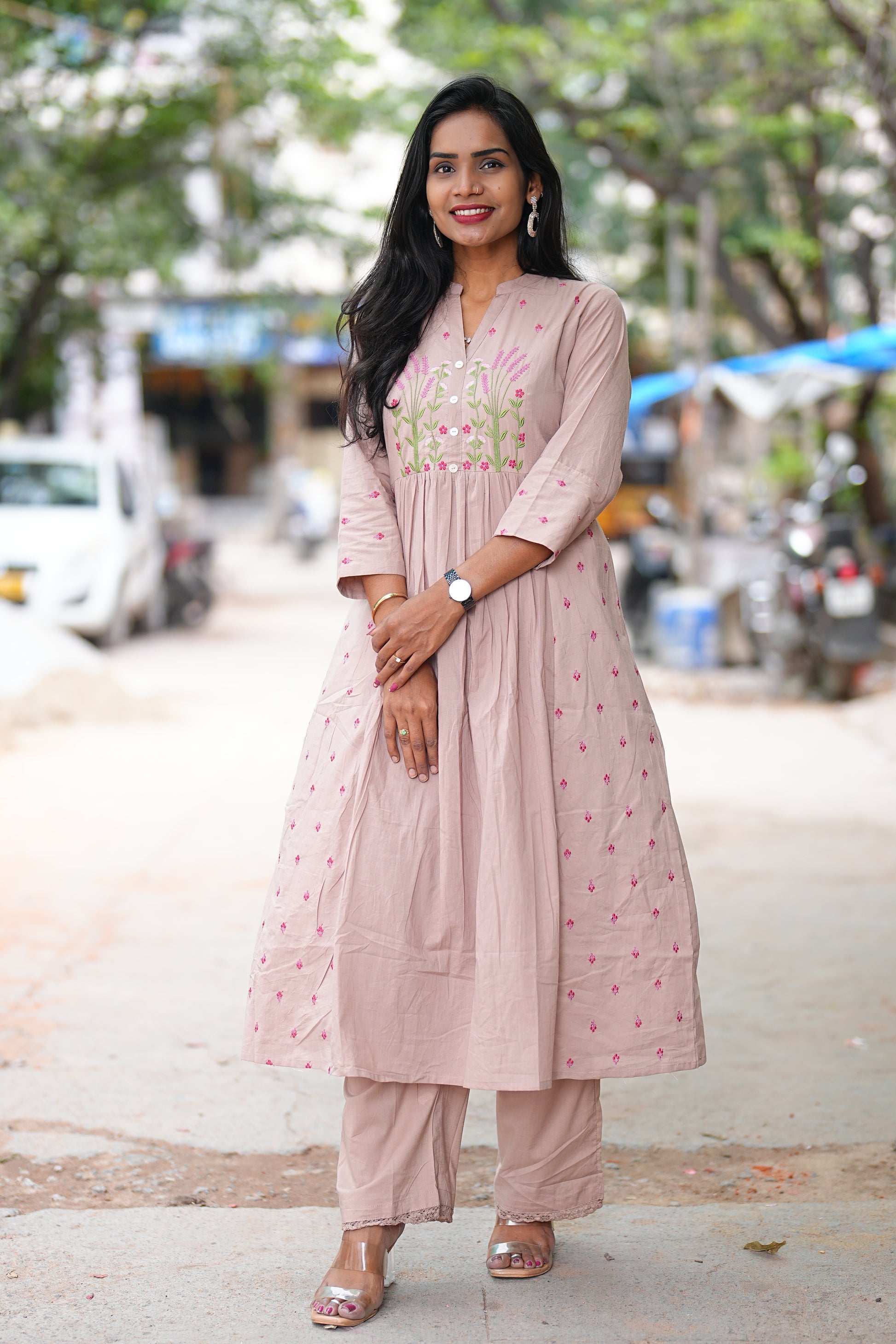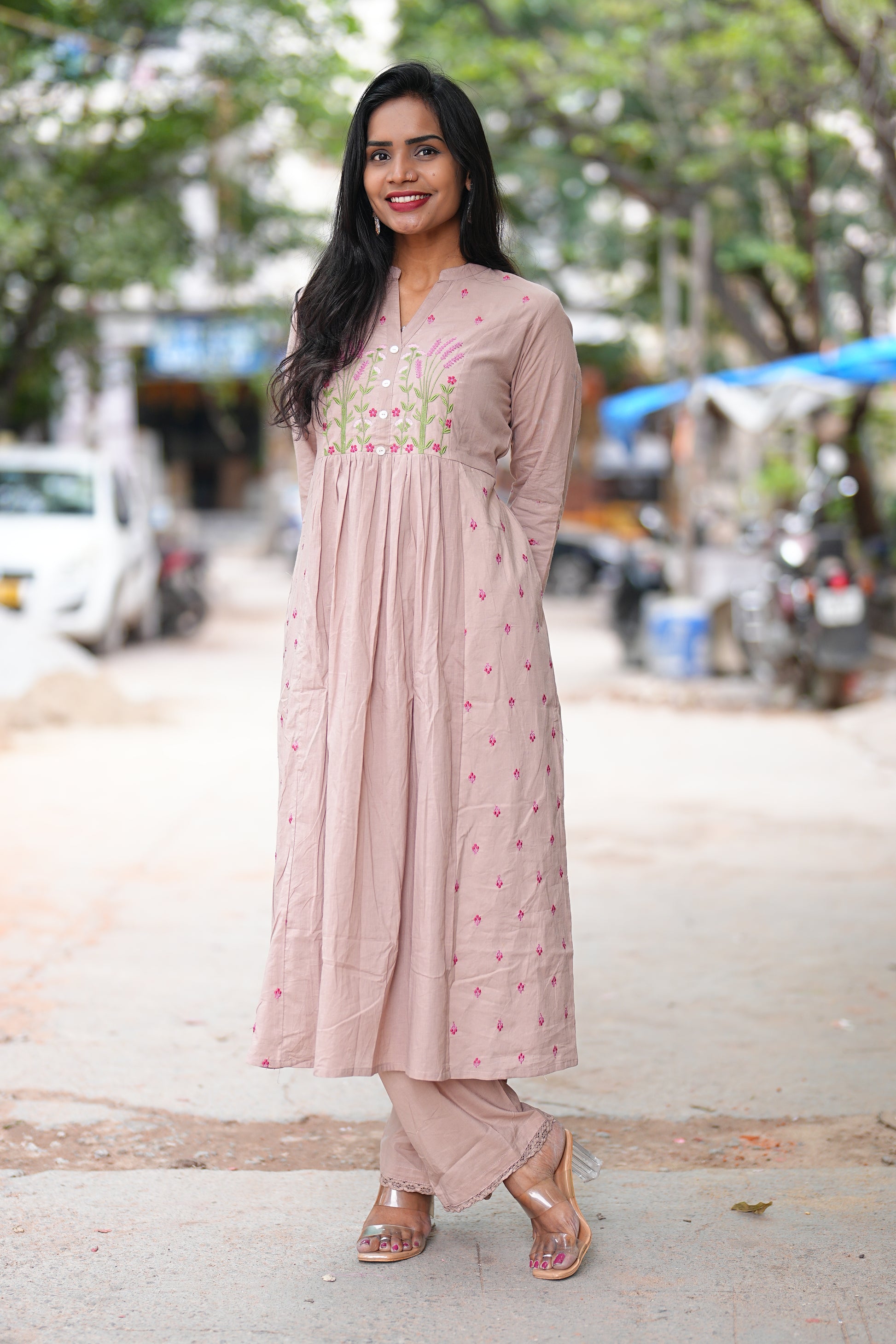This cordset features exquisite light brown thread embroidery on pure mul cotton fabric, offering a refined and comfortable wear experience. Crafted with complete lining, it ensures a structured fit and enhances durability. Ideal for those seeking elegance paired with premium natural fabric, this piece combines traditional craftsmanship with lasting quality.