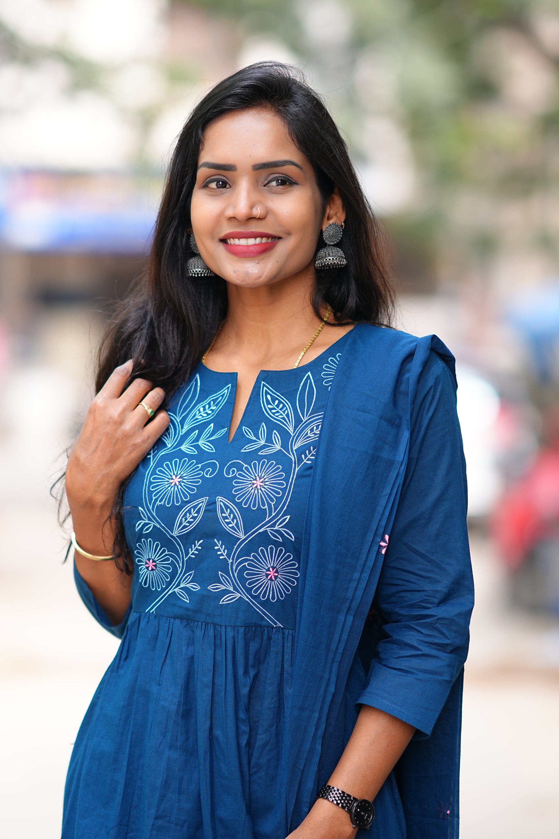 Elevate your ethnic wardrobe with this exquisite three-piece ensemble crafted from premium 92.5 Jaipur cotton. The midnight blue A-line silhouette features intricate thread embroidery detailing, offering a sophisticated blend of traditional craftsmanship and contemporary design. Thoughtfully tailored for plus-size comfort, this set provides a flattering fit that celebrates your style. Perfect for festive occasions, celebrations, or everyday elegance, this versatile collection brings timeless appeal to your closet.