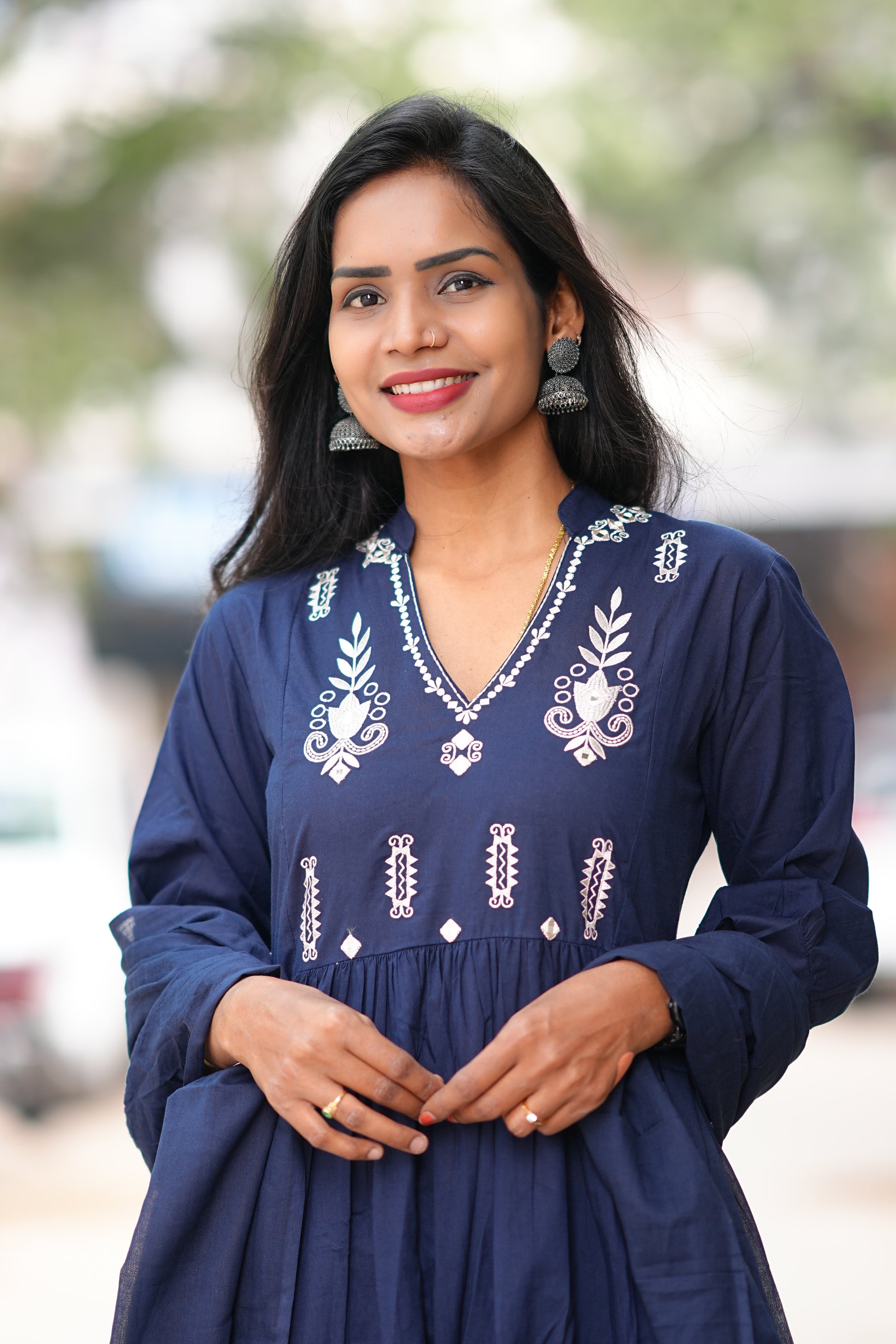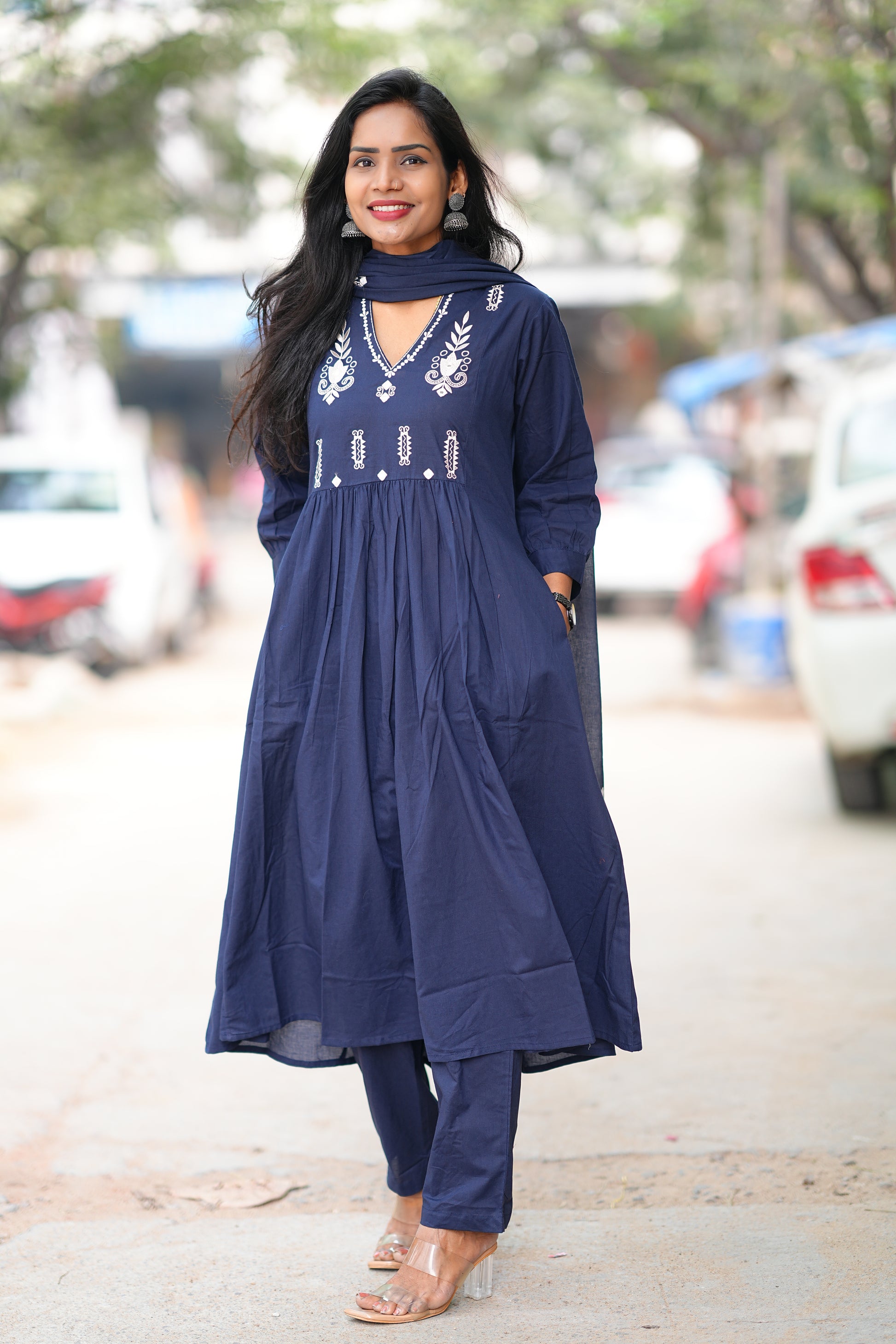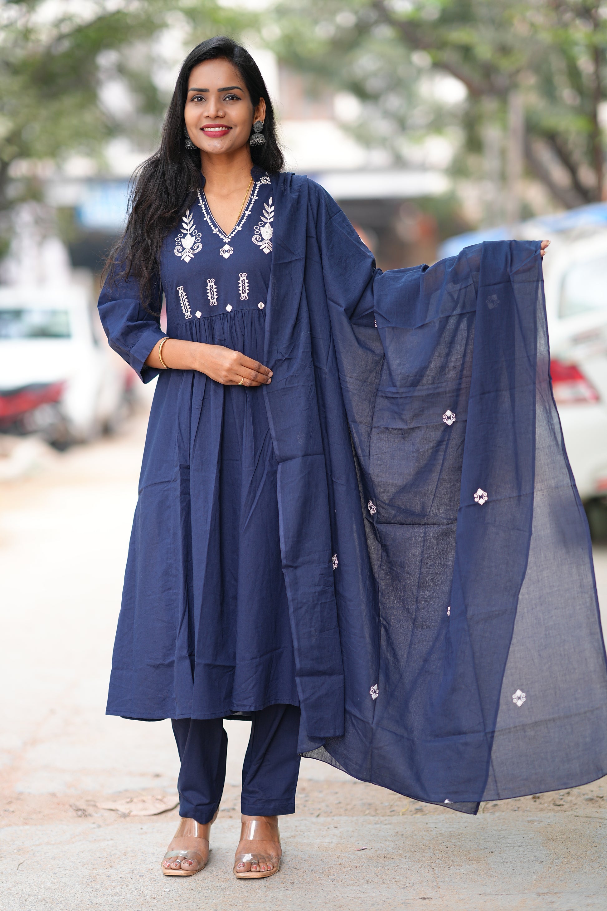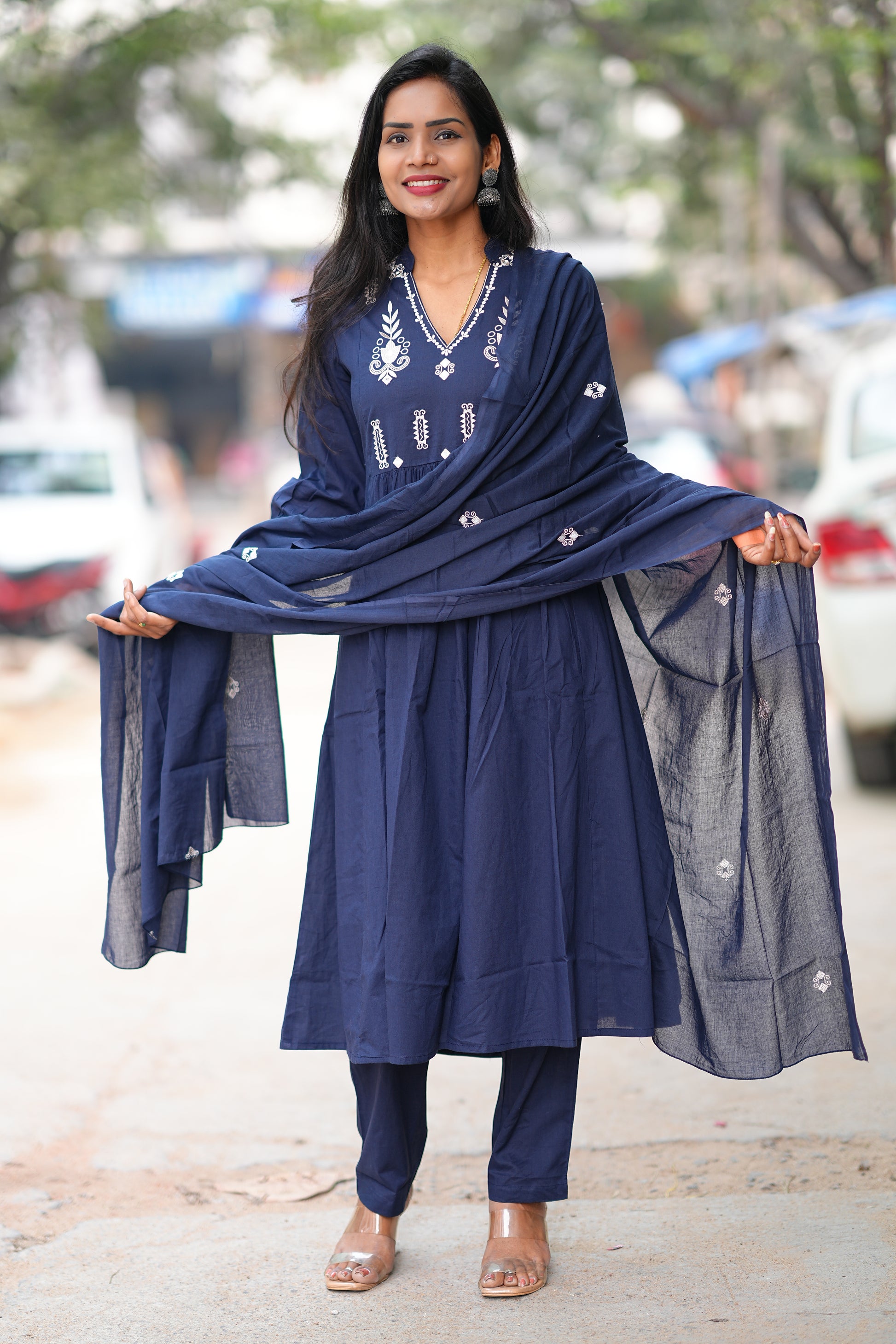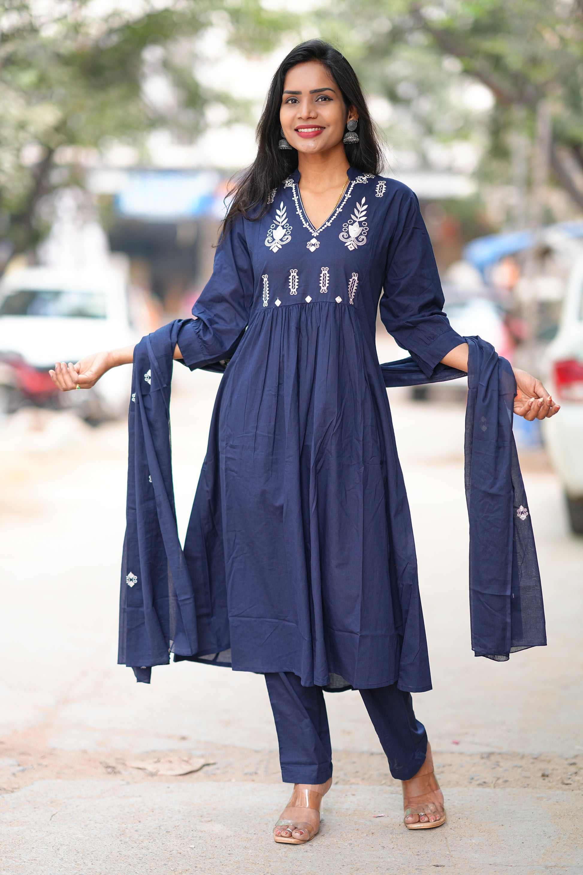 Navy Blue Color Pure 92.5 Jaipur Cotton A line 3 Piece Set With Embroidery Work