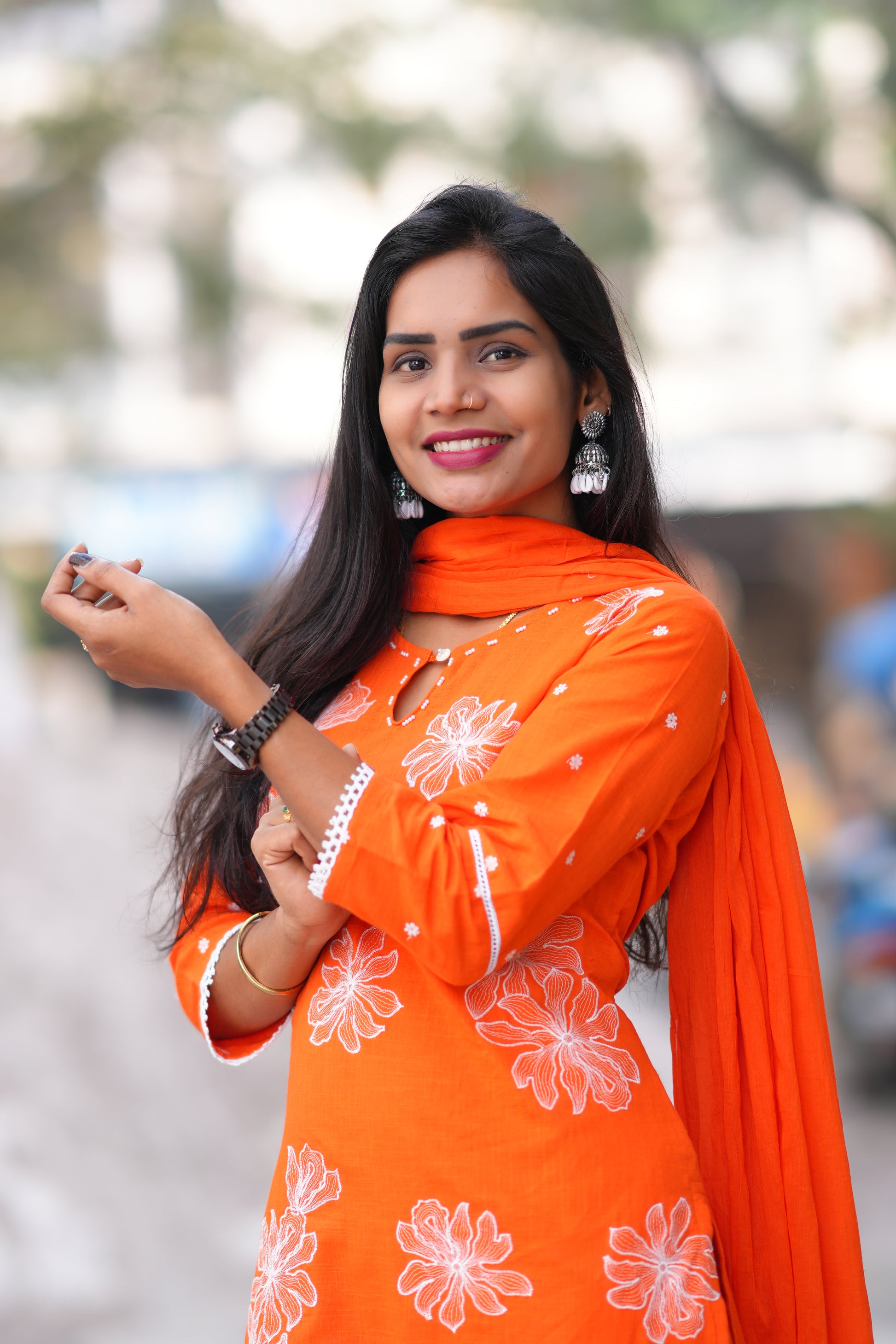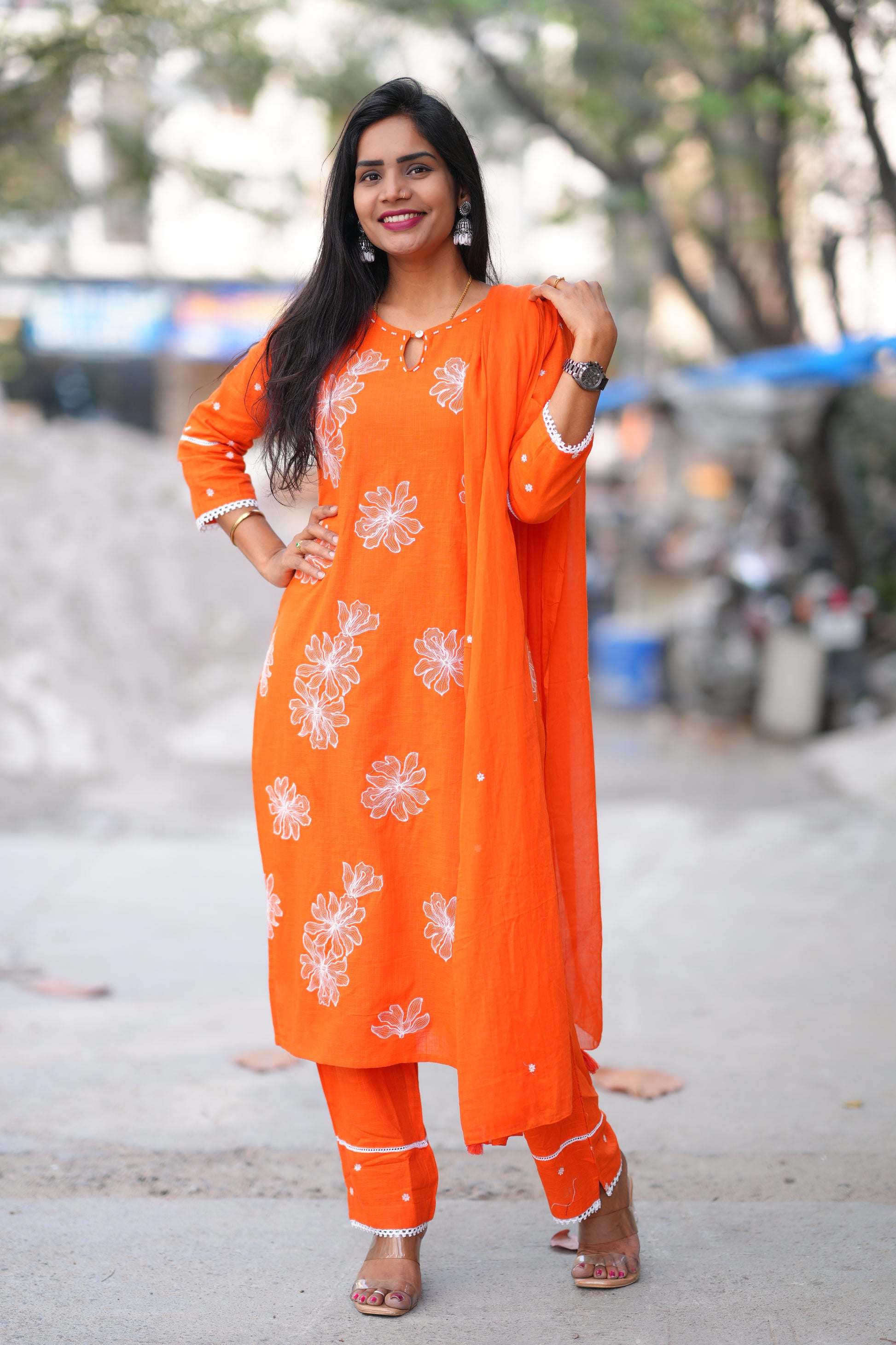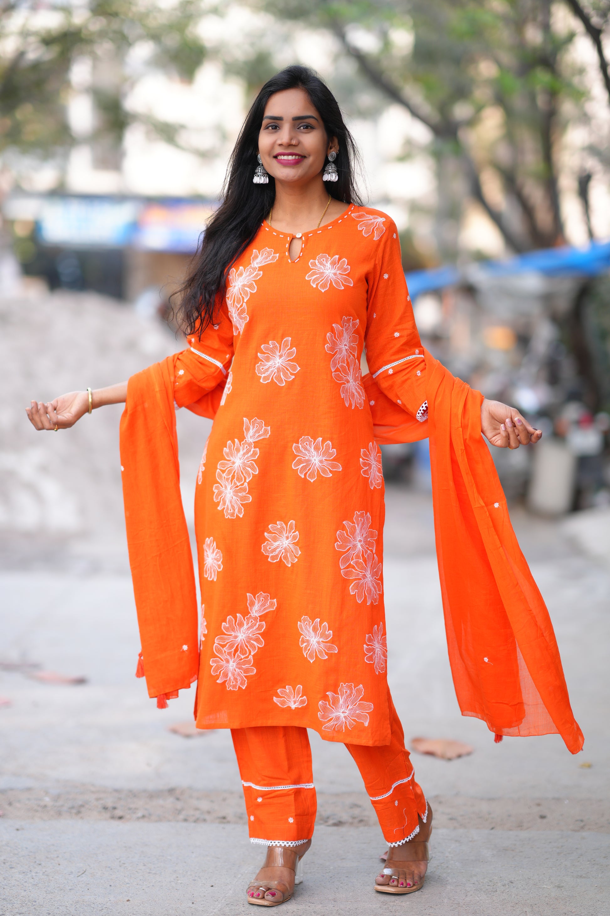 Orange Color Jaipur Slub Cotton 3 Piece Set With Complete Lining