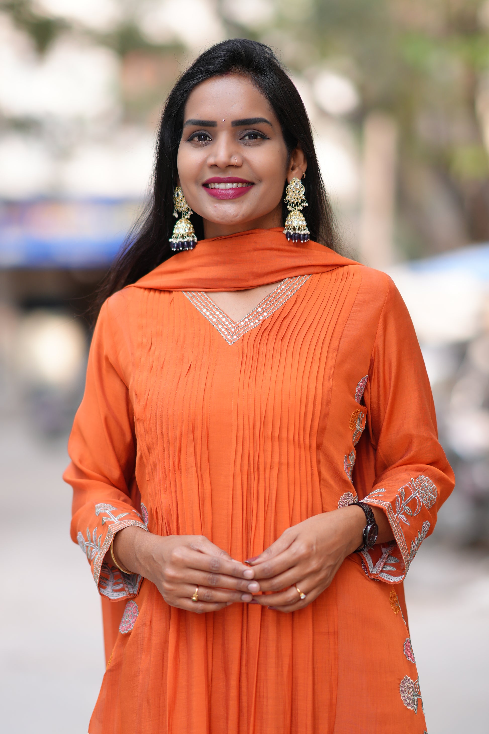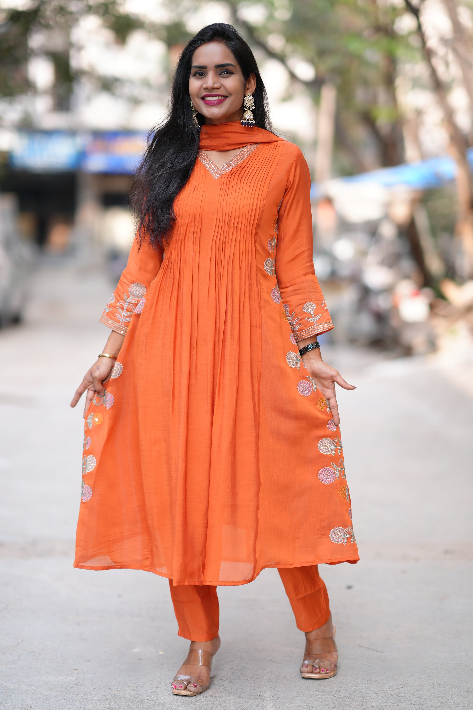 Orange Color Mul Chanderi Designer Wear 3 Piece Set With Embroidery Work and Complete Lining Elevate your ethnic wardrobe with this exquisite three-piece ensemble crafted from premium mul chanderi fabric. The vibrant orange hue is complemented by intricate embroidery detailing that showcases traditional artistry. Each piece features complete lining for comfort and durability, ensuring the garment maintains its shape and provides a refined finish. Mul chanderi's lightweight, breathable nature makes this set ideal for both festive occasions and everyday wear. The combination of expert craftsmanship and quality materials delivers a sophisticated look that transitions seamlessly from celebrations to casual gatherings.