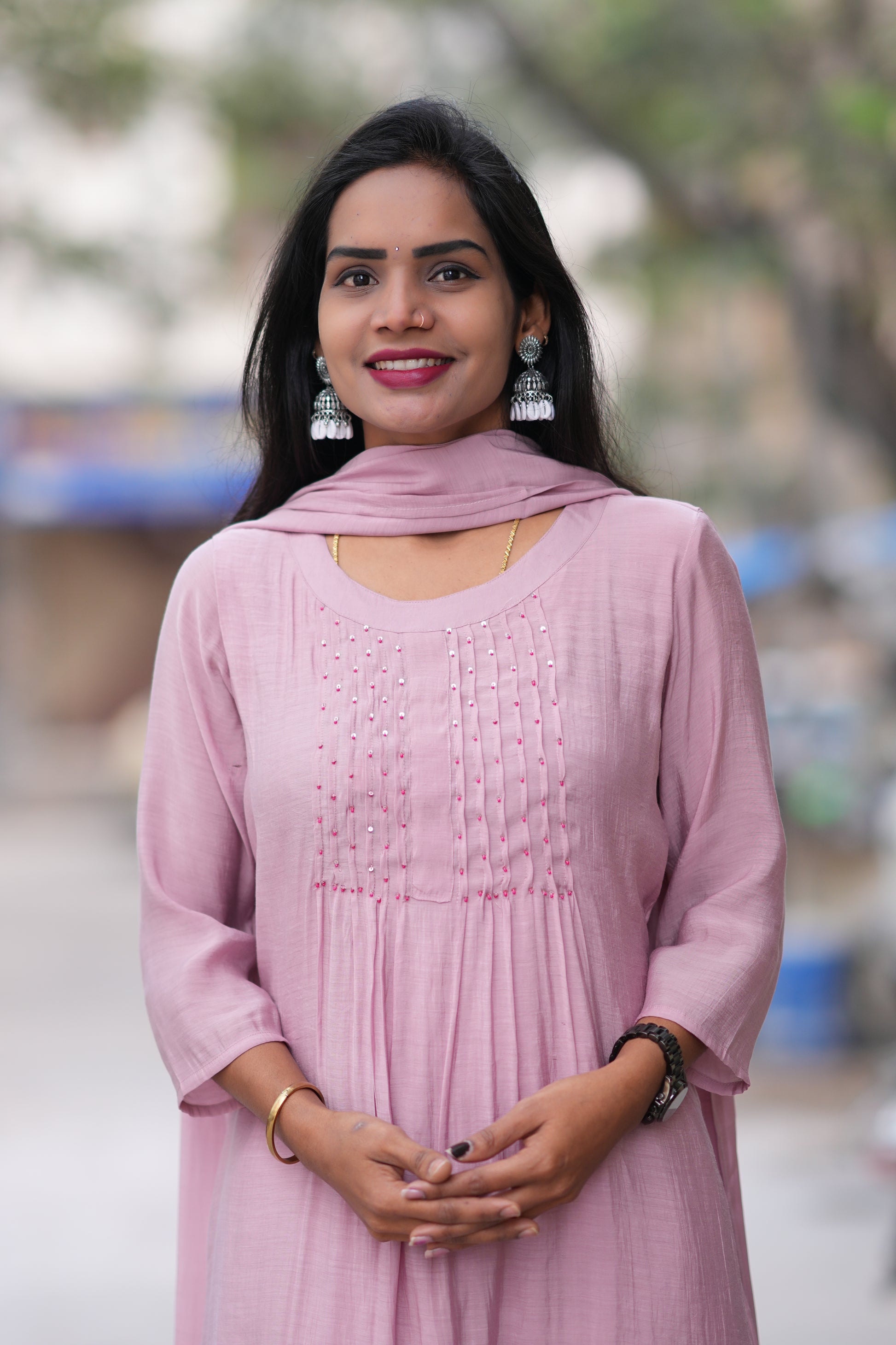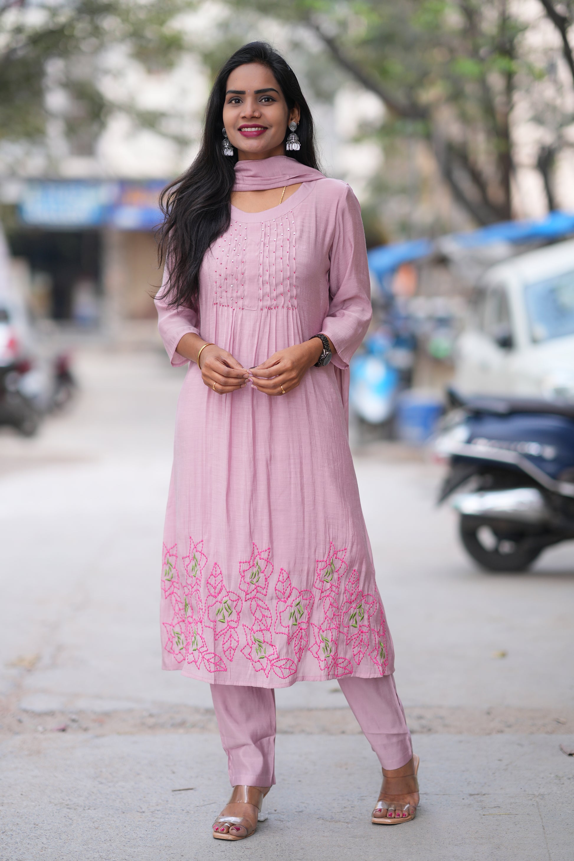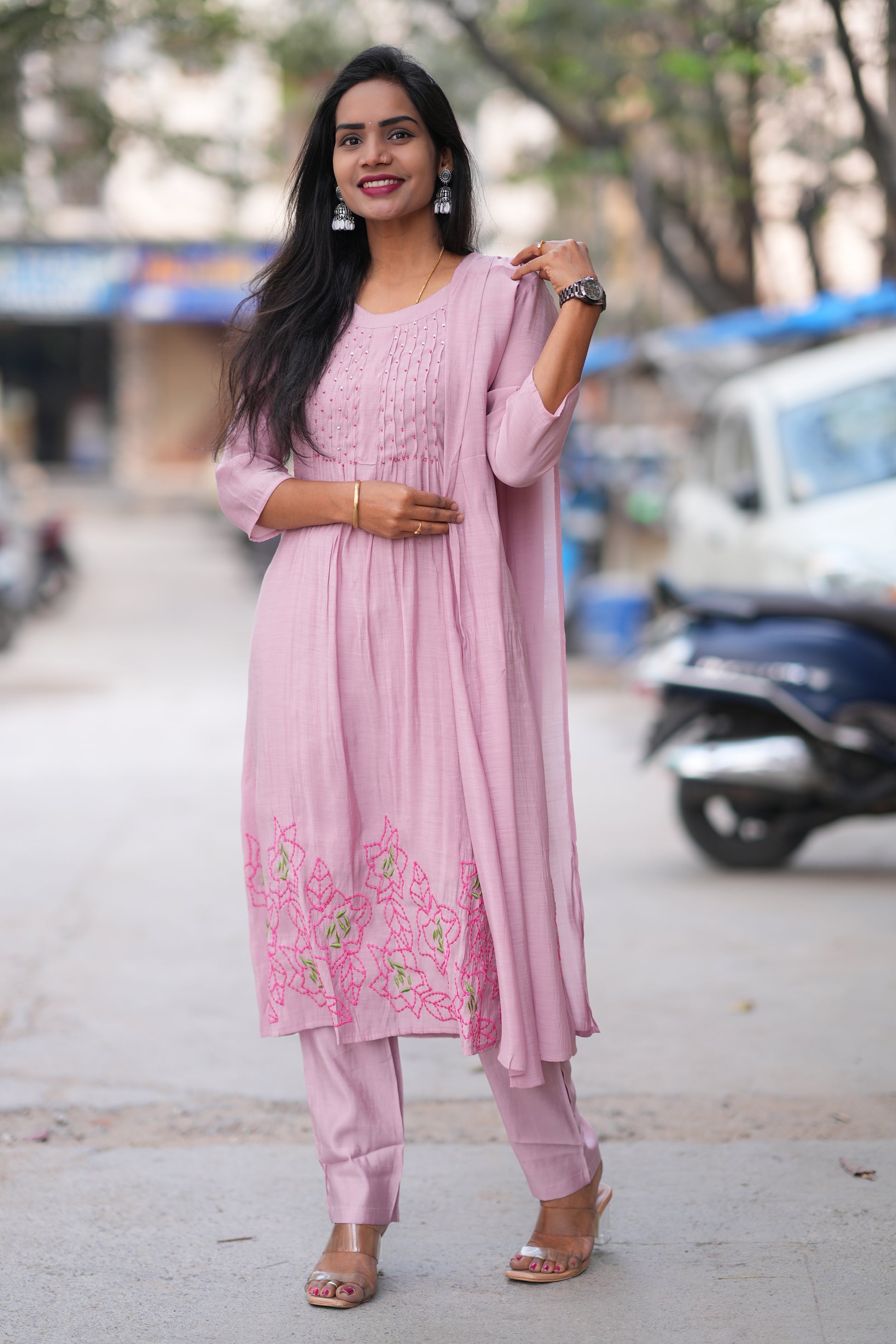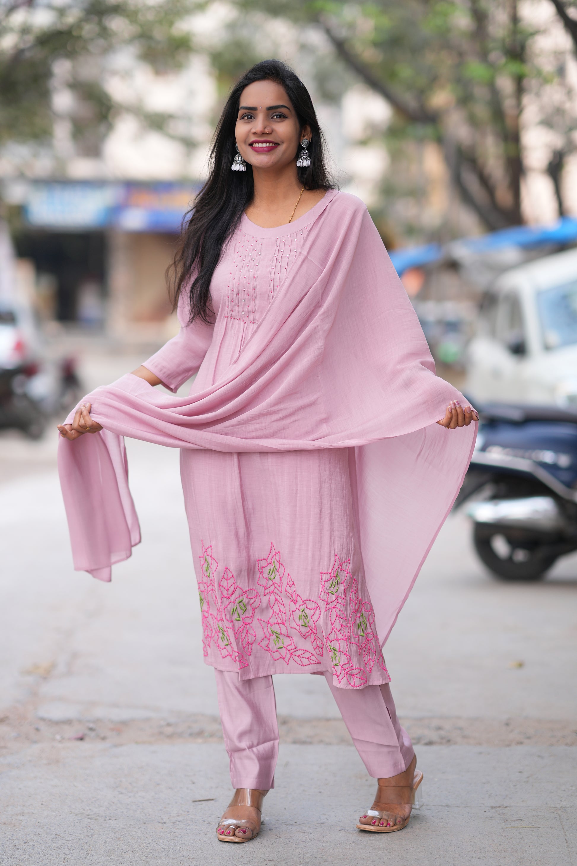 Pink Color Mul Chandheri Designer 3 Piece Set With Lining Elevate your ethnic wardrobe with this exquisite three-piece ensemble crafted from premium mul chandheri fabric. The soft, breathable material drapes beautifully while maintaining its structure, making it ideal for both casual gatherings and formal occasions. This designer set features intricate detailing and comes fully lined for comfort and durability. The delicate pink hue complements all skin tones and pairs effortlessly with traditional or contemporary accessories. Perfect for festive celebrations, weddings, or everyday elegance, this versatile set combines timeless craftsmanship with modern sensibility.