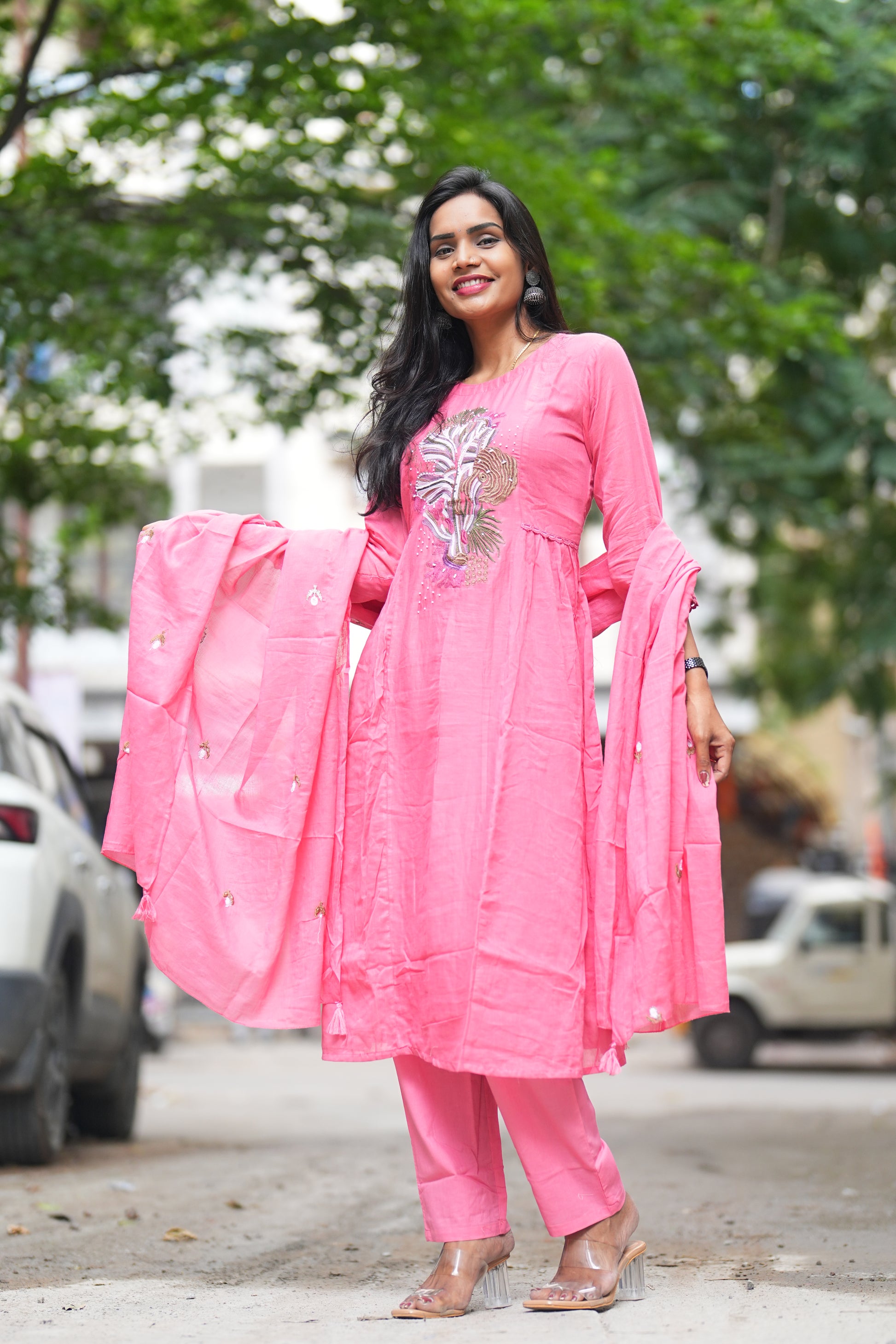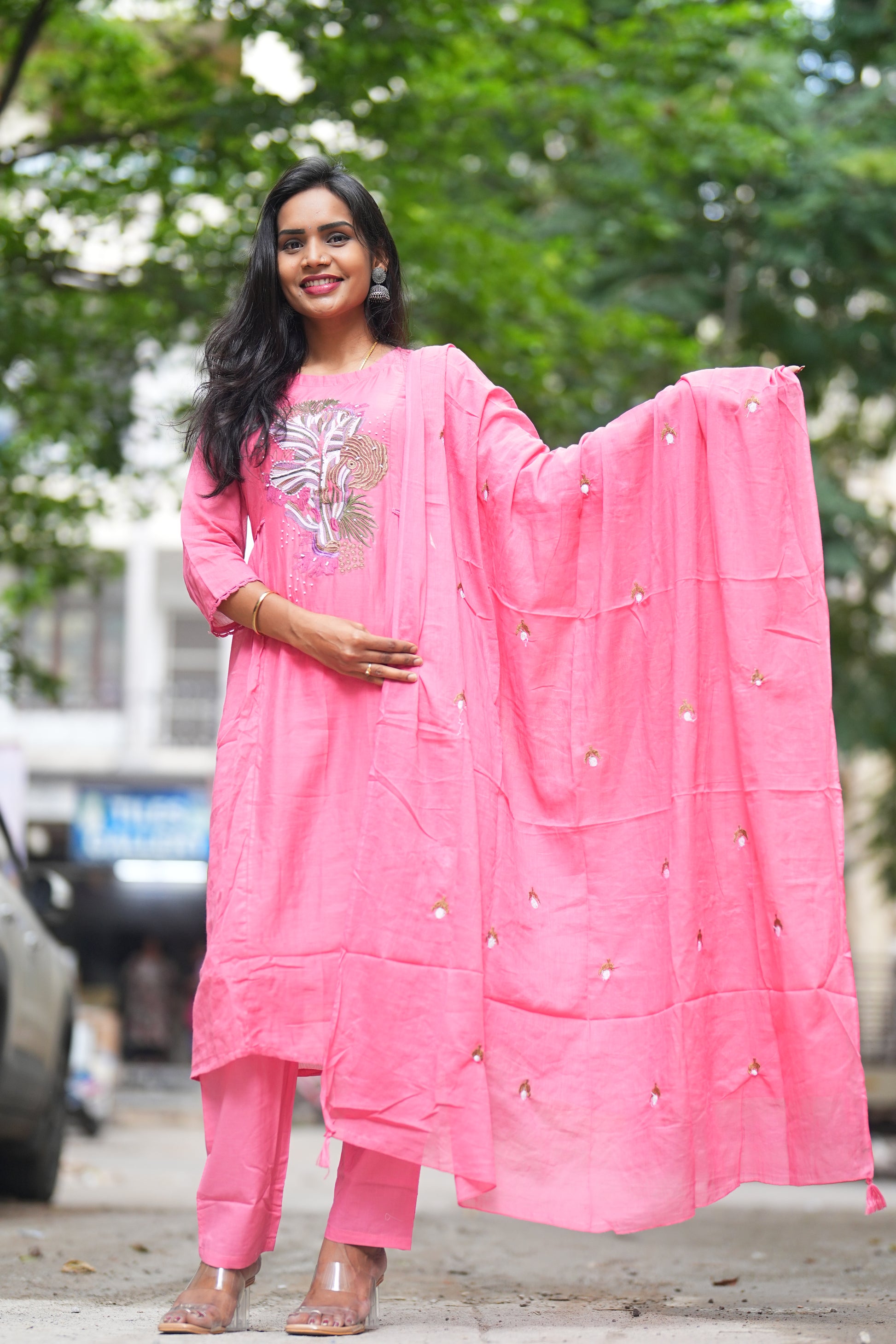 Pink Color Pure Mul Cotton Embroidery Design 3 Piece Set With Complete Lining