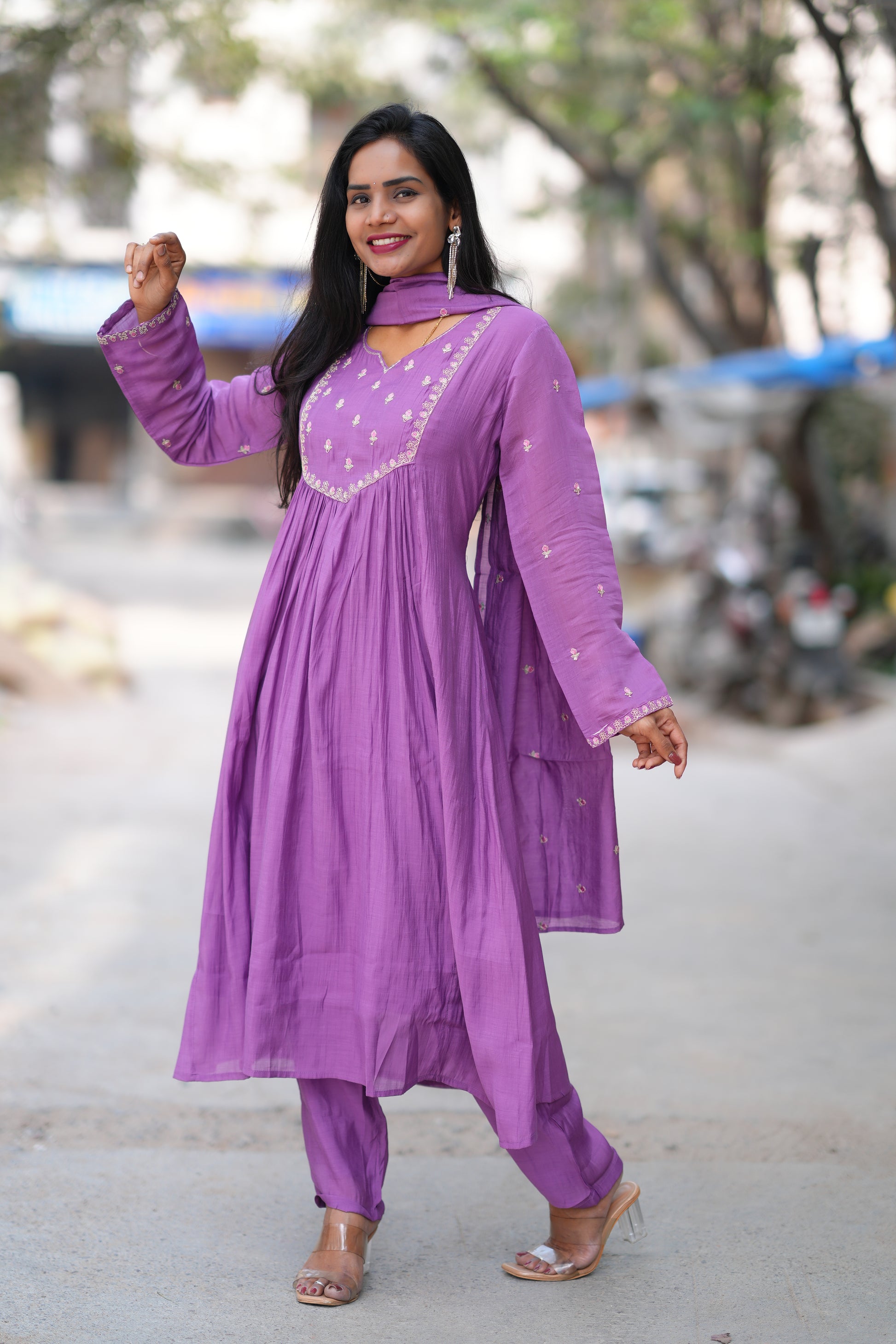 Purple Color Mul Chanderi Designer 3 Piece Set With Lining