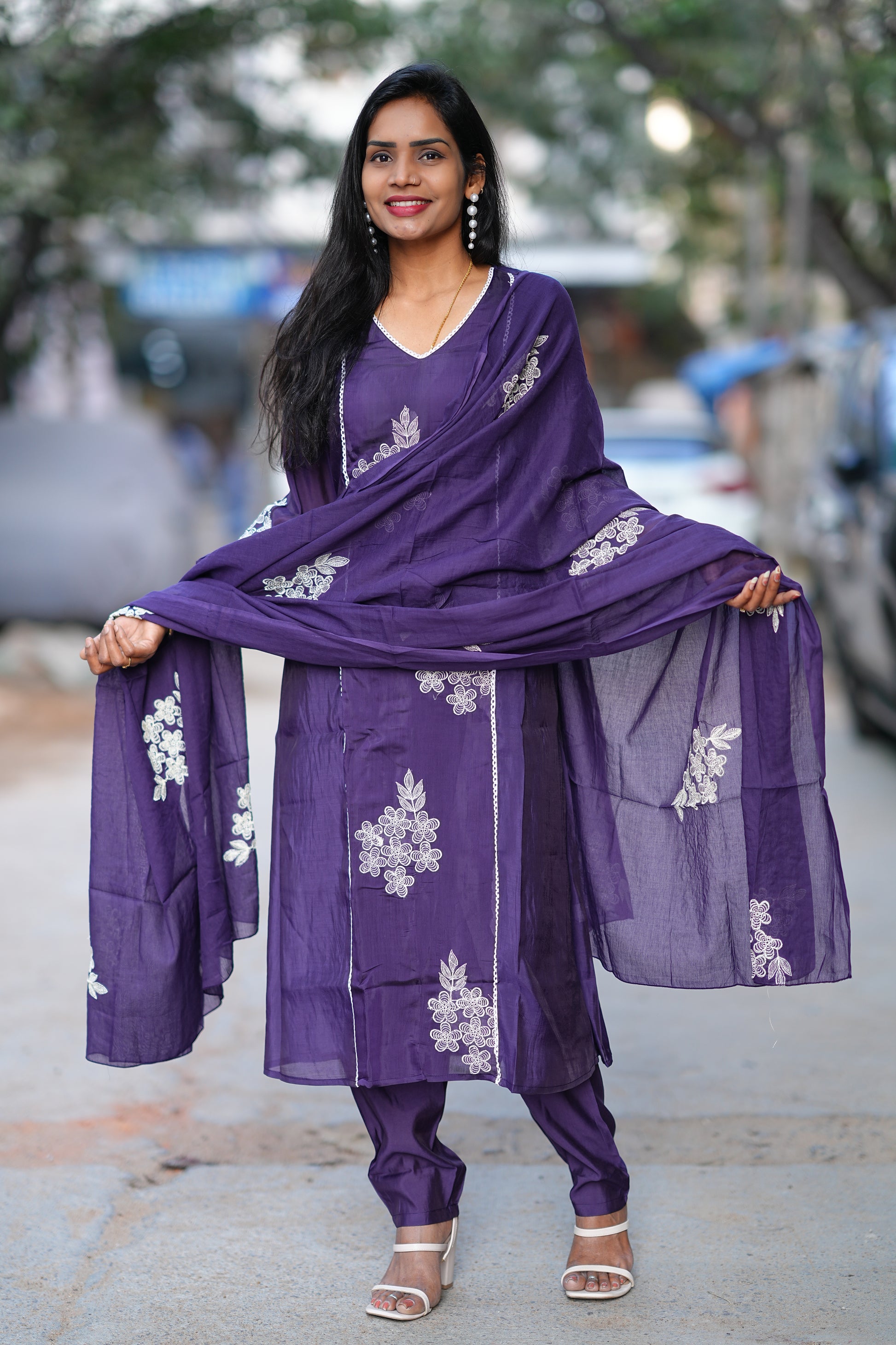 Purple Color Premium Mul Chanderi Festive 3-Piece Embroidered Set with Full Lining