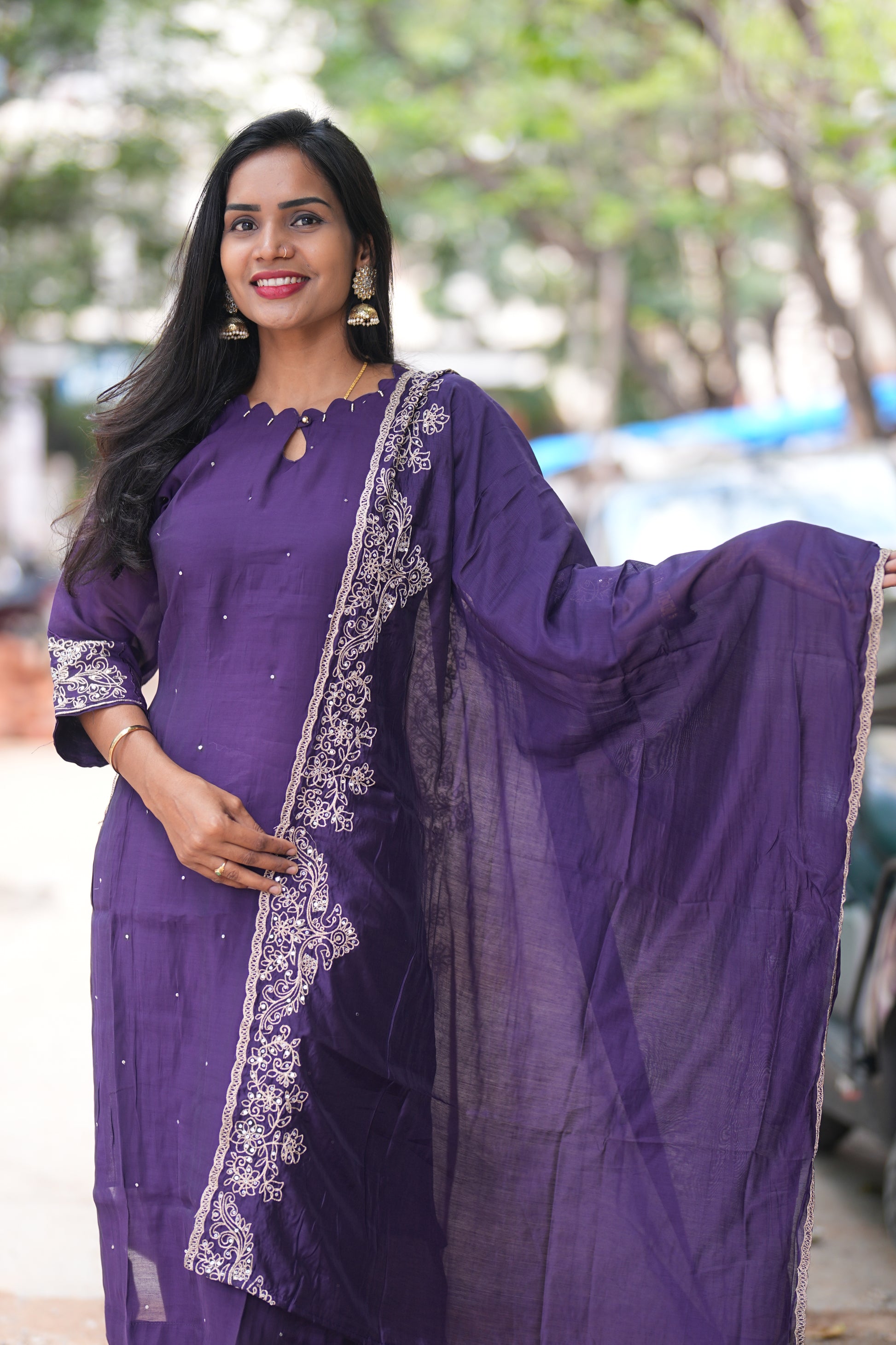 Purple Mul Chandheri Designer Wear 3 Piece Set