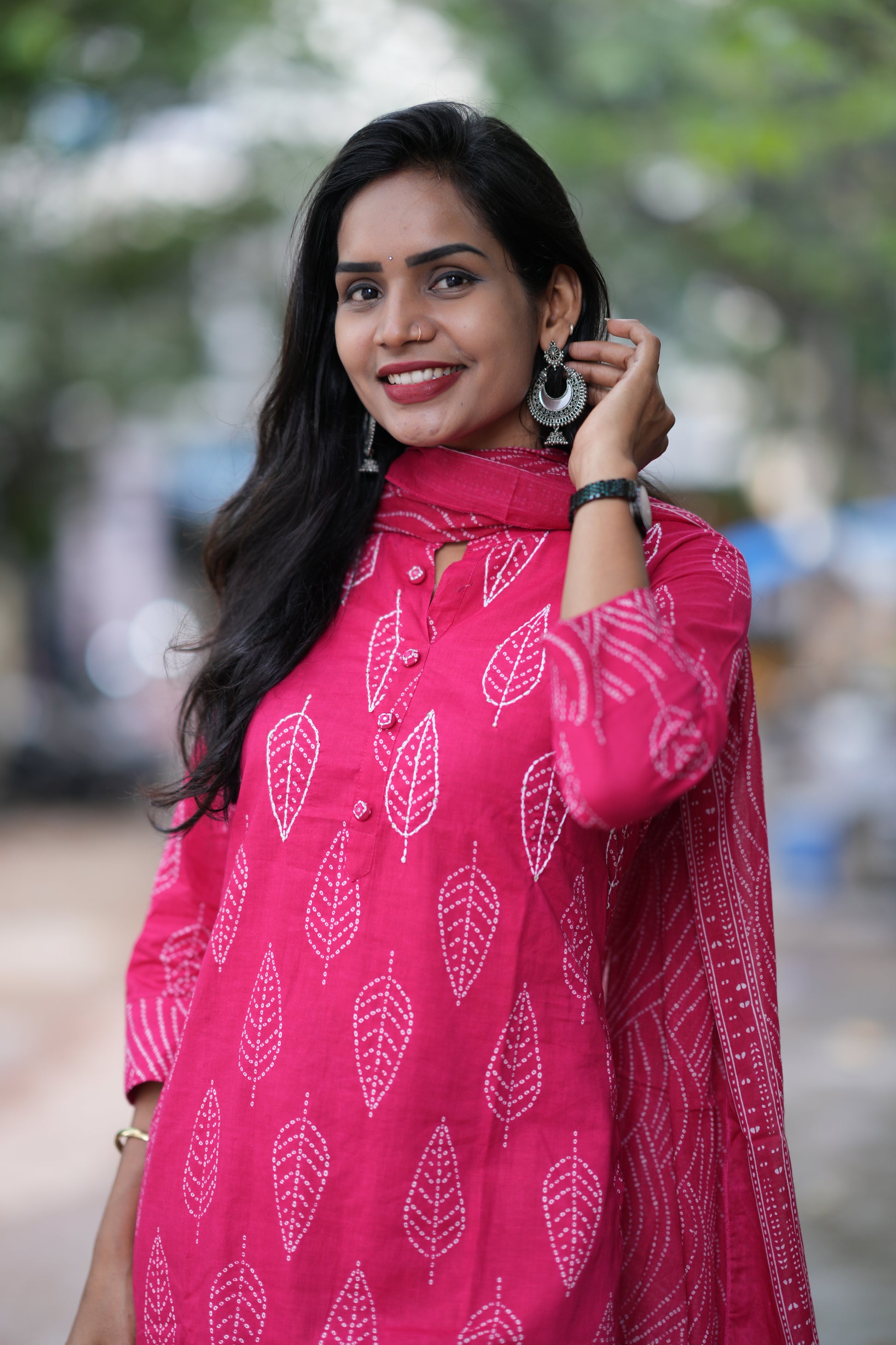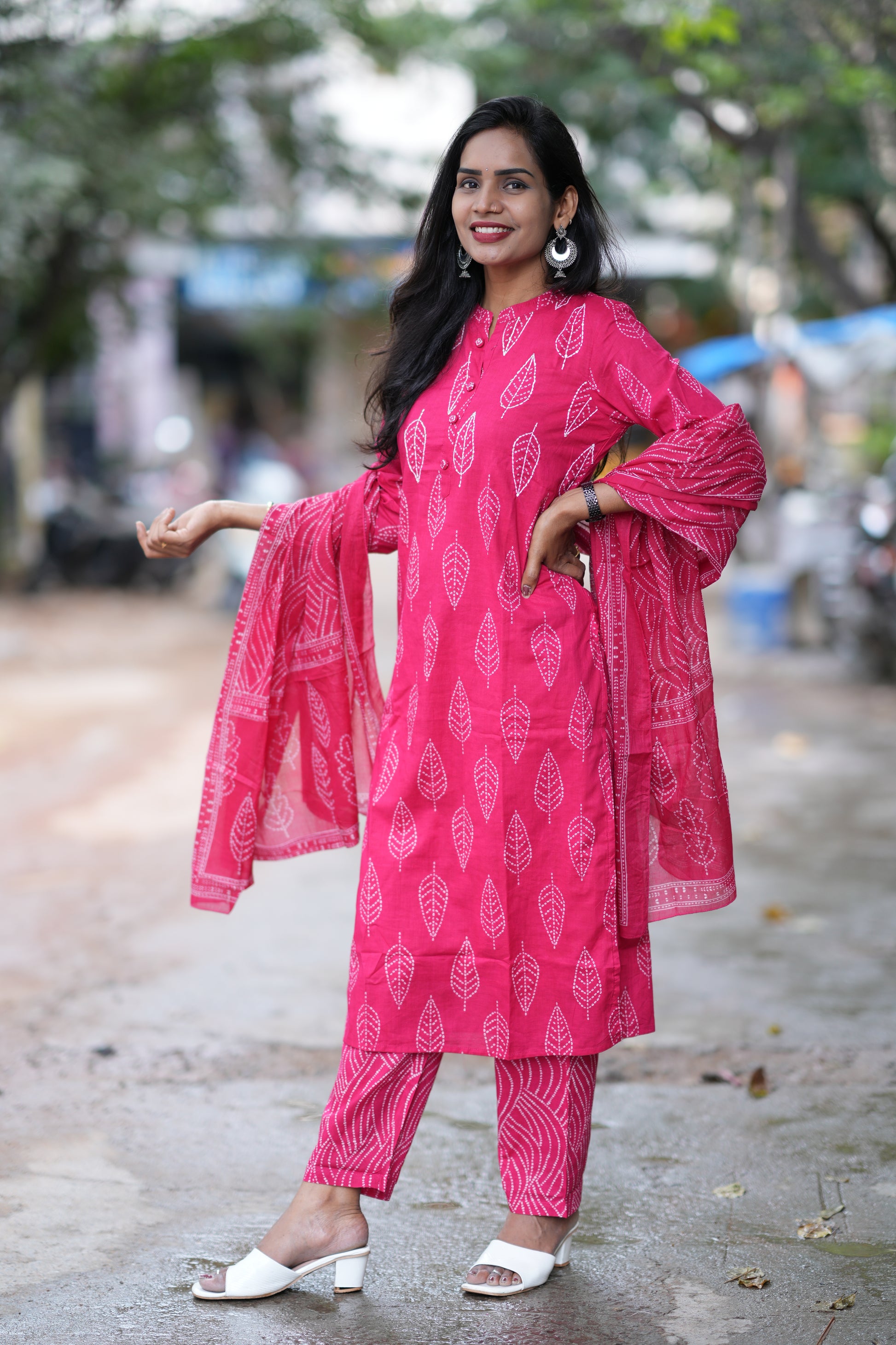 Rani Pink Color Jaipuri Cotton 3 Piece Set With Kantha Work and Complete Lining