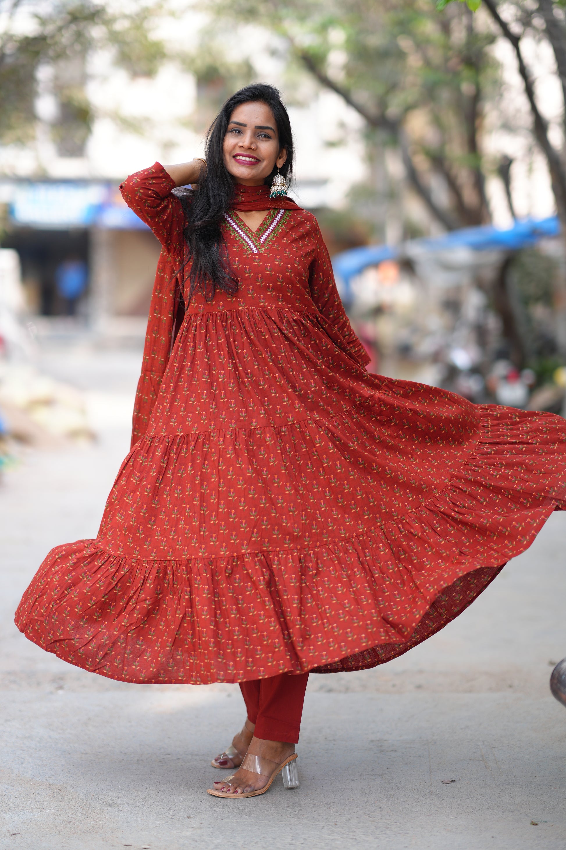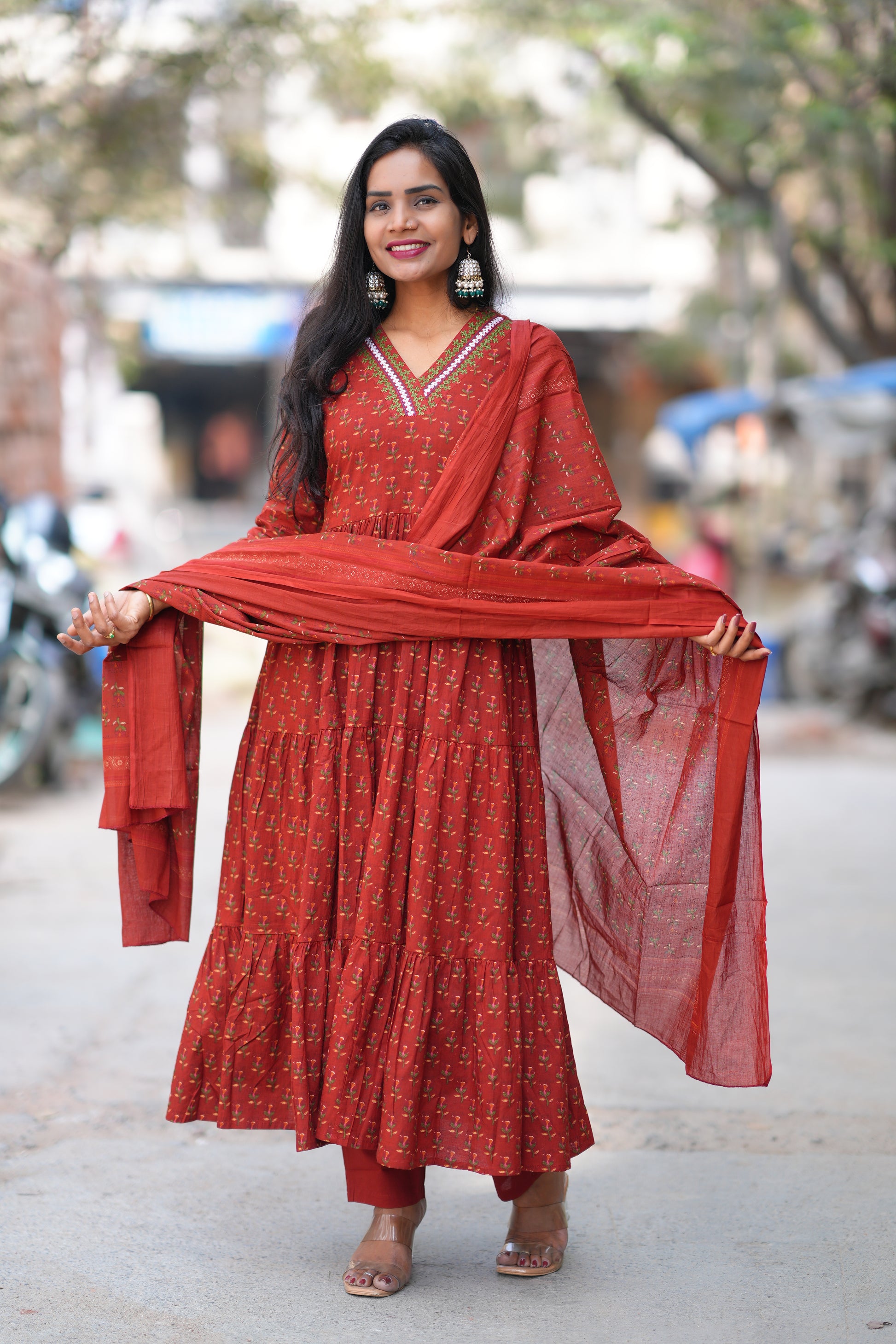 Red Color Jaipur Cotton Anarkali 3 Piece Set With Complete Lining