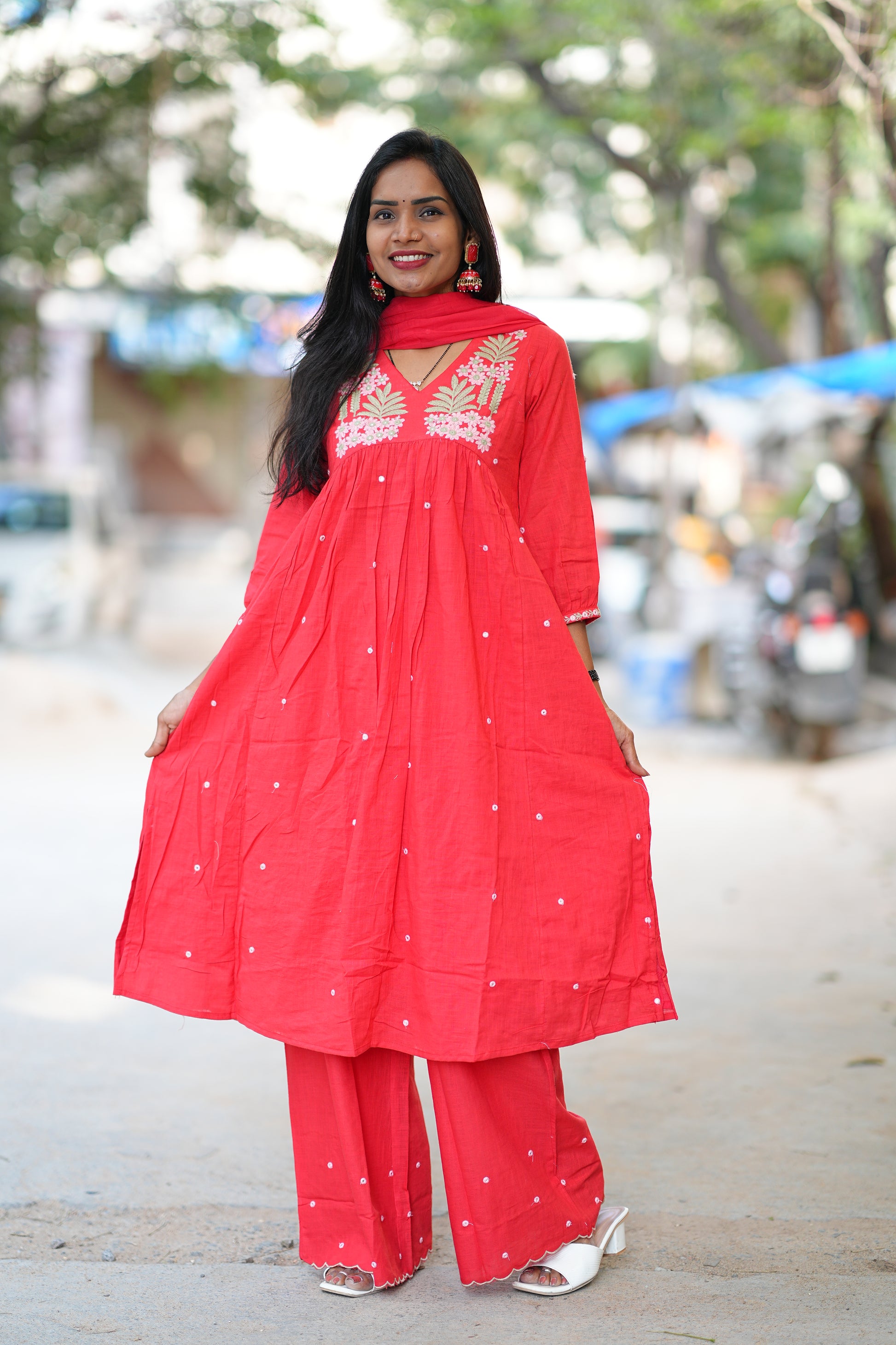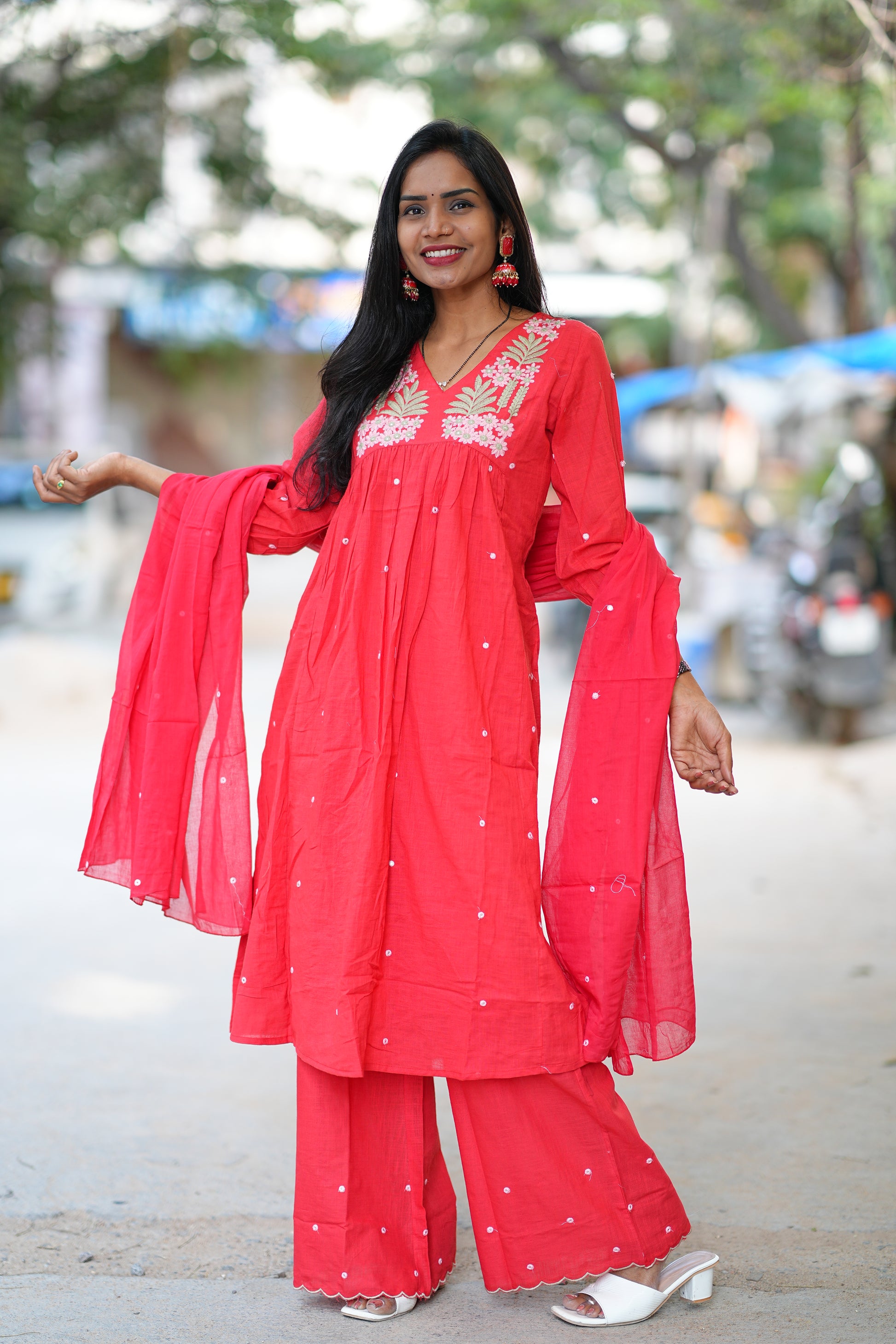 Red Color Jaipuri Slub Cotton 3 Piece Set With Palazzo Pant and Full Lining