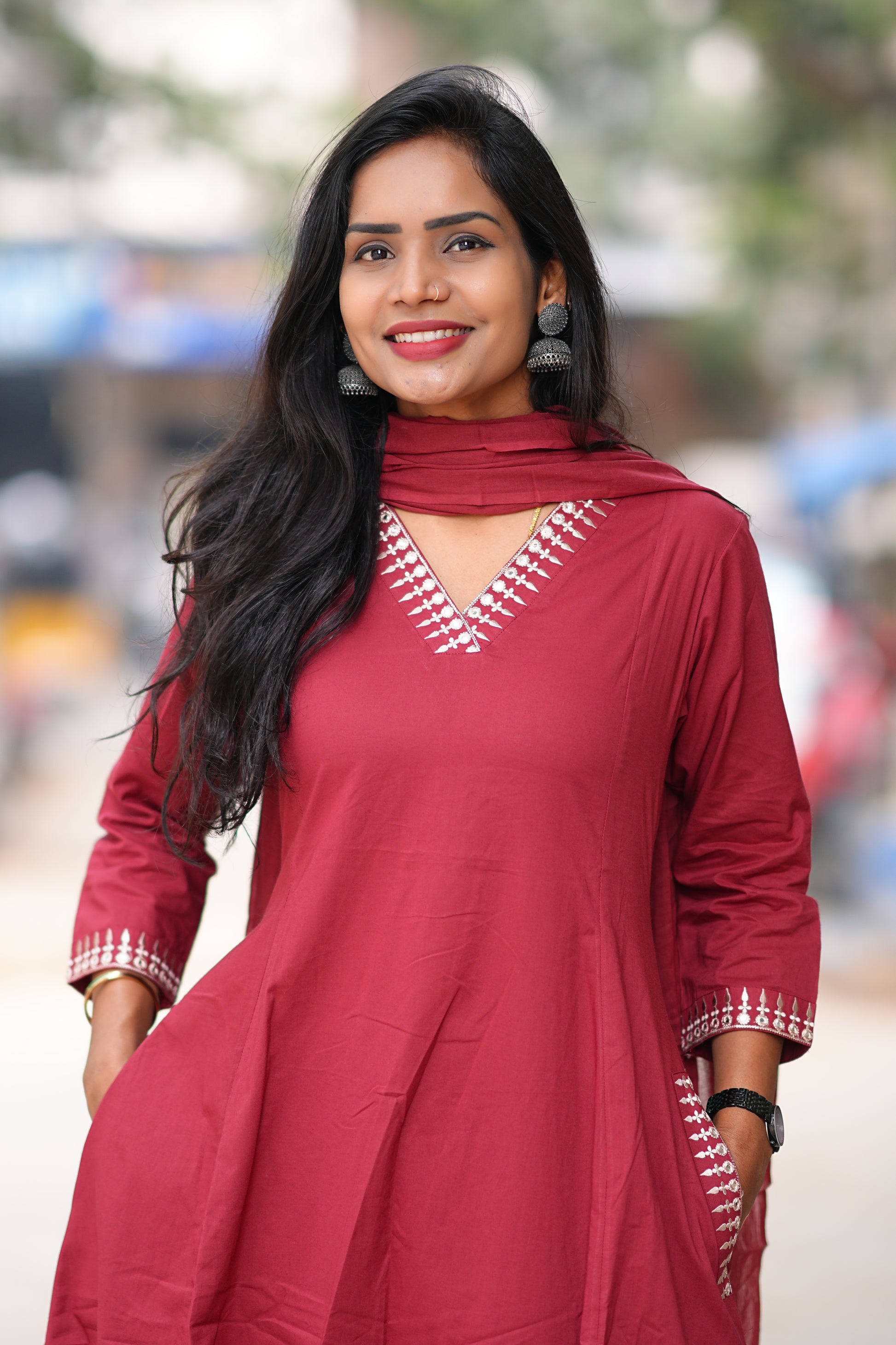Elevate your wardrobe with this sophisticated red three-piece ensemble crafted from premium 92.5 Jaipur cotton. Designed for plus-size comfort, the flattering A-line silhouette drapes beautifully while providing ease of movement. This versatile set combines traditional craftsmanship with contemporary styling, making it ideal for both casual gatherings and festive occasions. The breathable cotton fabric ensures all-day comfort in warm climates, while the rich red hue adds timeless elegance to your collection. Perfect for those seeking quality, comfort, and refined style in one complete set.