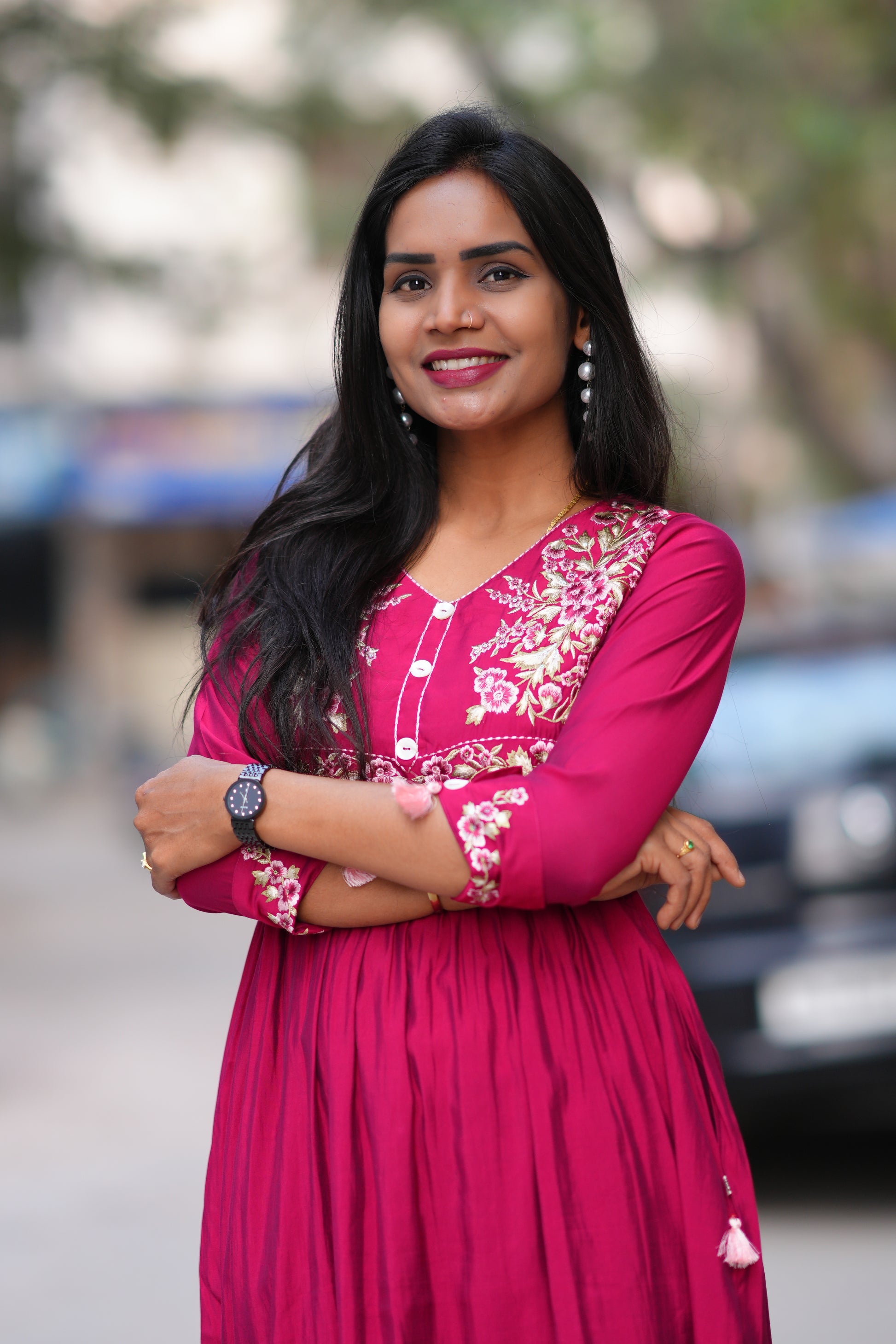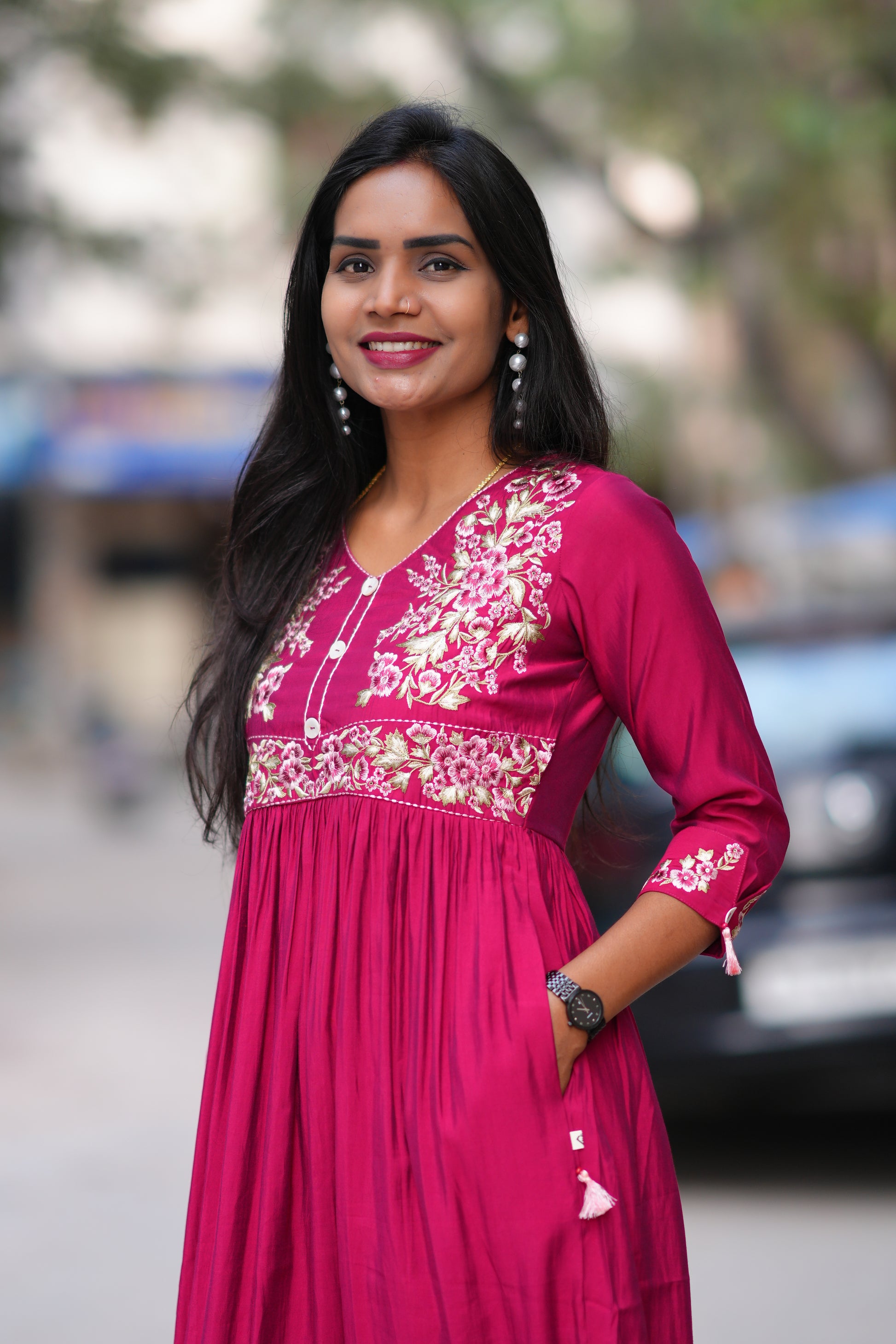Elevate your ethnic wardrobe with this stunning maroon long frock, crafted from premium viscose fabric that drapes beautifully and offers exceptional comfort throughout the day. The intricate embroidery work adds a touch of sophistication and traditional elegance, making it perfect for festive occasions, celebrations, or refined everyday wear. The rich maroon hue complements a variety of skin tones, while the flowing silhouette flatters all body types. Viscose's natural breathability ensures you stay cool and comfortable, even during extended wear. An ideal choice for those seeking timeless style with meticulous craftsmanship.