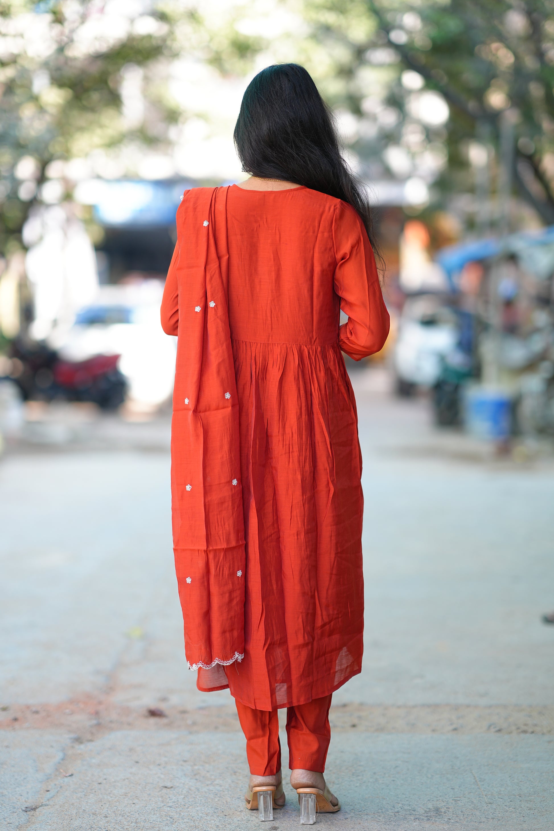 Red Mul Chanderi Designer Festive Wear 3 Piece Set Elevate your festive wardrobe with this exquisite three-piece ensemble crafted from premium mul Chanderi fabric. Known for its lightweight drape and subtle sheen, Chanderi weave offers the perfect balance of comfort and sophistication for celebrations. This designer set features coordinated pieces that work seamlessly together, allowing you to create a polished, cohesive look with minimal effort. The rich red hue commands attention while remaining versatile enough to complement traditional jewelry and accessories. Ideal for weddings, festivals, and special occasions, this collection piece combines timeless craftsmanship with contemporary design sensibilities.